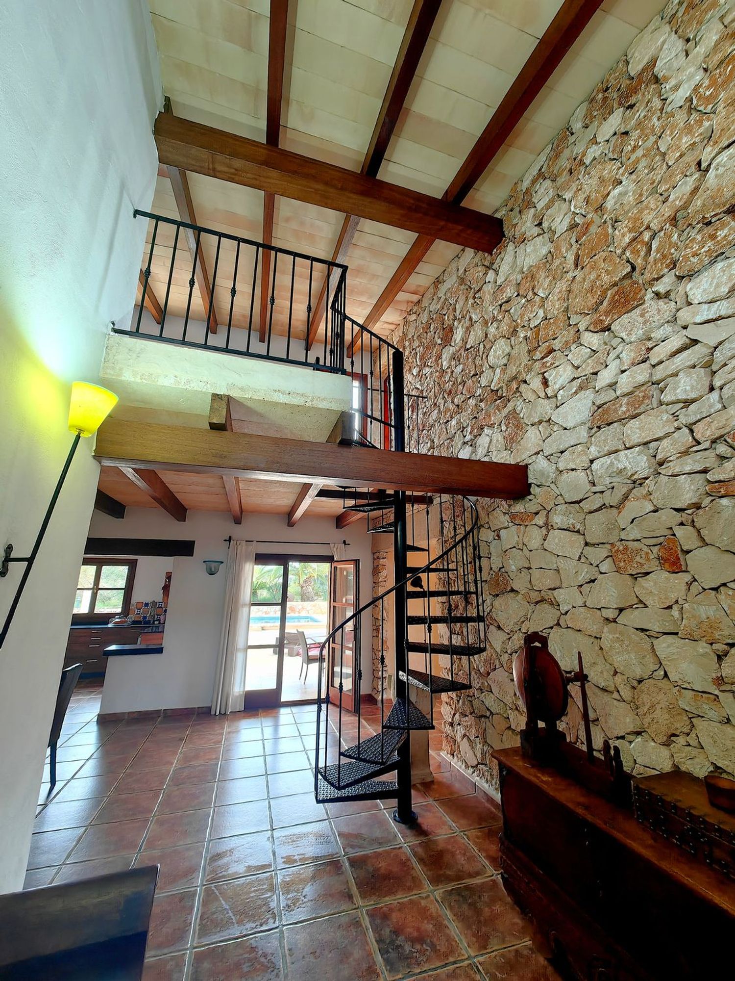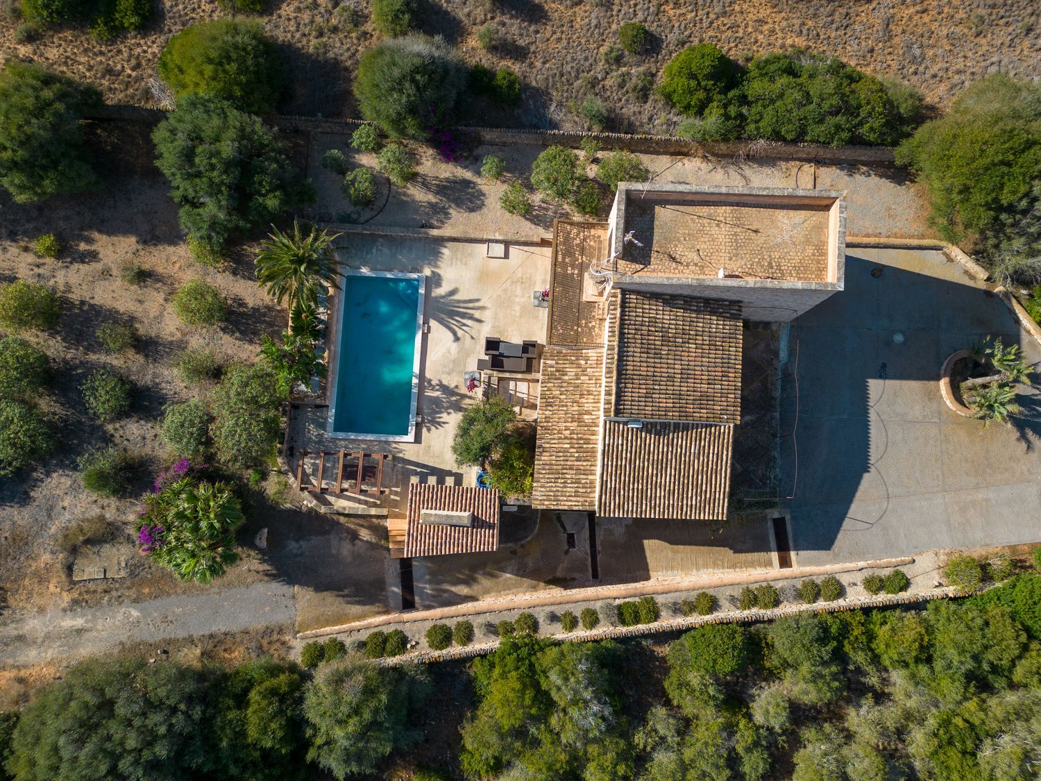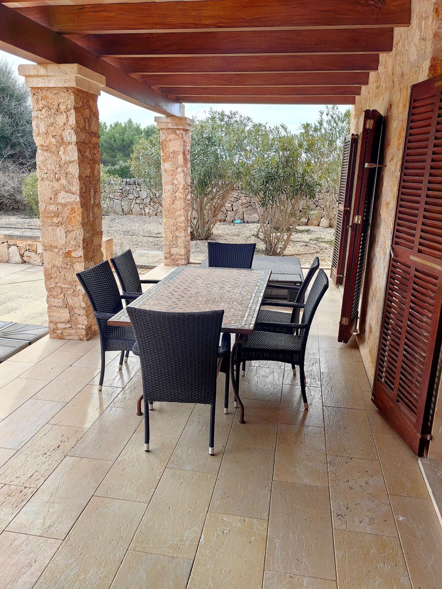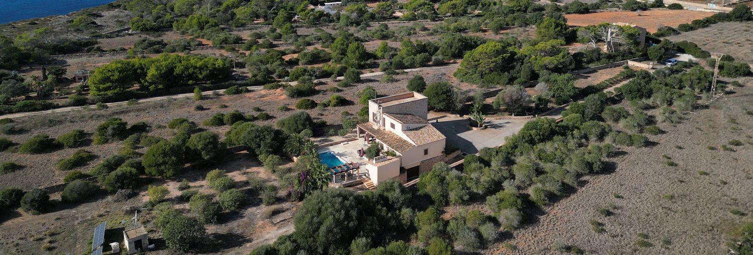 À l'étage, une superficie de 85 mètres carrés abrite un bureau ainsi qu'une chambre principale en suite, offrant une vue panoramique sur l'île de Cabrera. L'extérieur de la propriété est tout aussi remarquable, avec une terrasse de 200 mètres carrés qui comprend un ravissant porche, une cuisine extérieure, un solarium et une piscine de 10 x 5 mètres.