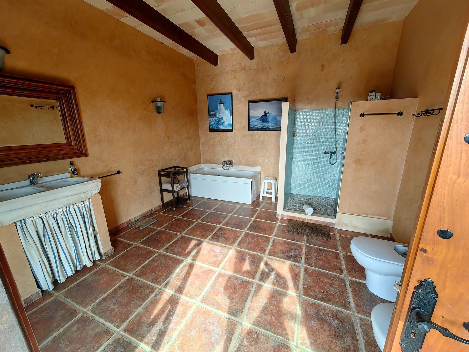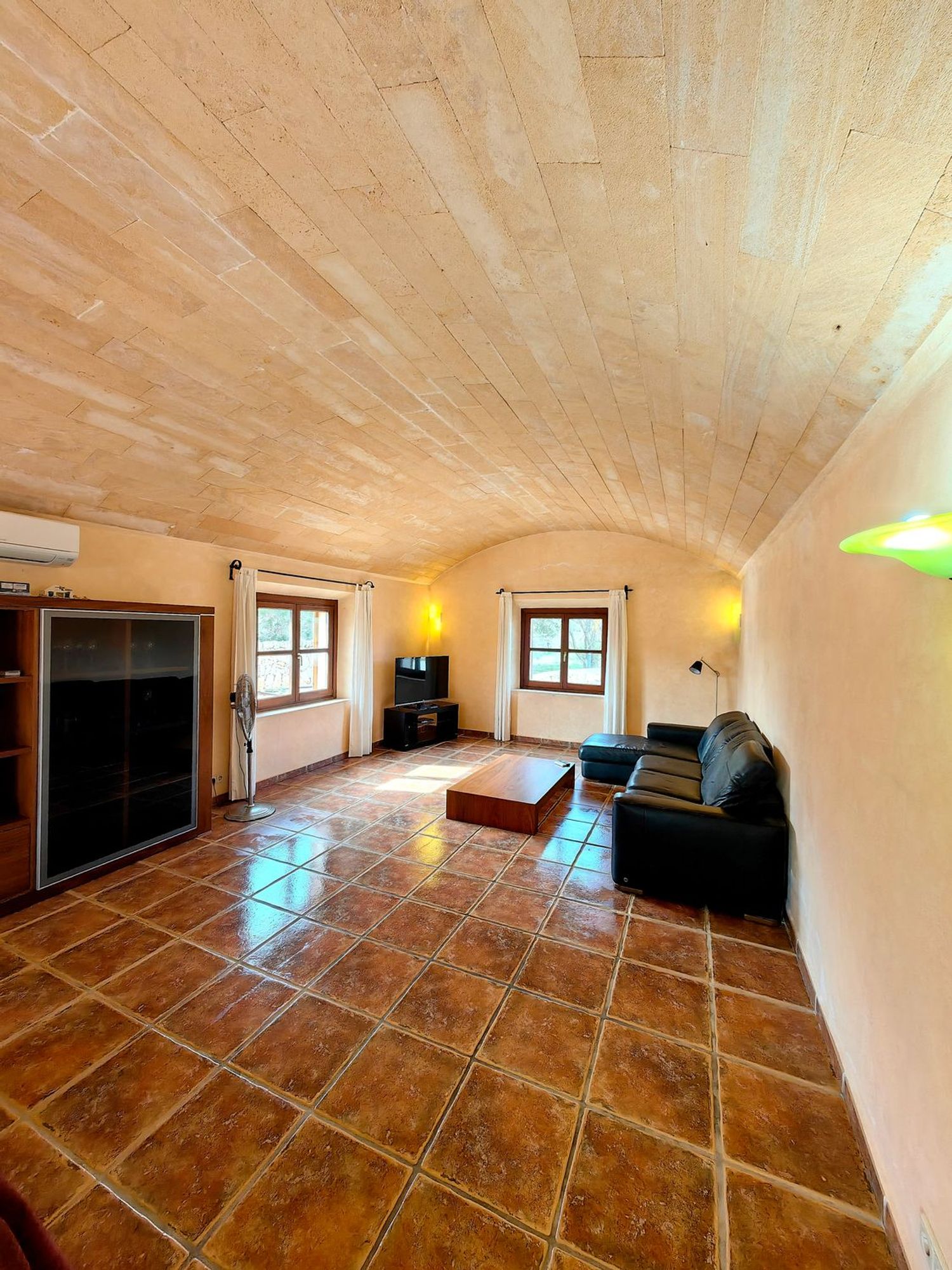 La propriété s'étend sur un terrain de 12 000 mètres carrés, agrémenté de magnifiques jardins méditerranéens bien consolidés. Son sous-sol spacieux de 120 mètres carrés sert de garage. Le rez-de-chaussée, couvrant une superficie de 180 mètres carrés, comporte deux chambres confortables, deux salles de bain, une buanderie, un grand salon et une cuisine spacieuse. La salle principale, impressionnante par son plafond en voûte naturelle de Marés, apporte harmonie et élégance à l'espace de vie.