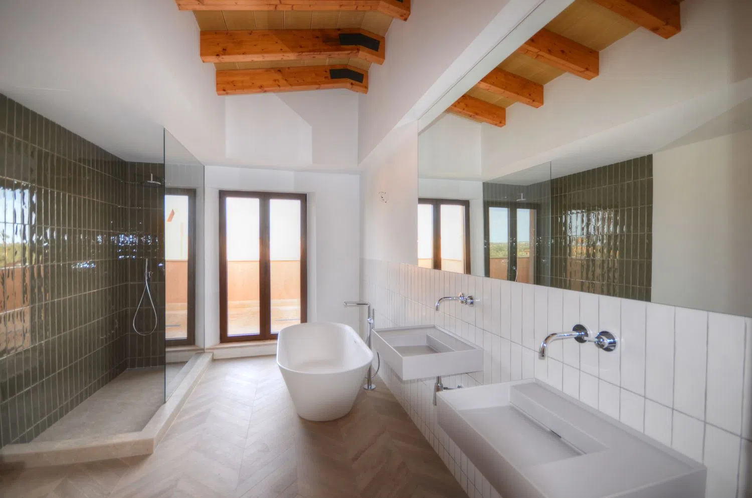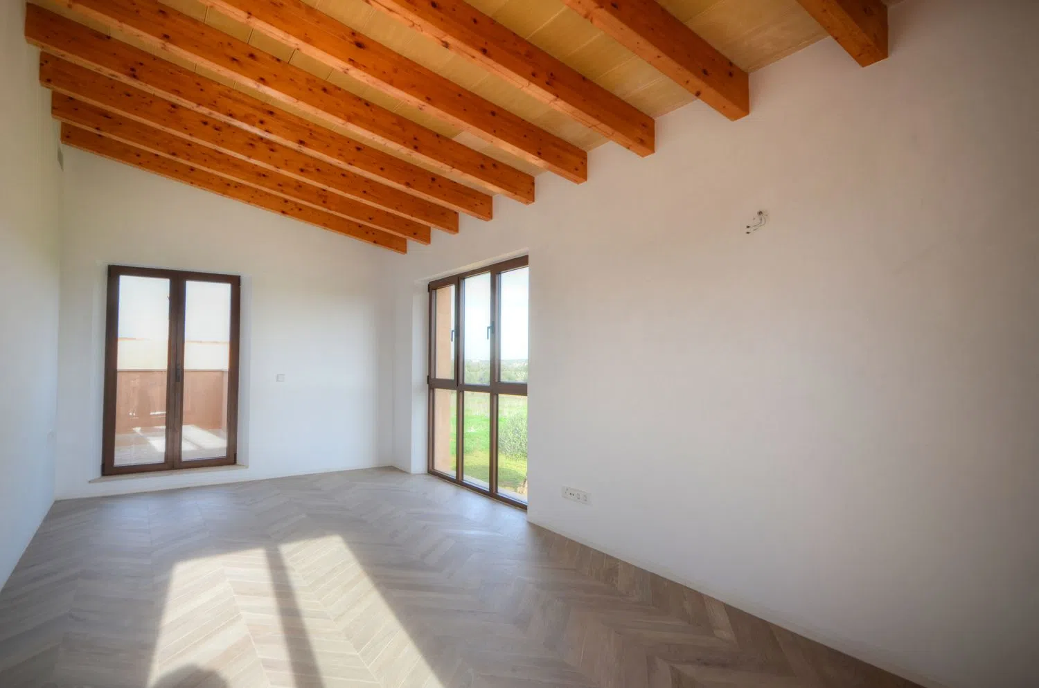 La vedette de l'étage est la chambre principale, qui dispose de deux terrasses solarium privées et offre une vue magnifique sur la campagne. Dotée de spacieux placards encastrés et d'une salle de bain en suite élégante avec douche et baignoire, elle constitue un véritable sanctuaire.