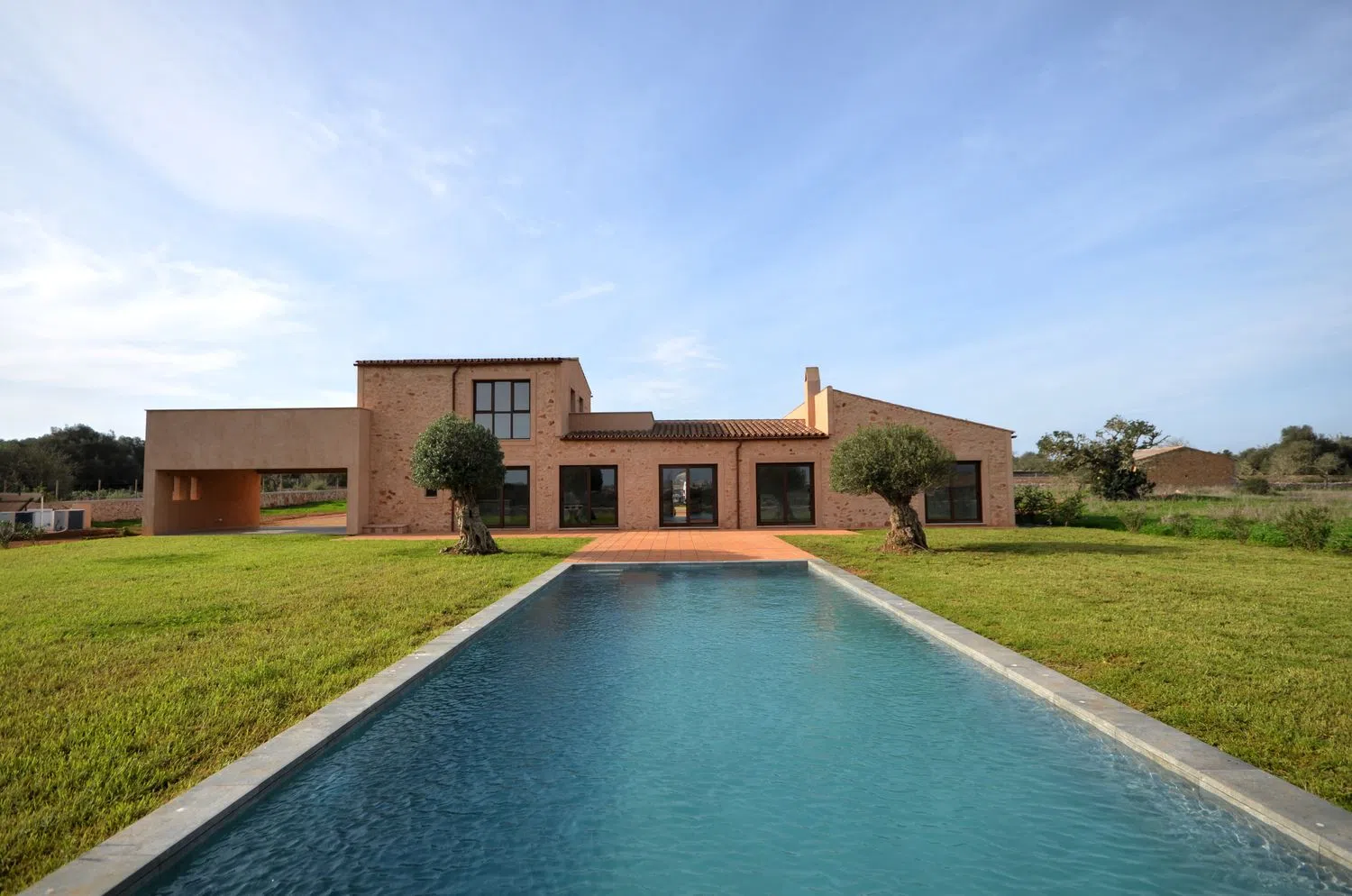 Cette somptueuse propriété s'étend sur une vaste parcelle d'environ 19 533 m² et offre une surface construite d'environ 454 m². L'entrée spacieuse et son vestiaire pratique impressionnent avec une majestueuse porte en bois. À l'avant, le salon lumineux propose une vue dégagée sur la piscine et les paysages pittoresques de Santanyí grâce à de grandes baies vitrées. À côté du salon, une cuisine ouverte accompagne un vaste espace repas. Depuis cet endroit, on accède à la buanderie et à la terrasse couverte qui offre un espace extérieur supplémentaire.