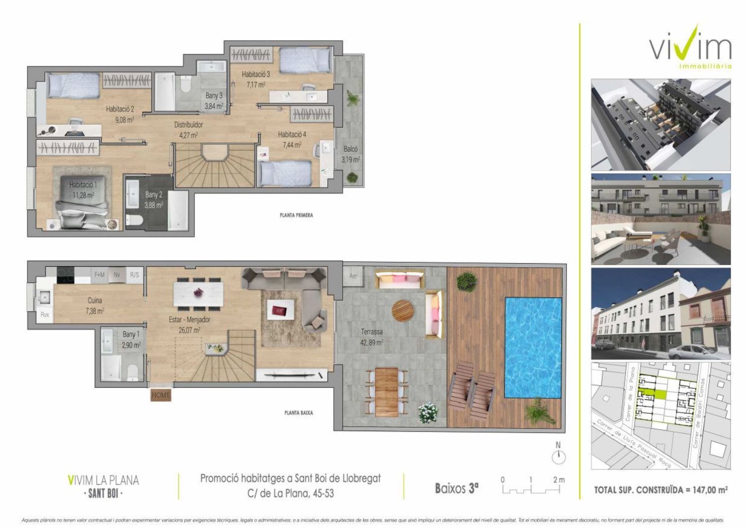 Residencial la Plana, situado en la zona centro de Sant Boi de llobregat, plantas bajas duplex con piscina propia, entrada independiente, áticos duplex con terraza, parquings opcionales. Obra nueva con acabados modernos y sostenibles, domótica, parquet, aerotermia, ventanas aluminio, etc. Ubicada junto a colegios, supermercados, centros deportivos, zona comercial, centros asistenciales, ferrocarril, autobus.