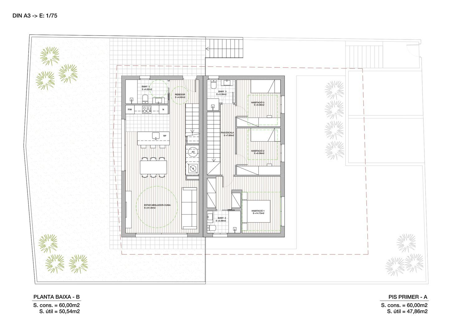 RESIDENCIAL GRECIA, es una promoción en comercialización y próxima a fase de construcción de obra nueva que HG ECOFLAT pone a su disposición en Can Parellada, Terrassa.En esta ocasión, HG ECOFLAT apuesta por la promoción en exclusiva de 2 casas de obra nueva en una ubicación excepcional y perfectamente orientadas para aprovechar al máximo los recursos naturales según las diferentes orientaciones, ofreciendo una calificación de eficiencia energética A*, la más elevada de confort y ahorro energético y siguiendo todas las pautas para ofrecer unas viviendas con los standars de calidad passive house.El proyecto destaca por su aire mediterráneo y cúbico con cubiertas planas. Viviendas pensadas para ser vividas durante todo el año, pero dándole mucha importancia al clima de la zona y a la vida en el exterior. La relación entre el jardín y el interior es uno de los puntos clave de este diseño arquitectónico.Las 2 casas se construirán sobra una parcela de 450m2 y con una superficie construida por vivienda de 120m2 más una zona de acceso privada para el descanso de los coches.DESCRIPCIÓN DE LA VIVIENDALas viviendas estarán formadas por 2 plantas aprovechando el máximo de sol desde la primera hora de la mañana a la última de la tarde.La planta baja contará con 60 m2 construidos. Accedemos por la puerta principal y entramos a la vivienda a una zona de recibidor, con un baño de cortesía anexo y las escaleras de acceso a la planta superior. A continuación, encontramos una gran zona diáfana y con mucha luz donde ubicamos la zona de cocina con una gran isla central y posteriormente la zona de comedor y sala de estar todo ello con vistas a la zona exterior. Podremos acceder al jardín desde todos los grandes ventanales de planta baja, fusionando el interior y el exterior de la vivienda en un único ambiente.En planta primera, dispondremos de 60 m2 y estará formada por tres habitaciones dobles y un baño completo y una habitación doble en suite.Destacamos el amplio jardín con vegetación mediterránea.ACABADOSEntre los acabados de la vivienda, todos ellos de primeras calidades, destacamos en el exterior, la totalidad de la fachada revestida en SATE color claro. La carpintería exterior de aluminio con Rotura de Puente Térmico y Acústico en acabado texturizado y persianas con guía central motorizada en todas sus unidades.Una vez en el interior, los pavimentos serán mediante parquet laminado AC5 de gran formato. Los baños y aseo se revestirán con gres porcelánico. Para el confort encontramos un sistema de Aerotermia para ACS, calefacción mediante suelo radiante, aire frío y aire caliente mediante conductos ocultos. Las puertas y zócalos irán lacados en blanco mate, así como todos los armarios que irán empotrados con la estructura incorporada.El despacho de arquitectura HG ARQUITECTURA, ha sido el encargado de desarrollar esta promoción con la finalidad de combinar un diseño actual i funcional para cumplir con las necesidades del día a día. HG ARQUITECTURA es un despacho de arquitectura e interiorismo que se caracteriza por la personalización de todos sus proyectos, el detalle en la resolución técnica y en el perfeccionismo en todo el proceso de construcción en cada uno de sus proyectos.HG ECOFLAT es la empresa que realizará la construcción del residencial. HG ECOFLAT t tiene el compromiso de construir de la manera más eficiente posible en todas sus promociones, buscando el máximo de equilibrio con el medioambiente y con materiales de proximidad a la zona de construcción, minimizando las emisiones de CO2. Nuestro objetivo es realizar en cada nueva promoción casas cada vez más eco eficientes.