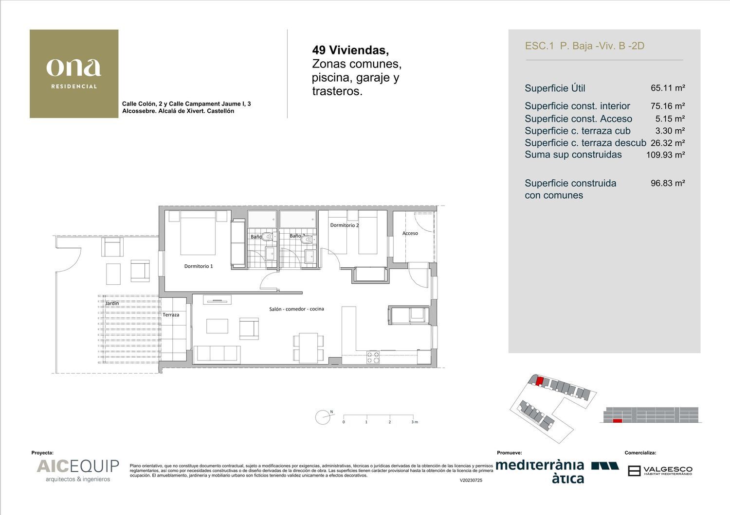 Hay un lugar bañado por el Mediterráneo. Un lugar rodeado de espacios naturales, playas, calas, parques protegidos y vestigios históricos. Un destino donde vivir con sosiego, ajeno al ruido y la masificación. Este lugar es Alcossebre. Ona es un residencial junto al mar rodeado de todos los servicios y alternativas culturales y de ocio. Situado entre las calles Colón, Ausias March y Campament Juame I, hemos proyectado un complejo residencial donde disfrutar plácidamente del ambiente mediterráneo durante todo el año. Un emplazamiento privilegiado, que se envuelve de la tranquilidad de la zona sin renunciar a todos los servicios del núcleo urbano de Alcossebre. Ona Residencial se compone de 49 viviendas de dos y tres dormitorios, todas con plaza de aparcamiento y trastero (incluido en el precio). La mayoría de ellas cuenta con dos baños, uno de ellos en el dormitorio principal. Sus cocinas, equipadas, están abiertas al salón, el cual se prolonga hasta la terraza. Amplias áreas comunes con zonas ajardinadas y piscina, donde disfrutar de la serenidad que deseas y a solo tres minutos paseando de la Playa del Carregador, la playa de arena más amplia de Alcossebre.Un amplio espacio privado a solo tres minutos de las olas y las cristalinas aguas del mar de Alcossebre.