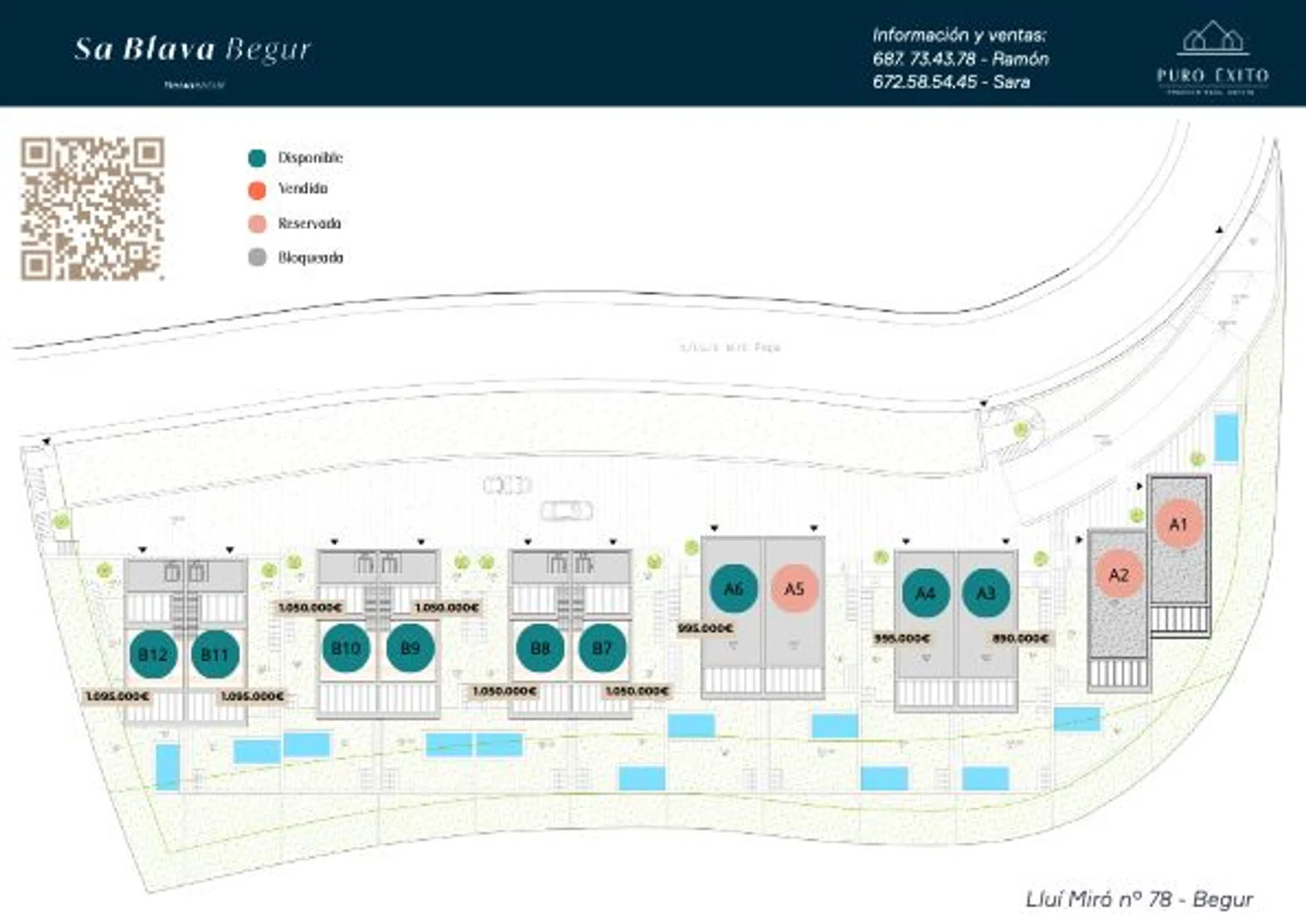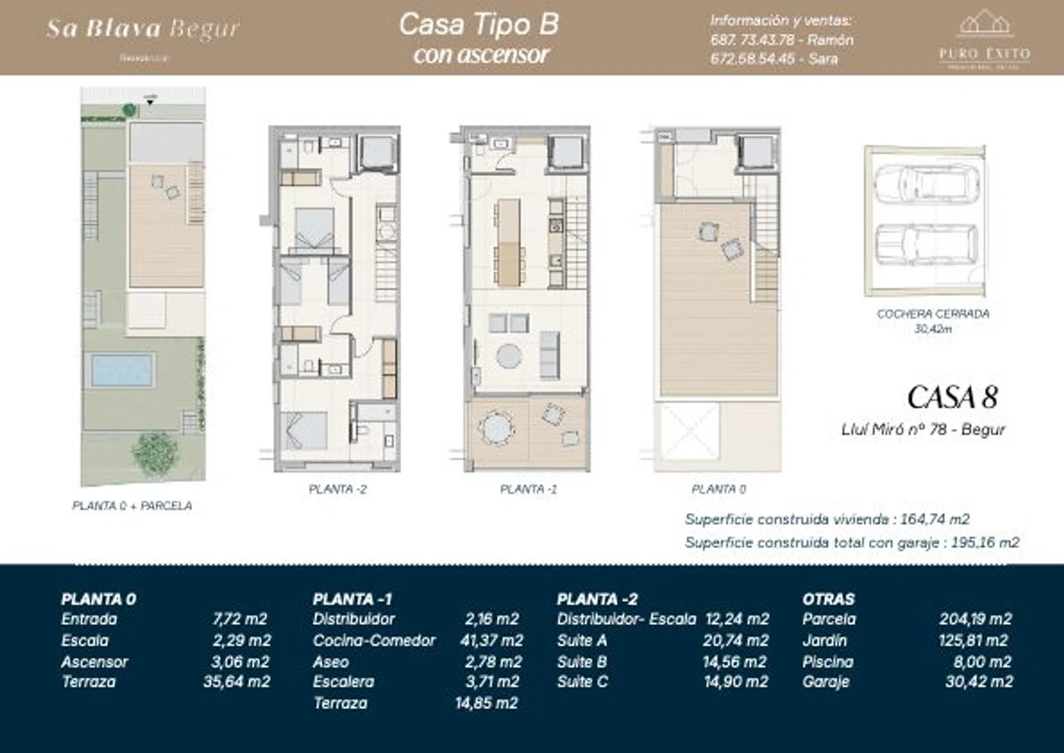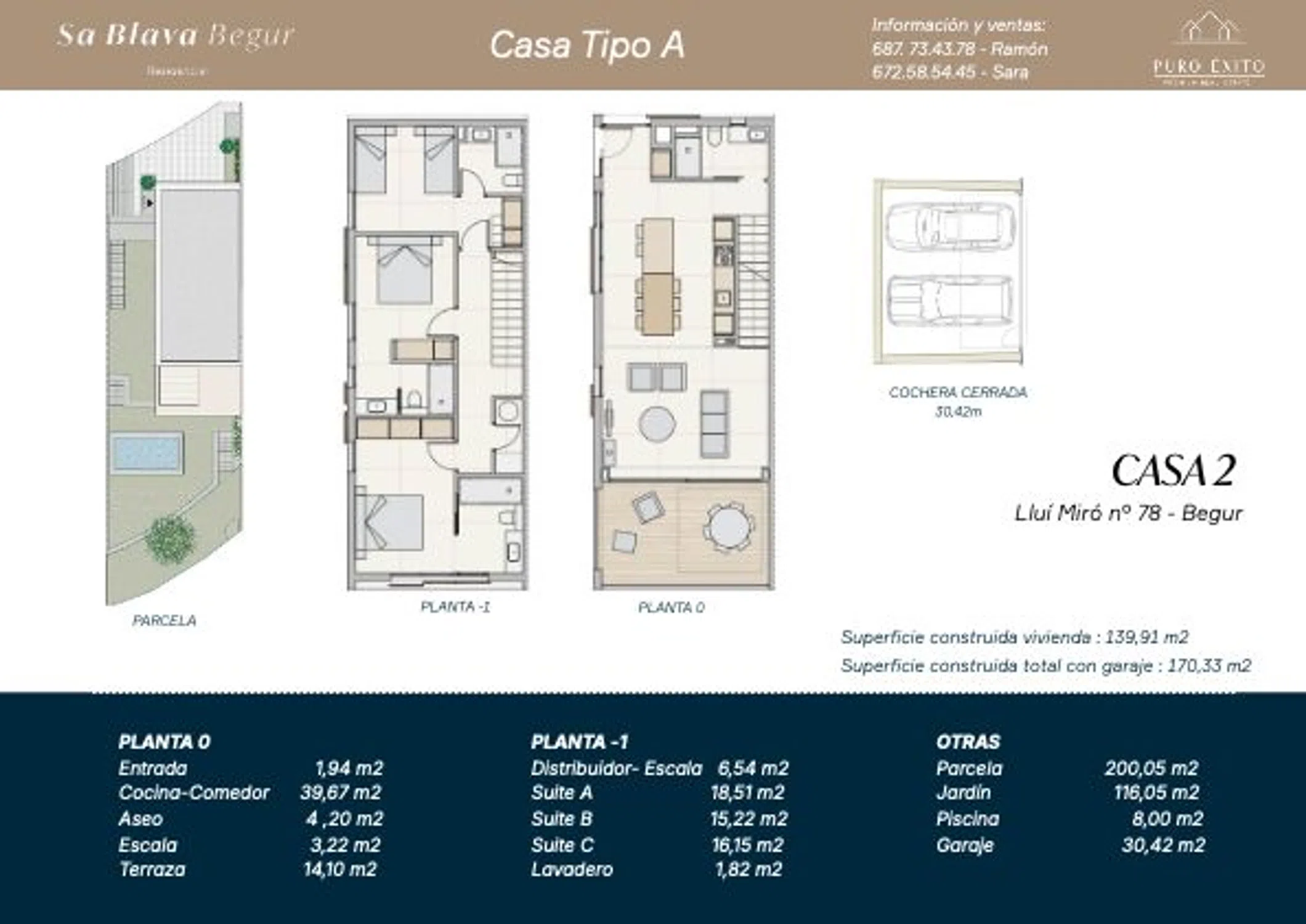 ✨ Sa Blava Begur – Casas de diseño con alma mediterránea y eficiencia A Bienvenido a Sa Blava, un exclusivo conjunto de 12 viviendas unifamiliares en la zona más tranquila y codiciada de Begur, donde el diseño contemporáneo, la sostenibilidad y la calidad de vida se encuentran en perfecta armonía. Una propiedad de alto standing que lo tiene todo: espacios amplios, privacidad, acabados de primera, garaje privado para dos coches, cargador de coche, piscina privada y acceso directo al centro del pueblo por camino privado. Un hogar que marca la diferencia desde cada detalle. Diseño y distribución que inspiran - Superficie construida total: 170,33 m² - Vivienda: 139,91 m² | Garaje cerrado: 30,42 m² - Parcela privada con jardín escalonado y piscina individual - 3 habitaciones en suite, todas con salida directa al jardín - Cocina abierta de alta gama con comedor y acceso a la terraza y piscina - 4 baños en total (3 en suite + 1 baño completo de cortesía) - Garaje privado para dos coches con toma de carga de vehículo eléctrico Calidades superiores y diseño cuidado al detalle - Conjunto residencial cerrado con cámaras de seguridad - Acceso privado desde el jardín al centro de Begur mediante camino privado - Carpintería exterior en aluminio lacado negro con rotura de puente térmico - Vidrios de seguridad y bajo emisivos tipo climalit con control solar - Fachada con aislamiento SATE + revestimiento continuo + piedra natural de Begur - Persianas tipo mallorquina de madera técnica y aluminio - Puerta de entrada acristalada con cerradura de seguridad de 3 puntos - Pavimento porcelánico Boost Stone Ivory 60×120 cm (interior y exterior) - Cocina Dica Milano45 con electrodomésticos integrados - Platos de ducha invisibles, mamparas de seguridad y sanitarios D-Neo - Mobiliario de baño acabado en roble con espejo iluminado LED - Aerotermia con bomba de calor y climatización por conductos sectorizados - Iluminación LED empotrada + detectores de presencia en zonas de paso - Vídeo portero en ambas plantas - Preinstalación de fibra óptica y TV por satélite Ubicación privilegiada en Begur - A 150 m del centro del pueblo - Entorno natural y residencial - Cercano a calas, comercios y rutas naturales - Complejo con solo 6 agrupaciones pareadas (12 viviendas en total) Vivir en Sa Blava es conectar con el paisaje, la luz y el diseño inteligente. Solicita más información y asegura tu nueva vida en Begur.
