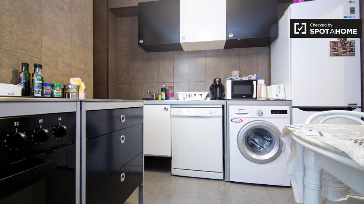 Des chambres sont disponibles à louer dans cet appartement de 5 chambres sur Calle Granados dans la paisible région d'Alcalá de Henares. La cuisine est entièrement équipée avec tout ce dont vous avez besoin pour cuisiner et a beaucoup d'espace au comptoir, permettant à plusieurs locataires de l'utiliser tout de suite. La propriété dispose d'un petit salon, avec des canapés et une télévision, où vous pourrez vous détendre et regarder un film et vous pouvez également accéder à un patio intérieur où vous pouvez sécher vos vêtements ou prendre de l'air frais.