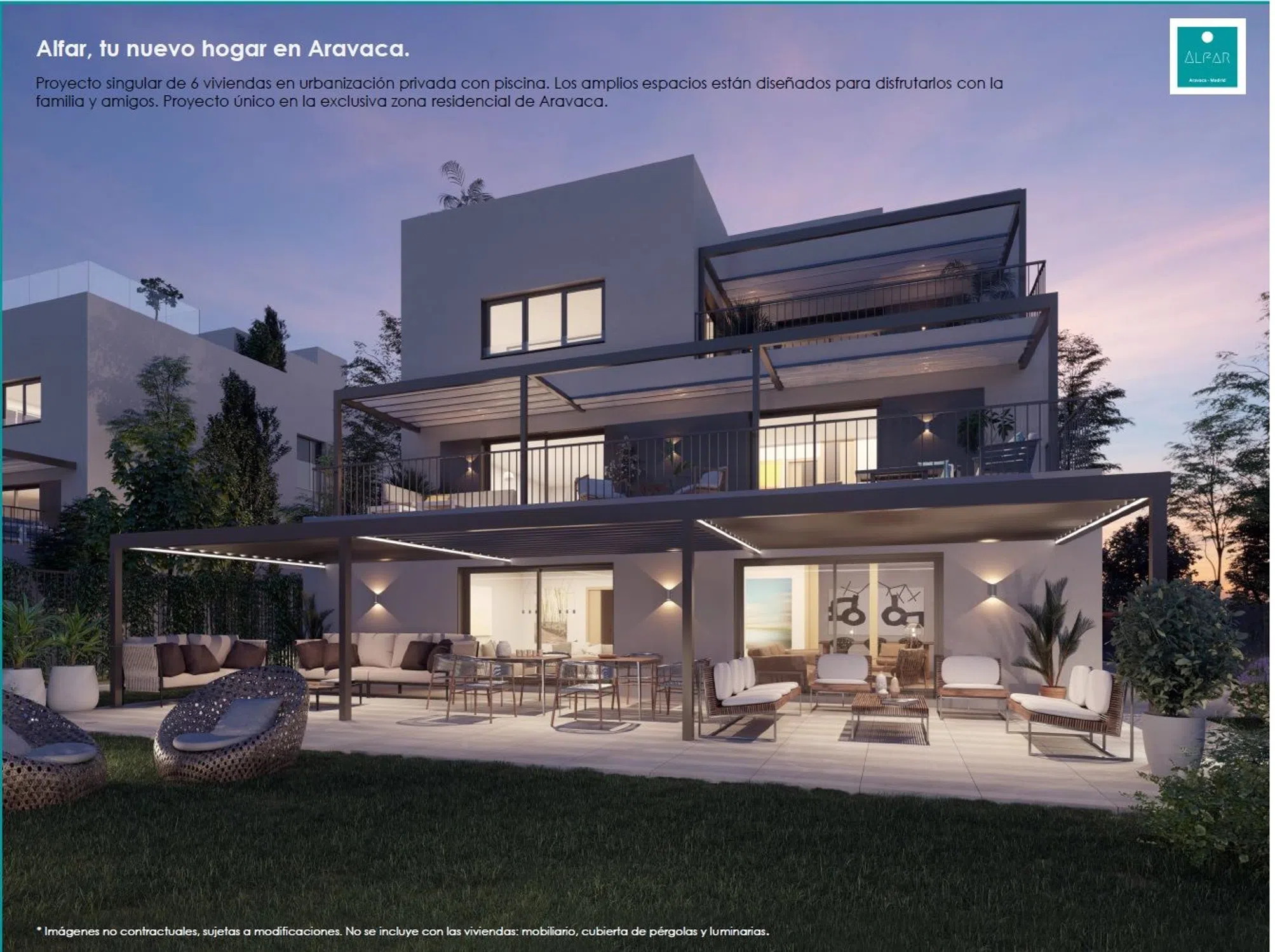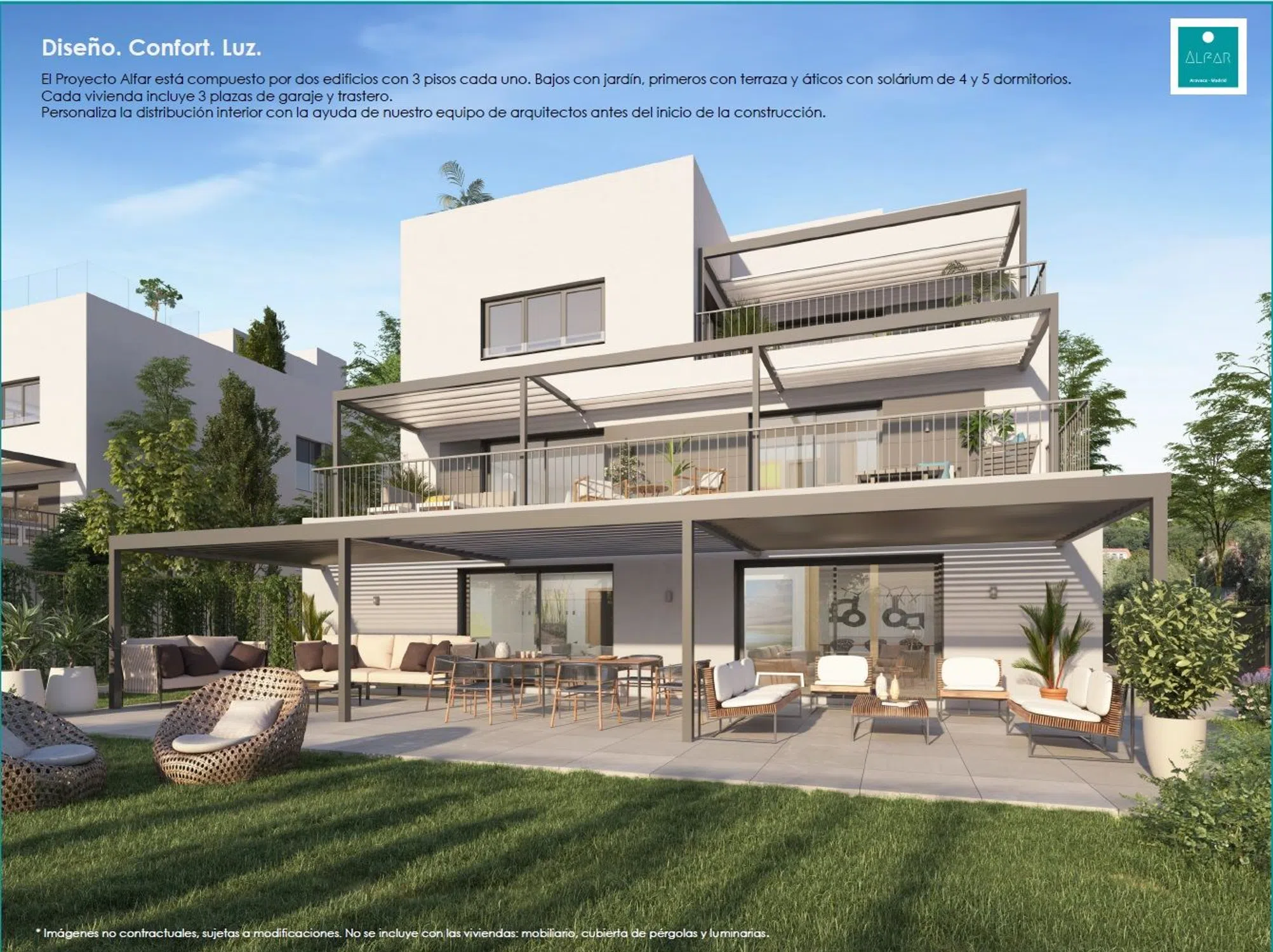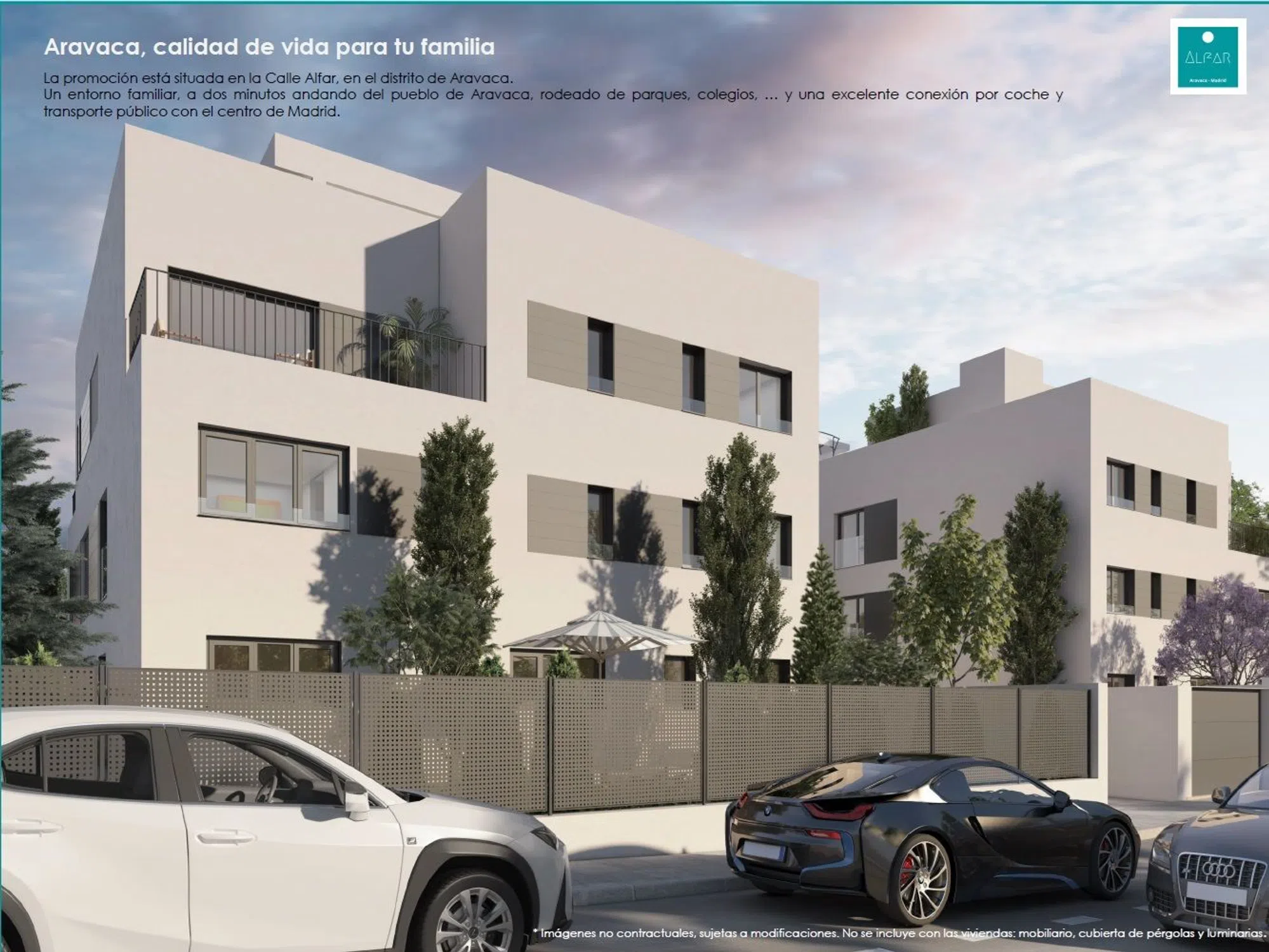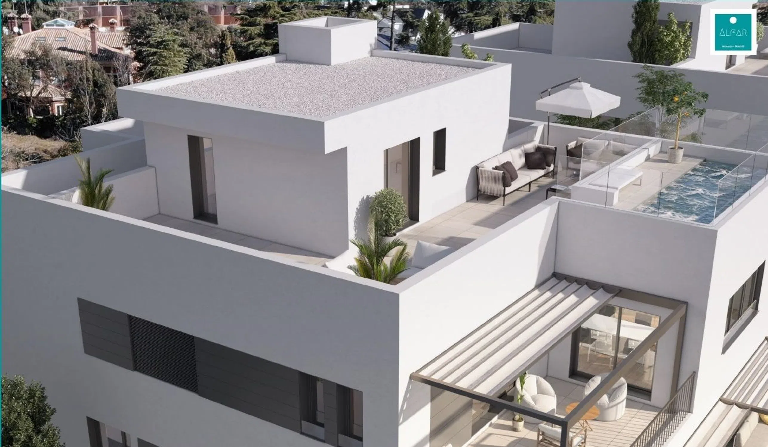 Ático dúplex de obra nueva en la urbanización privada del Proyecto Alfar, en el centro de Aravaca. Destaca por su diseño exclusivo, amplitud de estancias y posibilidades de personalización. Distribución y superficies útiles: Planta Principal: Salón – estar: 45 m² Cocina + tendedero: 17,6 m² Habitación de lavado: 6,3 m² Comedor – office: 14,2 m² Dormitorio principal: 34,3 m² (incluye vestidor y baño en suite) Dormitorio 2: 13,7 m² Terraza: 9,6 m² Terraza: 19,6 m² Planta Ático: Dormitorio 3: 16 m² (incluye vestidor y baño en suite) Solárium: 84 m² con vistas espectaculares. Memoria de calidades destacada: Estructura y fachada: Hormigón armado con aislamiento térmico de alta densidad y revestimiento en mortero monocapa. Climatización: Calefacción y refrigeración por suelo radiante y refrescante mediante sistema de aerotermia. Carpintería: Ventanas con doble acristalamiento, rotura de puente térmico y persianas motorizadas. Suelos: Tarima laminada en salón y dormitorios; gres porcelánico de alta calidad en cocina y baños. Cocina: Equipada con muebles de diseño, encimera Compac Stone y electrodomésticos de primeras marcas. Baños: Grifería monomando de efecto lluvia y acabados en gres porcelánico. Zonas comunes: Piscina de cloración salina, ajardinadas, iluminación y preinstalación para vehículos eléctricos en el garaje. Localización: A pocos minutos del centro de Aravaca, con excelente conexión a Madrid por la M-40 y A-6, además de transporte público cercano. Incluye 3 plazas de garaje y trastero.