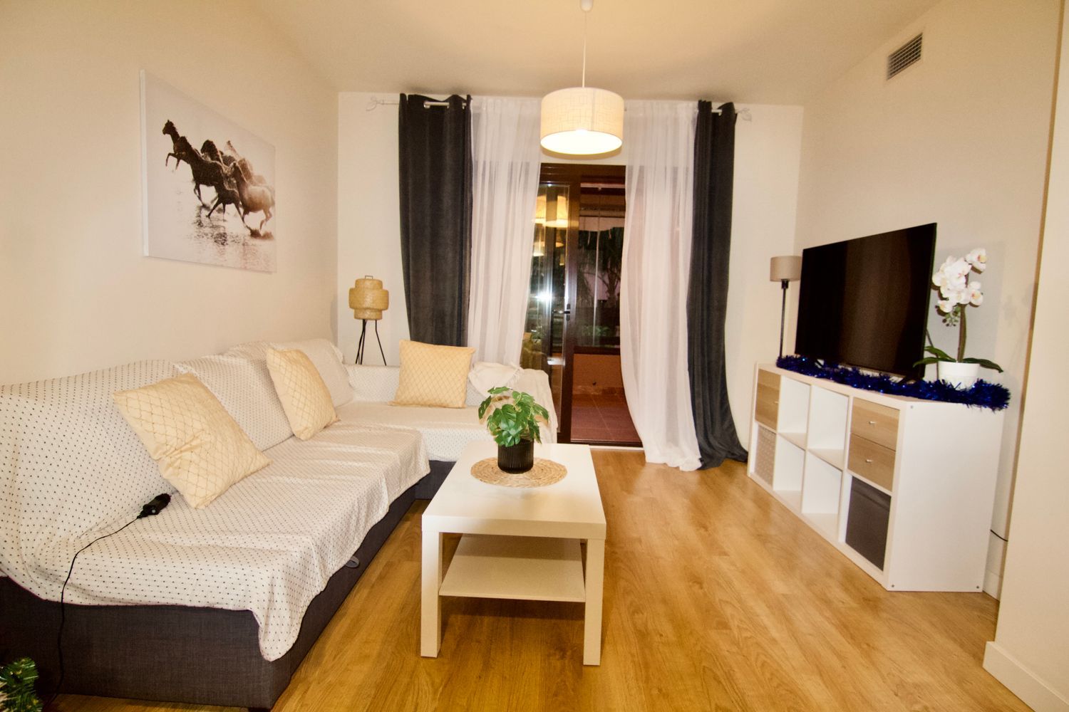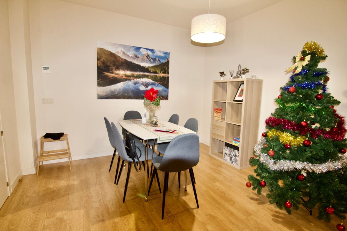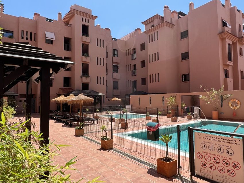 Irene Homes alquila para larga temporada piso en urbanización Myramar, Benalmádena.El piso se encuentra en urbanización con recinto cerrado, amplios jardines, 7 piscinas comunitarias.Se encuentra en una zona residencial y familiar. Dispone de muy acceso con autovía A7 AP7. A 15 minutos caminando del centro de Arroyo de la Miel.Se alquila amueblado y equipado, tal cual aparece en las fotografías.2 dormitorios, 2 baños, uno de ellos en suite. 2 terrazas, una de ellas cerrada con ventanas de cristal, cocina independiente con lavadero.Armarios empotrados, termo eléctrico y por placas solares, aire acondicionado frío/calor centralizado. Suelos de tarima, ventanas climalit doble acristalamiento.Incluye en el precio 2 plazas de garaje privadas.Se exigen garantías de pago demostrables.Sin mascotas.