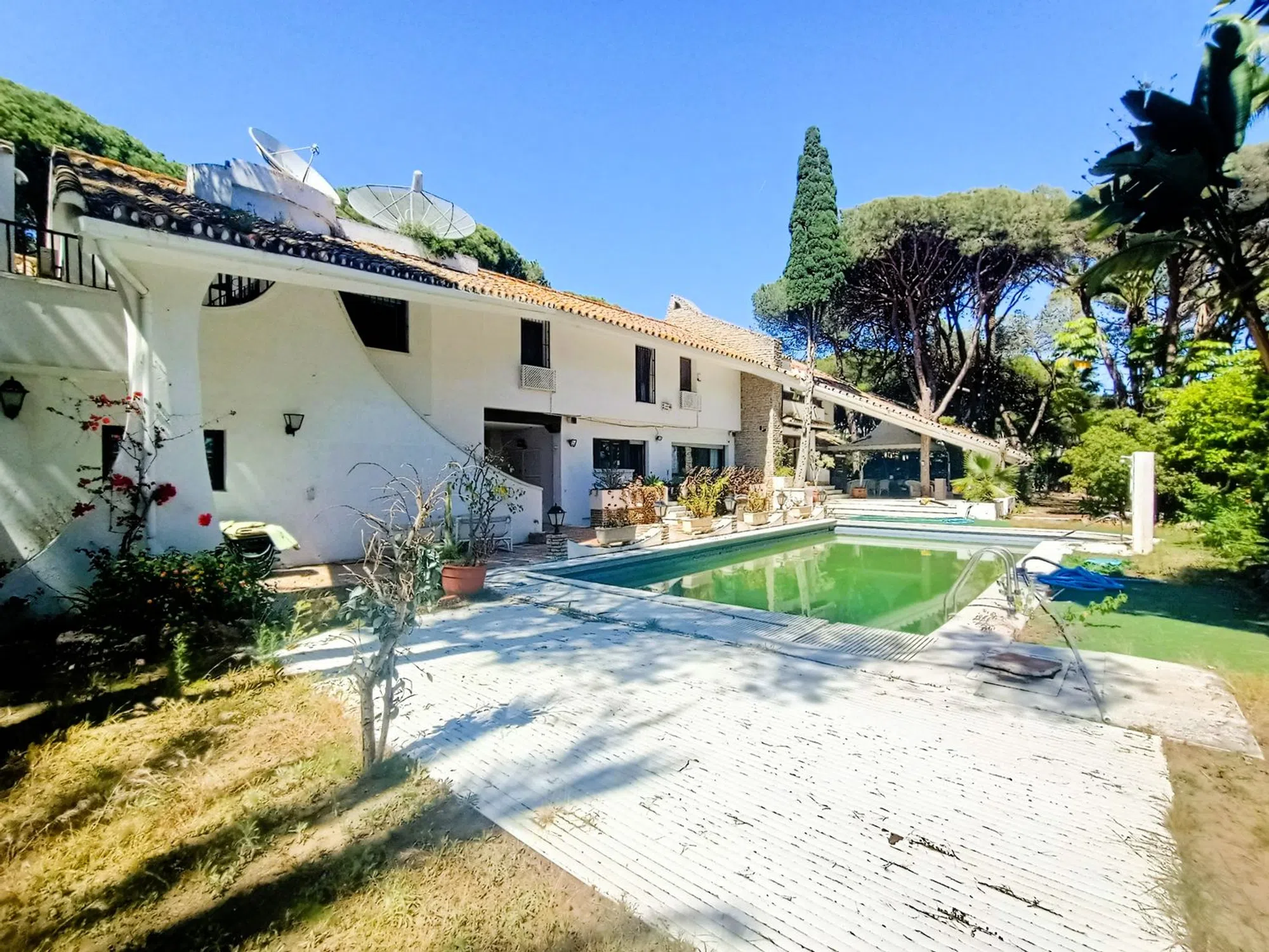 VILLA EXCLUSIVA PARA REFORMAR EN CABOPINO – Oportunidad única en segunda línea de playa. En la codiciada zona de Cabopino, Marbella, a solo unos pasos de la playa y rodeada de un frondoso pinar, se encuentra esta majestuosa villa de 1.243 m² construidos sobre una amplia parcela de 2.117 m². Una propiedad única, bañada por la luz natural y con vistas al mar desde casi todas sus estancias, que ofrece privacidad, amplitud y un sinfín de posibilidades de renovación. La villa está diseñada con una planta baja que alberga dos zonas completamente independientes, cada una con su propia cocina, salón y comedor, lo que permite múltiples configuraciones: desde uso familiar compartido hasta alojamiento para invitados o personal. En total, dispone de nueve dormitorios, siete baños, dos aseos, dos salones principales y una cocina adicional de tipo industrial para quienes disfrutan de la gastronomía a gran escala. El sótano ofrece espacios ideales para crear una zona de bienestar con sauna, baño turco, bodega, gimnasio o cine privado. En el exterior, el jardín maduro rodea una gran piscina, acompañado de una terraza con zona de bar y barbacoa perfecta para disfrutar del clima mediterráneo. Completan la propiedad dos garajes cerrados y un aljibe de 30.000 litros. Una joya por descubrir. Ubicada cerca del puerto de Cabopino y con fácil acceso a la A7, esta propiedad no solo destaca por su localización y dimensiones, sino también por su enorme potencial de transformación. Ya sea como villa de lujo, proyecto turístico, inversión a futuro, o dos villas independientes. Las posibilidades son amplias y rara vez disponibles en una ubicación tan privilegiada. Descúbrela en persona y enamórate de sus posibilidades.