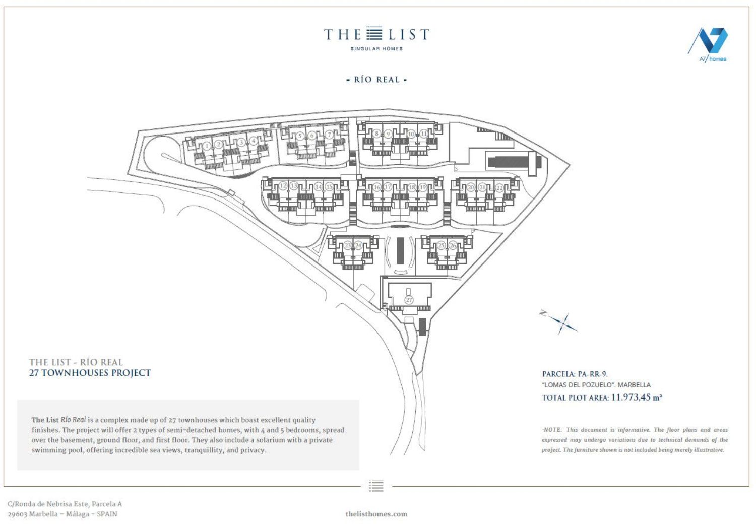 The List Río Real es un complejo de 27 viviendas adosadas y pareadas con un nivel de acabados excelente.Gracias a la pendiente de la parcela, la implantación de las viviendas se escalona en diferentes líneas para absorber las diferencias de rasante garantizando unas impresionantes y claras vistas al mar de cada una de las viviendas proyectadas.El proyecto contará con 2 tipos de viviendas, adosadas y pareadas de 4 y 5 dormitorios, distribuidas en planta sótano, baja, primera y solárium en la cual se dispondrá de una piscina privada con impresionantes vistas al mar.El área destinada a garaje se situará en subterráneo con un único acceso para los vehículos desde el viario público y evitando el tráfico rodado dentro de la urbanización.La urbanización dispone de piscina descubierta de uso comunitario y amplios jardines y caminos de acceso a cada vivienda.El conjunto contará con un gimnasio al que se accede desde la planta superior de terraza de la zona comunitaria. El gimnasio dispone de un baño turco, sauna, sala de masaje, además de los baños, uno de ellos adaptado para personas con movilidad reducida.Tu seguridad y la de los tuyos es lo más importante, por eso The List cuenta con el mejor servicio de la Costa del Sol, personal 24 horas 7 días a la semana, alarmas y cámaras perimetrales que te permitirán disfrutar de tu casa sin preocuparte de nada más.