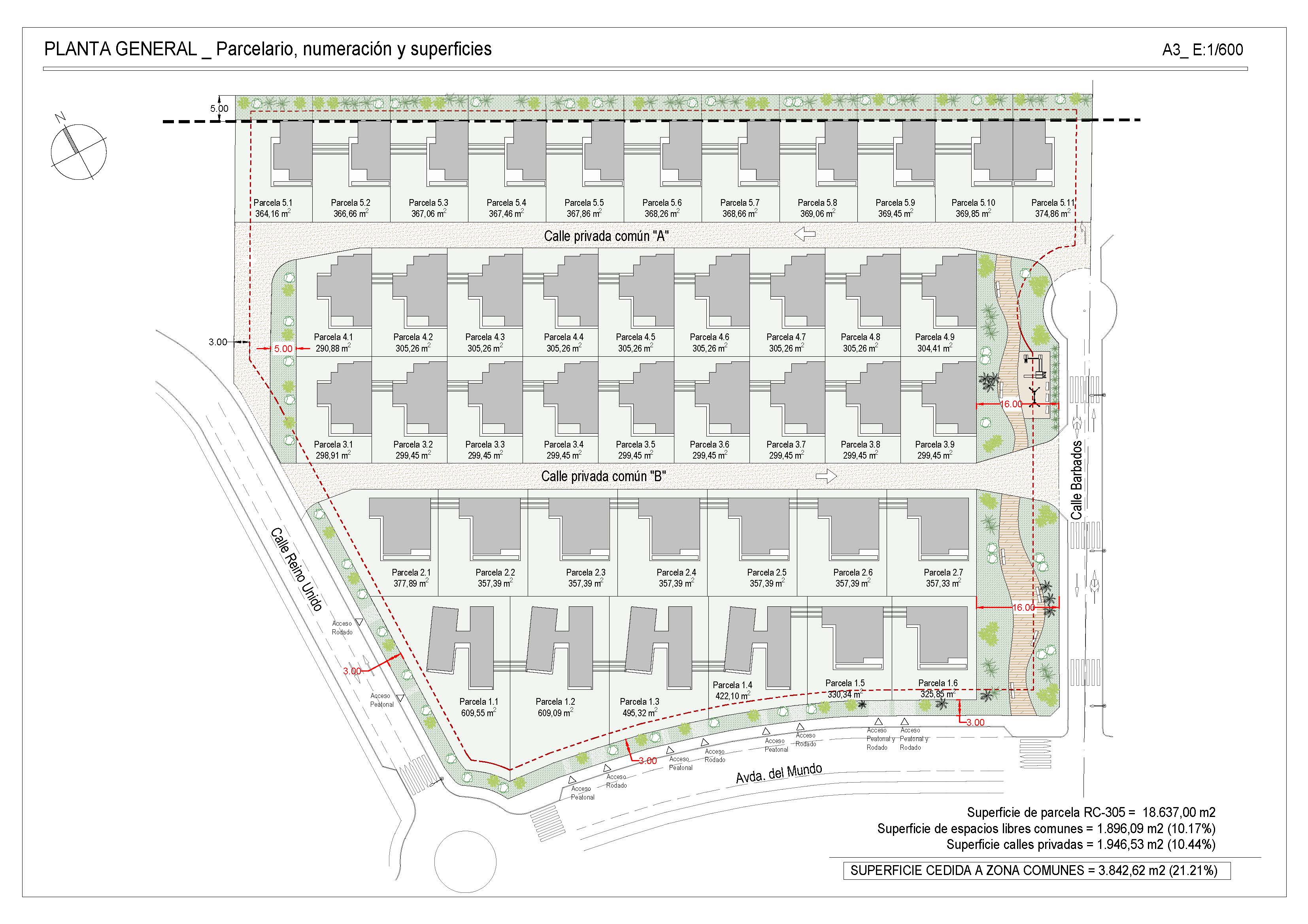 - Parcelas delimitadas entre sí mediante muro de 40 cm de altura más valla de simple torsión lacada en verde, rematada con seto artificial de 1,50 m de altura.