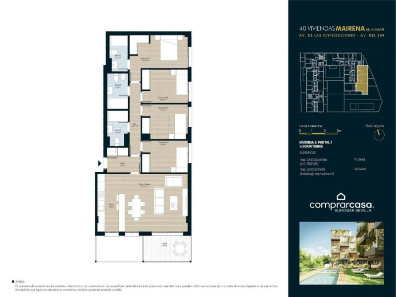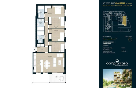 OBRA NUEVA EN NUEVO BULEVAR:¡COMPRA Y DISFRUTA DE UN CRUCERO PARA DOS PERSONAS POR EL MEDITERRÁNEO!Modernidad, distinción y sostenibilidad… en el mejor residencial de Mairena Que vivir en Mairena del Aljarafe está de moda, es un hecho. ¿Cómo no iba a estarlo? Pero hacerlo en un residencial exclusivo, donde la modernidad y la vanguardia se conjugan a la perfección con la comodidad, la sostenibilidad y el bienestar, está al alcance de muy pocos. Hoy tenemos el inmenso placer de presentaros “Residencial del Sur”, una preciosa promoción de obra nueva, ubicada en la zona más solicitada de la localidad: Nuevo Bulevar. Su localización ya la hace especial, pues se encuentra en las confluencias de las Avenidas de las Civilizaciones y del Sur. Gracias a ello tendrás acceso caminando, sin necesidad de mover el coche, a todos los servicios que ofrece Mairena, así como las mejores comunicaciones por carretera y en transporte público. “Residencial del Sur”, como ya te avanzaba al principio, es una promoción muy exclusiva, pues se componen de 40 viviendas, con sendas plazas de garaje y trasteros. La distribución de las viviendas se adapta a cualquier tipo de familia, porque cuentan con 2, 3 y 4 dormitorios; y su diseño responde a los gustos y demandas actuales, ya que todos los pisos cuentan con terraza propia.También hemos hablado de la simbiosis entre modernidad, bienestar y sostenibilidad. El diseño de la construcción responde a la más absoluta vanguardia. El agua y los jardines son los protagonistas de este proyecto que, además, tiene detalles que lo hacen especial y lo convierten en un hábitat acogedor abierto al luminoso cielo de Sevilla. Déjame que haga especial hincapié en la piscina que, al estar elevada con respecto al nivel del suelo, tiene unas vistas completamente despejadas. ¿Se te ocurre algo más relajante que un buen baño mientras disfrutas de la puesta del sol en el horizonte? Como imaginas, esto no es todo, “Residencial del Sur” dispone de amplias zonas verdes y de recreo, que nos permitirán que toda la familia disfrute al máximo la vida al aire libre. También cuenta con una sala destinada al Gimnasio comunitario: todo un lujo que nos permitirá deleitarnos con unos minutos del tan ansiado autocuidado, sin necesidad de salir del edificio. La falta de tiempo y la distancia ya no supondrán un problema. Y si creías que terminábamos aquí, nada más lejos de la realidad. Y es que, si el residencial es exclusivo, tu casa puede ser única… Podrás personalizarla por completo, en función de tus gustos y necesidades, antes de ser construida. Nuestro equipo técnico, que opera bajo la marca “MINAMI”, es especialista en interiorismo y estará a tu disposición para desarrollar todo aquello que siempre has imaginado… Además, y por tiempo limitado, no sólo estarás comprando la casa de tus sueños, sino que podrás celebrarlo con un estupendo viaje. Sí, has oído bien, en Comprarcasa no sólo te ayudaremos a llevar a cabo la compra con todas las garantías, sino que te regalaremos un maravilloso Crucero por el Mediterráneo para dos personas. No lo dudes, más, llámanos y escribe, hoy mismo, la primera página de tu nueva vida….