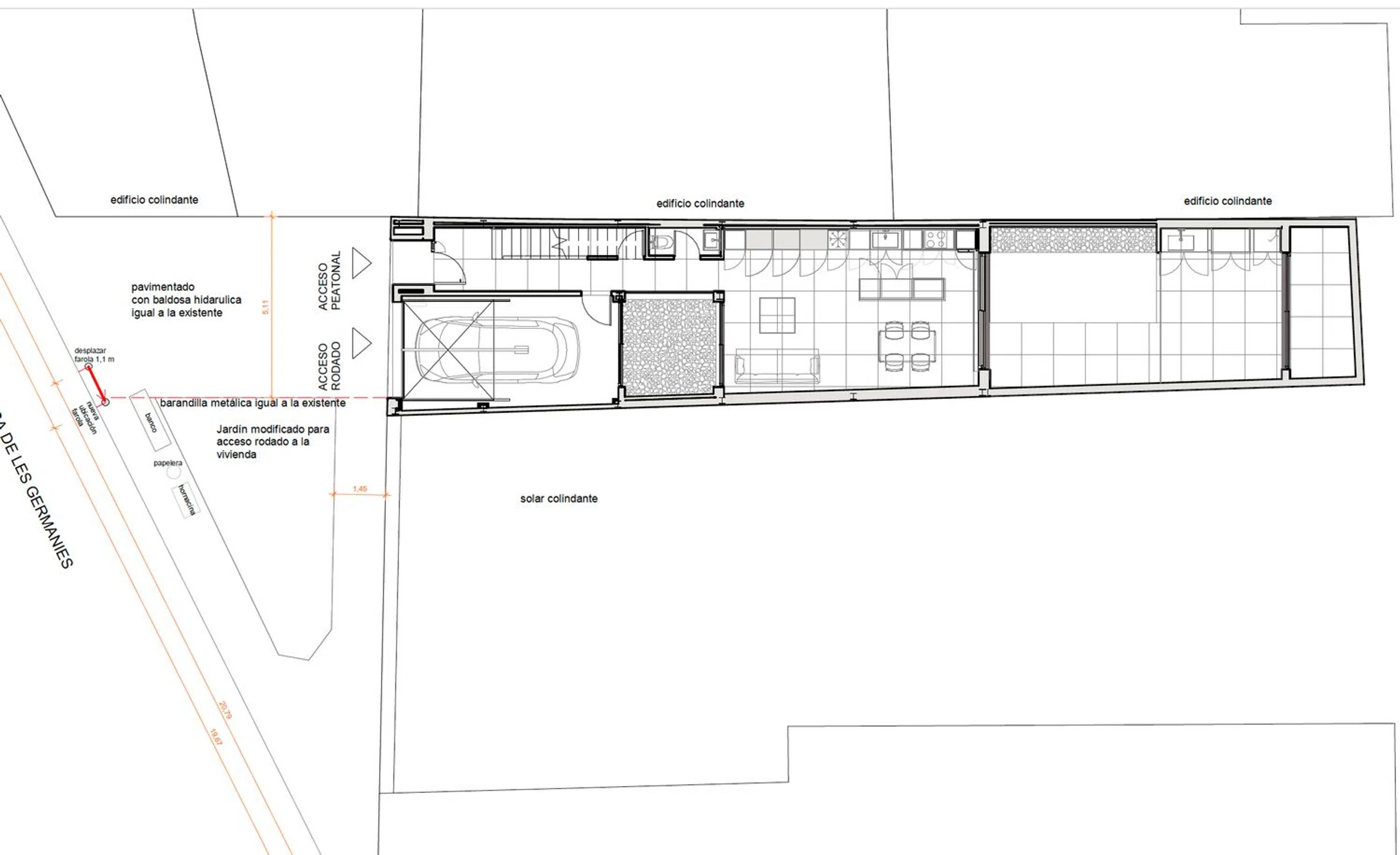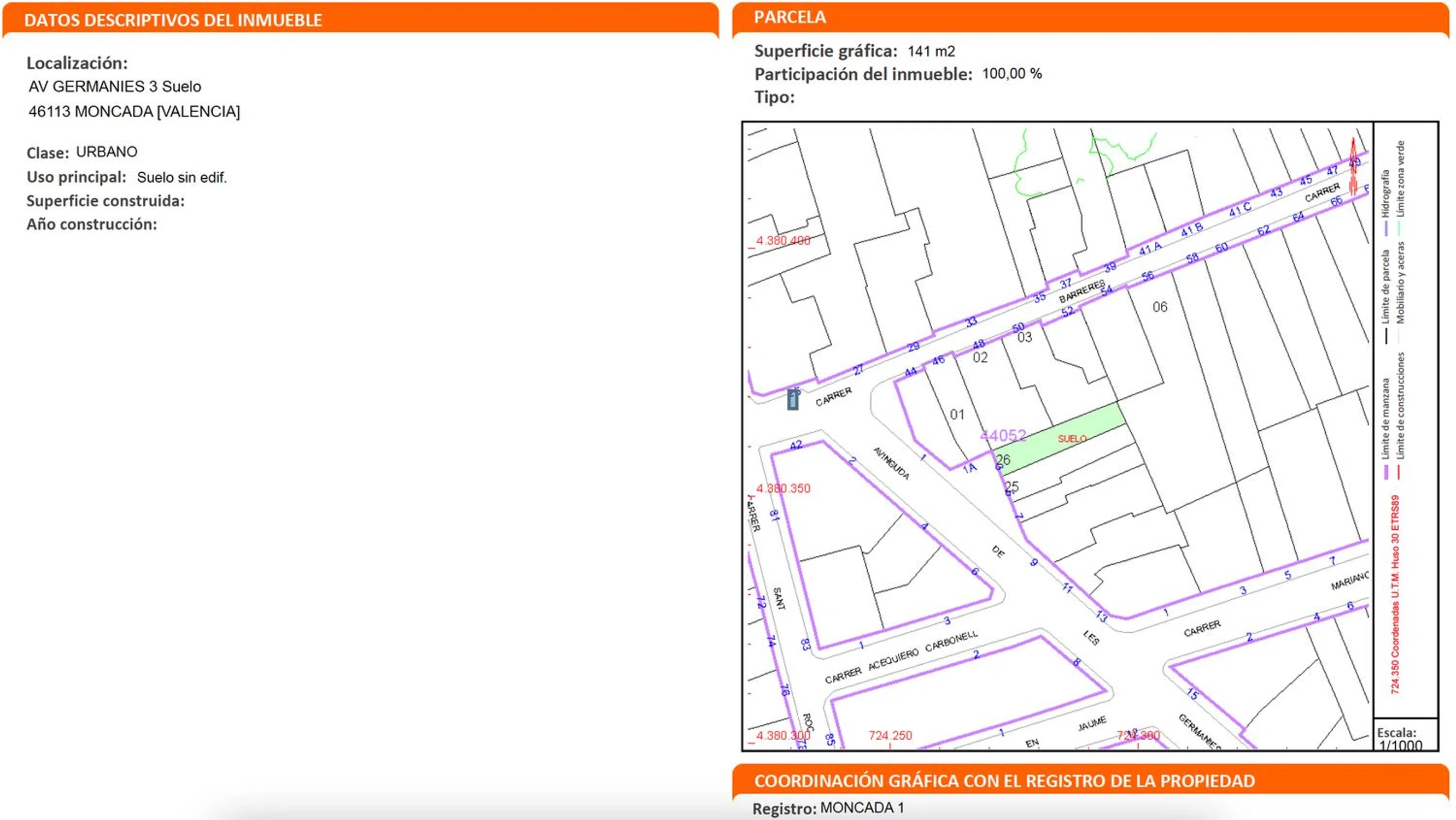 Parcela urbana situada en el centro histórico de Moncada, ubicada en una manzana formada principalmente por viviendas unifamiliares adosadas. A pie, se situa a: - 2 min. de la parada de metro Moncada-Alfara - 4 min. de la parada de autobús EMT Moncada-Alfara. - 5 min. de dos supermercados y otros servicios. - 2 min. de cafeterías y horno de la zona del Ayuntamiento. - 10 min. de la Universidad CEU-Cardenal Herrera. En la parcela, que cuenta con un ancho de fachada de 5,50 metros, se permite la construcción de una edificación de tres plantas (baja, primera y buhardilla) y cuenta con una profundidad edificable de 17 metros. Está permitido el acceso rodado al futuro inmueble. El solar se vende junto al proyecto básico y de ejecución ya realizado de una vivienda unifamiliar entre medianeras de tres plantas, con aproximadamente 200 m2 construidos (4 habitaciones, buhardilla, garaje, 3 baños, cocina integrada en el salón-comedor y trastero). Adicionalmente, dispone de un patio posterior de aprox. 40 m2, de una terraza en tercera planta de 41 m2 y de un patio interior que proporciona gran iluminación y ventilación a las estancias a las que presta servicio. La documentación del proyecto se encuentra visada por el Colegio Territorial de Arquitectos de Valencia, hecho que permite solicitar la licencia de obras y construir de forma inmediata. El proyecto ha sido desarrollado por un reconocido estudio de arquitectura de Moncada. El importe correspondiente a estos honorarios no se encuentra incluido en el precio del terreno.