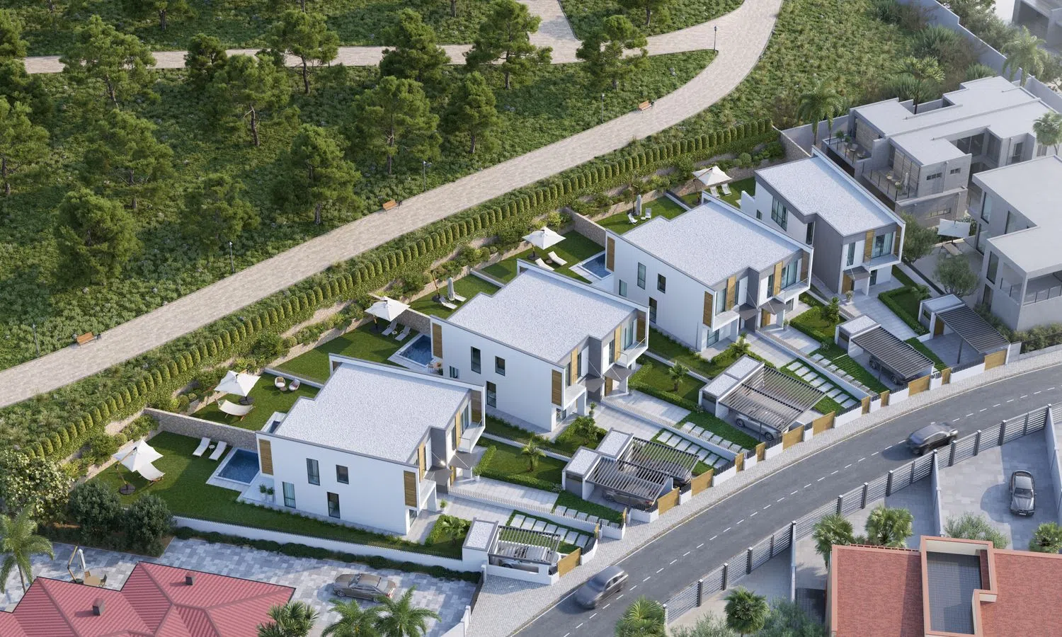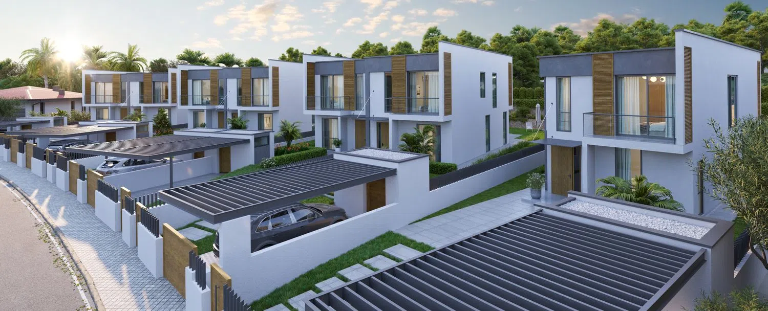 Extérieur: Une élégance architecturale inspirante. Les façades imposantes et soigneusement dessinées s'intègrent harmonieusement au cadre naturel, reflétant une esthétique moderne et fonctionnelle. Chaque maison propose une piscine privée ainsi que de vastes terrasses, idéales pour savourer le climat méditerranéen.