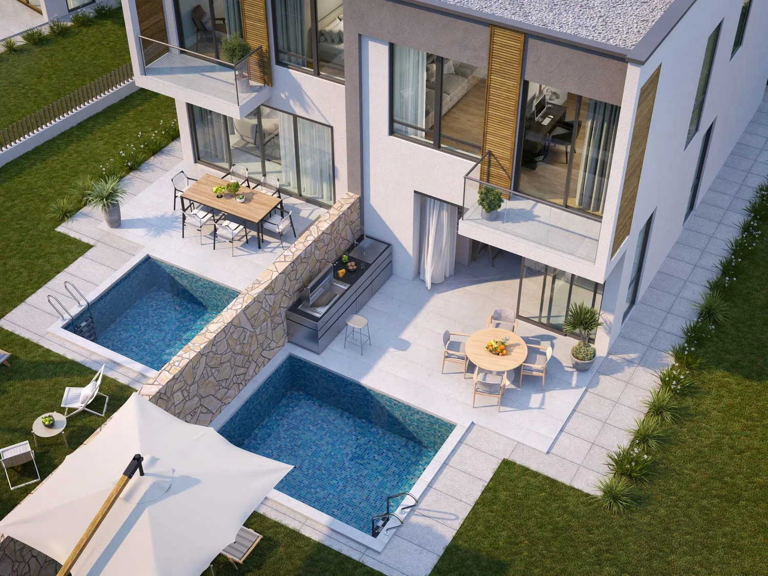 Les maisons jumelées comportent, au rez-de-chaussée, un salon avec cuisine ouverte, une chambre polyvalente, une salle de bain, une terrasse et une piscine privée. Au premier étage, une suite principale avec salle de bain et terrasse, deux chambres doubles (dont une avec terrasse) et une salle de bain supplémentaire. Les intérieurs se distinguent par leur luminosité, leur espace et leurs finitions haut de gamme, avec des possibilités de personnalisation pour que chaque maison soit aussi unique que vous.