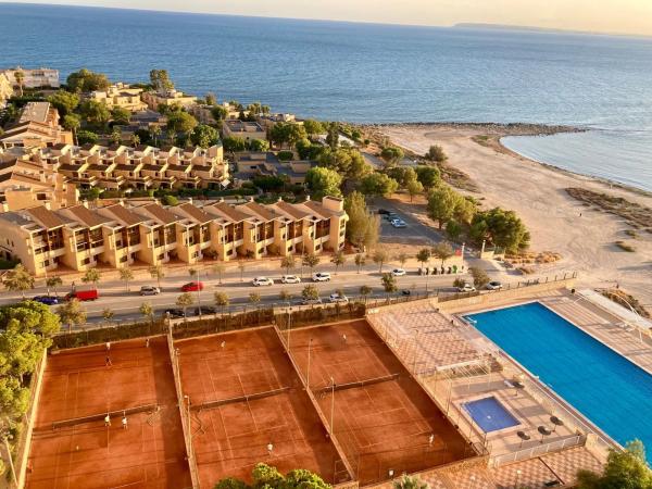 Vivienda amplia con magníficas vistas a la Bahía de Alicante, desde el faro de Santa Pola hasta la isla de Tabarca. Gran urbanización con pistas de tenis de tierra batida y piscina olímpica.