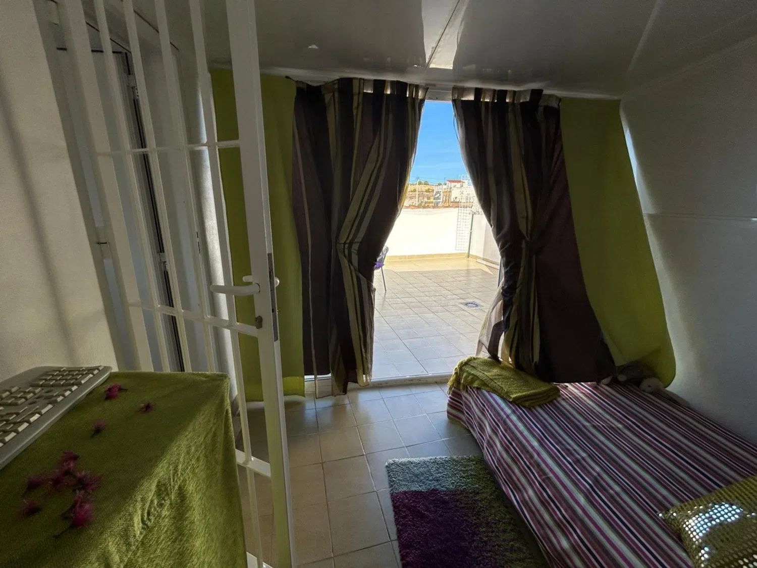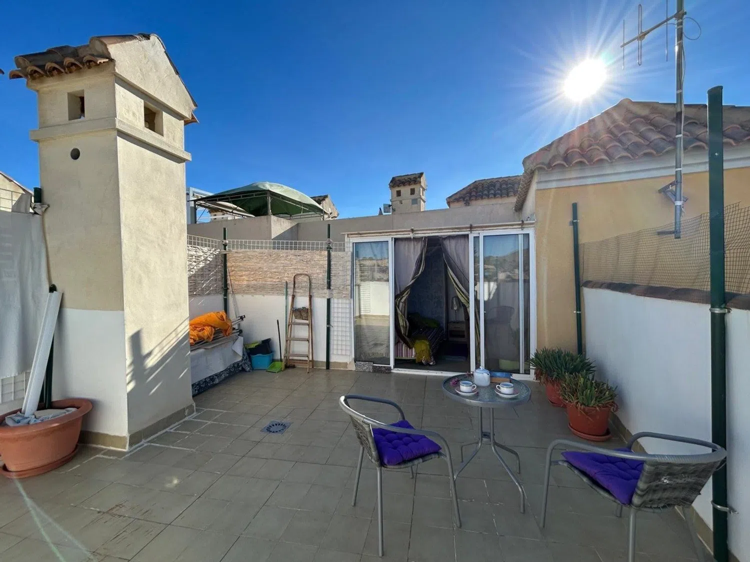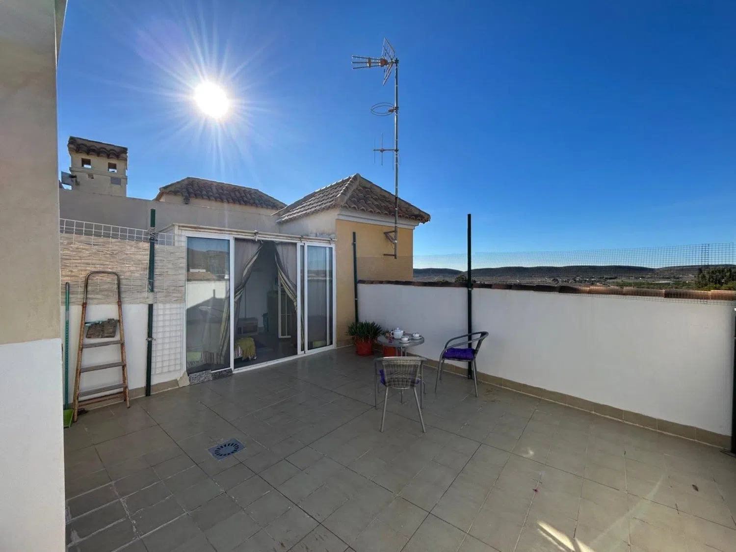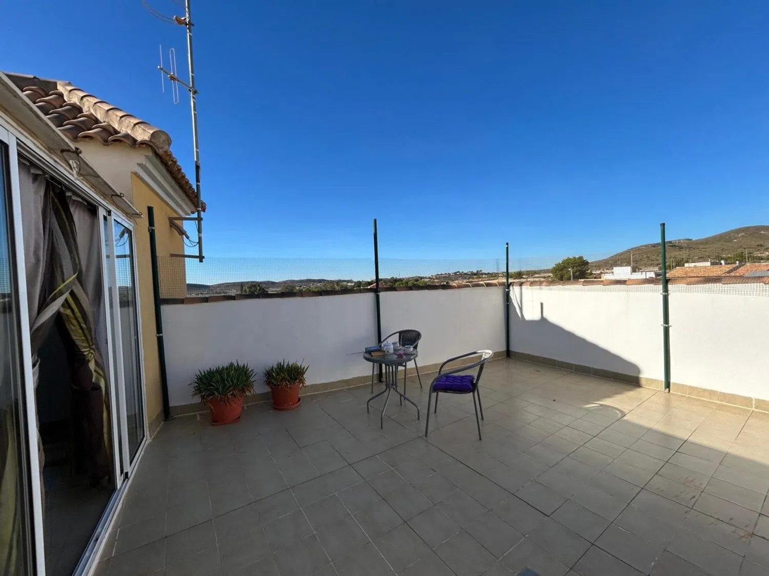 De twee slaapkamers zijn ontworpen voor comfort, met voldoende ruimte voor bedden en nachtkastjes, wat een rustgevende nachtrust garandeert. De badkamer, functioneel en goed uitgerust, voegt extra gemak toe aan de woning. Op het ruime terras kunt u genieten van een buitenomgeving die ideaal is voor tuinmeubelen en ontspanningsruimtes, naast het genieten van een prachtig uitzicht op de omgeving.