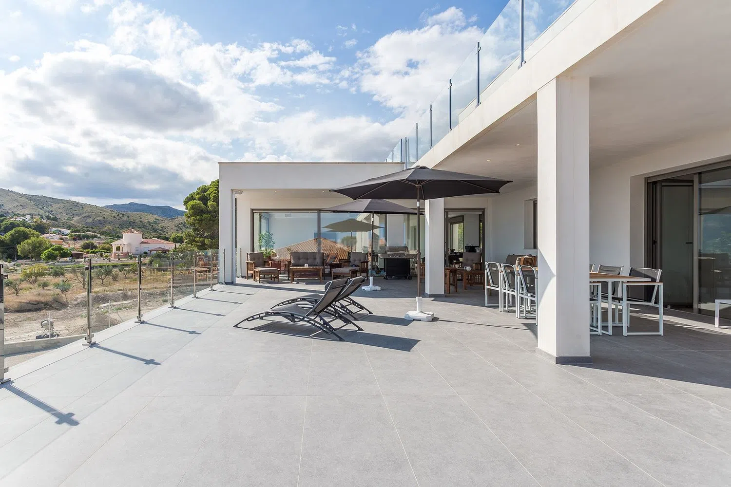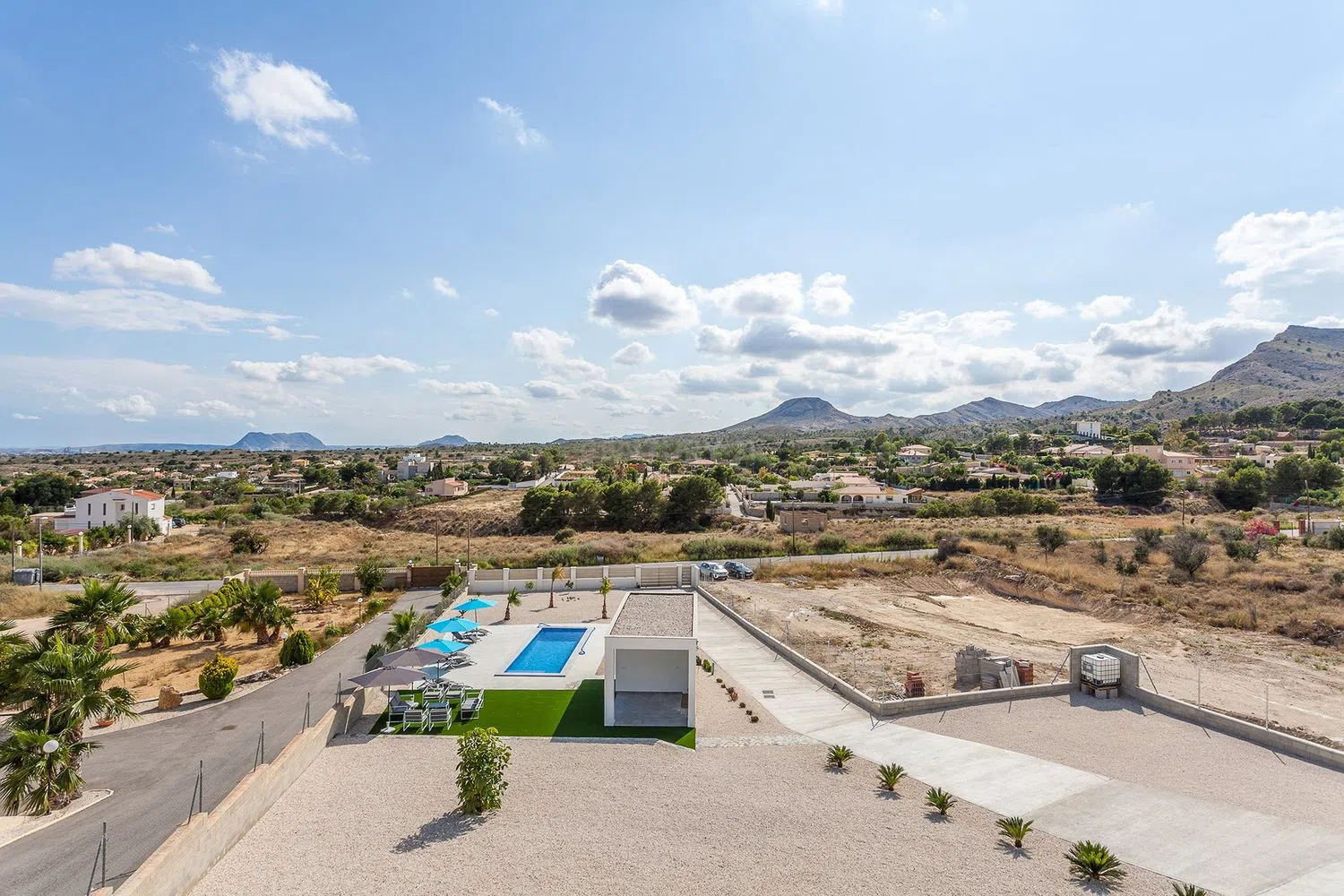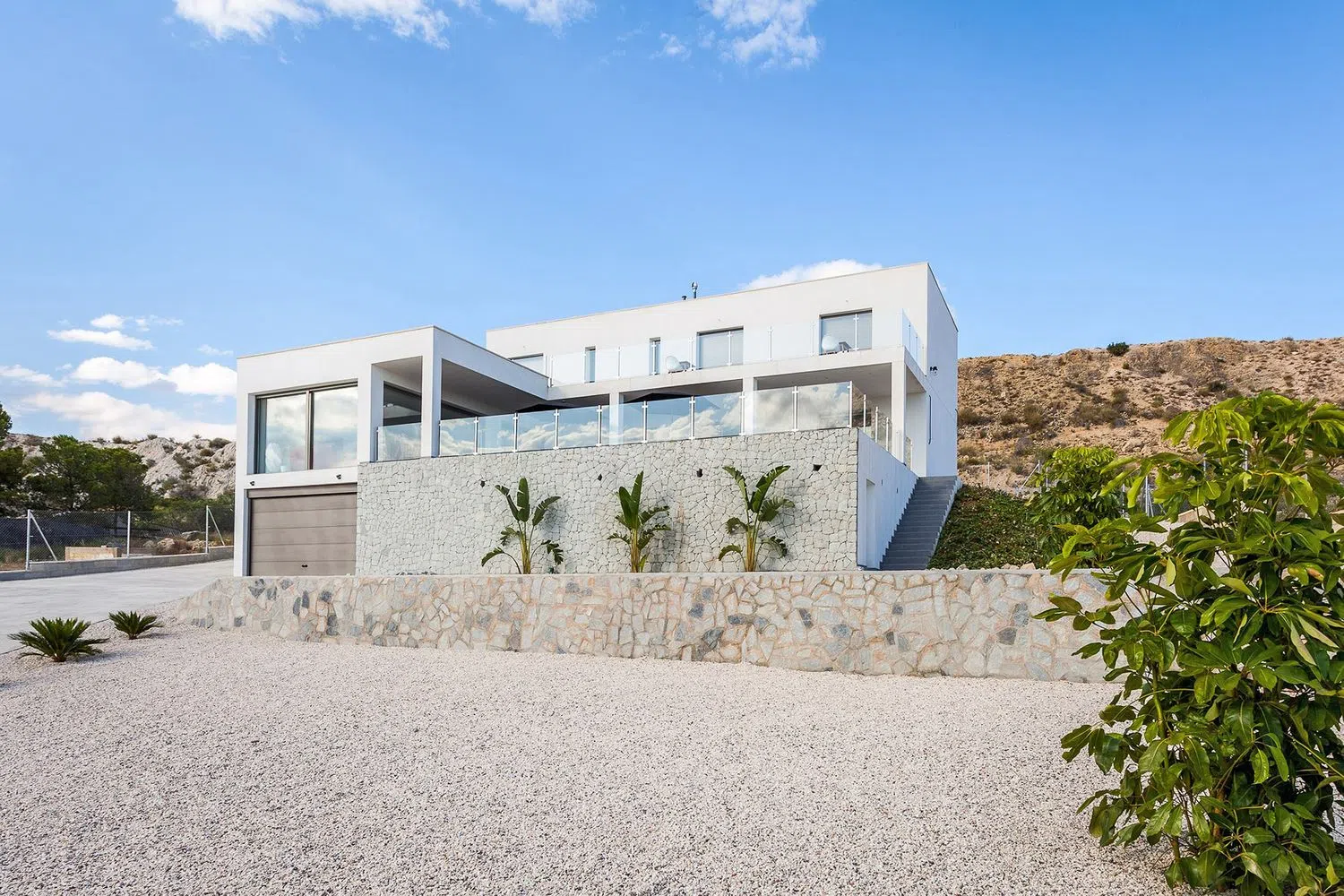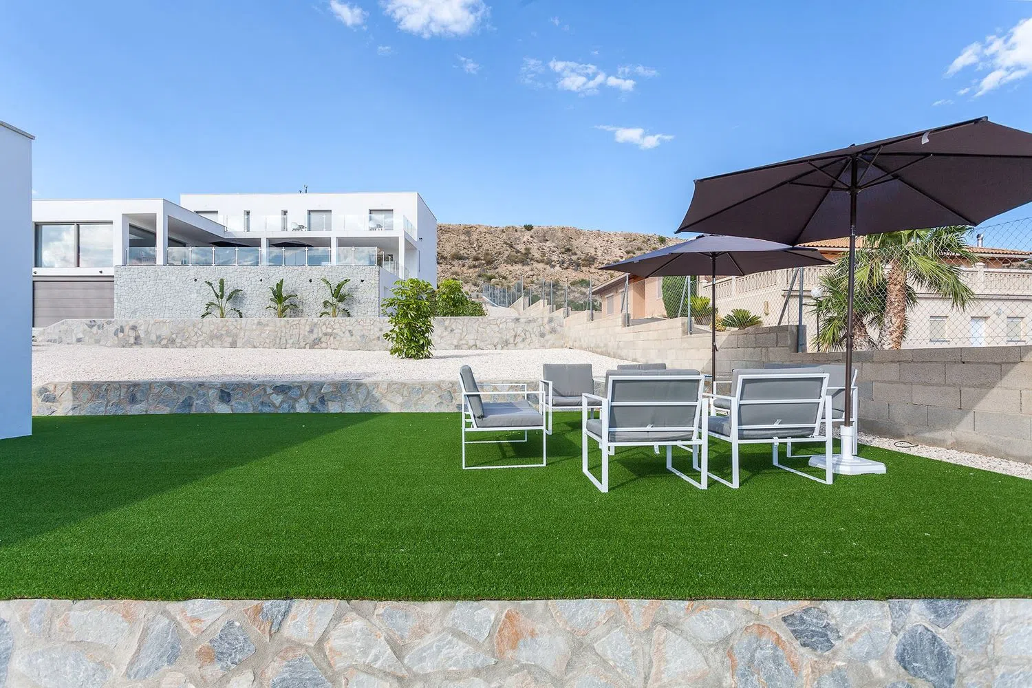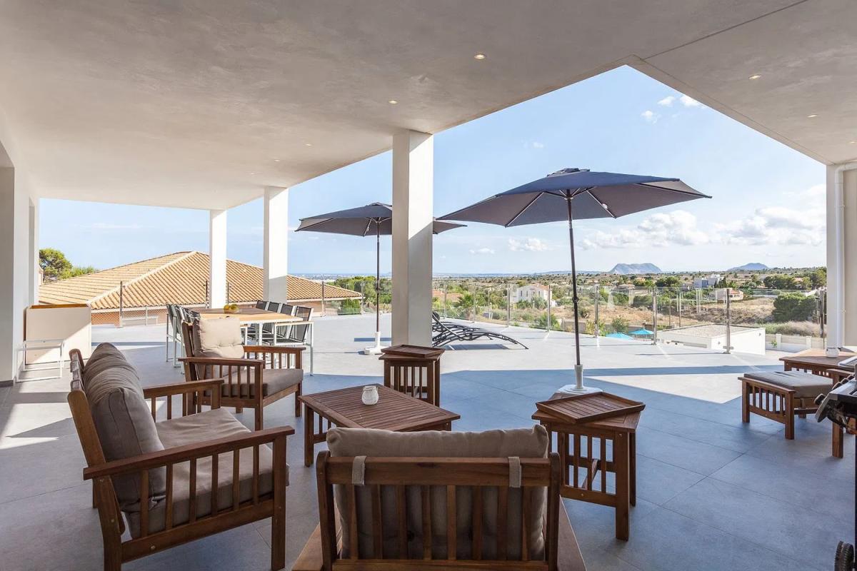 Deze prachtige moderne villa biedt vijf slaapkamers met luxueuze badkamers en werd voltooid in maart 2020. De totale woonoppervlakte is 385m² en spreidt zich uit over twee verdiepingen. De woning werd gebouwd met bouwmaterialen van hoge kwaliteit en staat op een perceel van 2.750m². Het hoofdterras is gedeeltelijk overdekt en heeft een oppervlakte van 125m². De villa biedt een prachtig panoramisch uitzicht over de Valle del Sol en Alicante, evenals de blauwe Middellandse Zee.