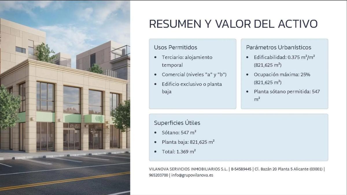 Presentamos una excelente oportunidad de inversión en una de las zonas más exclusivas y con mayor proyección de Alicante: Vistahermosa. Esta parcela, ubicada estratégicamente en la Av. Antonio Ramos Carratalá, está destinada a uso comercial y terciario, ideal para el desarrollo de un edificio corporativo, clínica privada, restaurante premium, supermercado o alojamiento temporal. Ubicación Premium En el corazón de Vistahermosa, una de las zonas residenciales más demandadas de Alicante. Acceso directo a las principales vías de la ciudad. Entorno consolidado con urbanizaciones de alto nivel y comercios consolidados. Entorno y Comunicaciones A menos de 5 minutos de centros comerciales de referencia. Paradas de autobús urbano próximas a la parcela. Calles amplias, zonas verdes y calidad ambiental en el entorno. Características del Suelo Superficie total: 2.191 m² Clasificación: Suelo urbano Calificación urbanística: Terciario comercial Usos permitidos: Comercial (niveles “a” y “b”) Alojamiento temporal Edificio exclusivo o planta baja Parámetros Urbanísticos Edificabilidad: 0,375 m²/m² → 821,63 m² Ocupación máxima: 25% Planta sótano permitida: 547 m² Superficie total construible (útil estimada): Sótano: 547 m² Planta baja: 821,63 m² Total: 1.369 m².