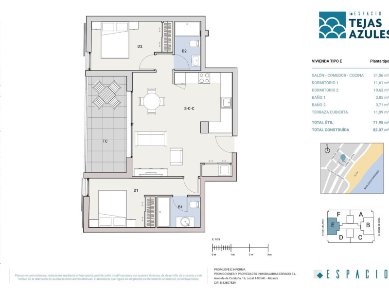 , son 26 viviendas de 2 y 3 dormitorios con garaje y trastero. Se compone de local en planta baja + 4 plantas y 2 viviendas bajo cubierta. Todas las viviendas tienen terraza y van desde 80 m2 a 150 m2. Está situada en la zona céntrica de Altea pueblo, a menos de 5 minutos de la playa de L'Espigó, con acceso directo al paseo marítimo. Altea cuenta con 6 kilómetros de costa con maravillosas playas como L'Olla, Solsida, Cap Negret, Albir, Cala del Mascarat o La Roda, y acantilados sobre el mar. El Mediterráneo baña de luz a Altea, un pueblo con mucho encanto. Su proximidad con el casco urbano, cuenta con todos los servicios de restaurantes, tiendas, alquiler de hamacas, infraestructuras.