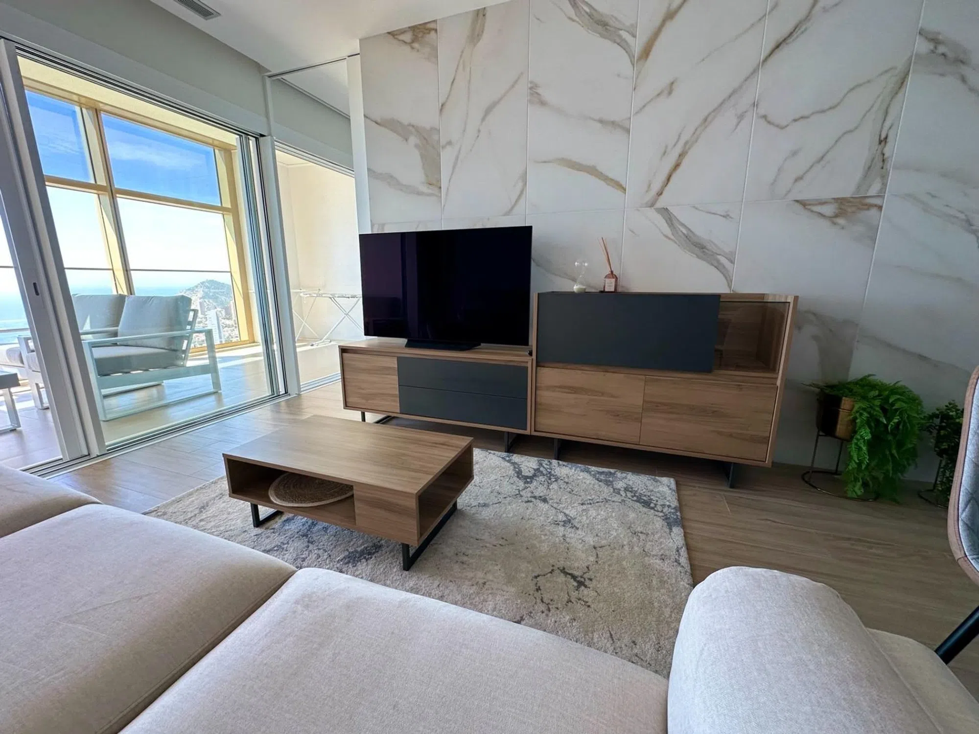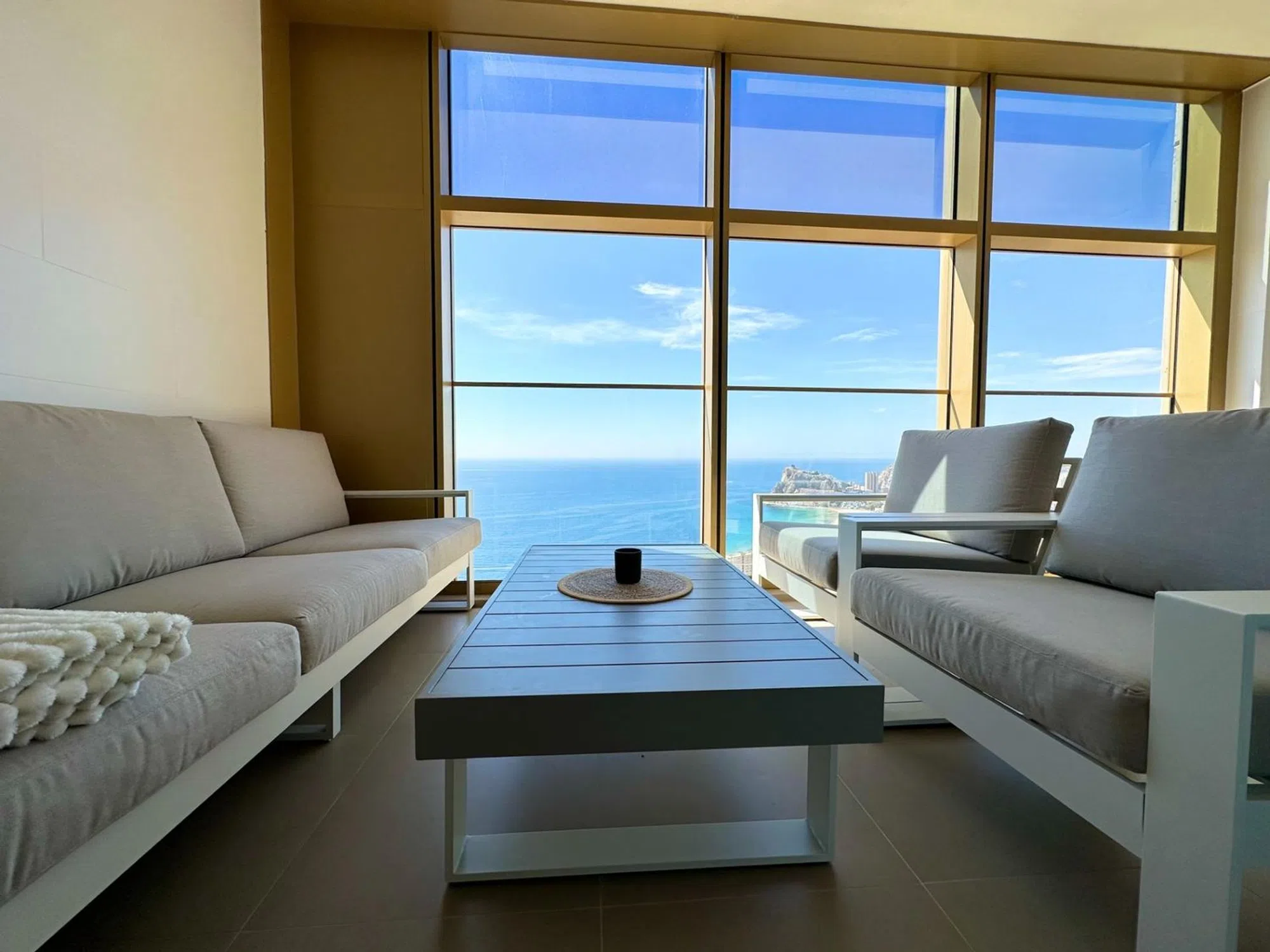 Increíble apartamento ubicado en la mejor zona de Benidorm, Playa de Poniente. El apartamento totalmente reformado y cuenta con 2 dormitorios y 2 baños completamente equipados: • El dormitorio principal cuenta con baño en suite con bañera y cama de matrimonio. • El segundo dormitorio cuenta con una cama individual. Ambas habitaciones disponen de amplios armarios empotrados con puertas lacadas blancas y revestimientos en su interior. El apartamento cuenta también con una cocina moderna y equipada. El salón es amplio, acogedor y luminoso durante todo el día, con vistas panorámicas al mar. Dispone también de una gran terraza privada, con acceso desde el dormitorio y el salón, y totalmente aislada del resto de dependencias de la vivienda. En la planta 46 encontramos espacios destinados al disfrute, con las mejores vistas. Es en esta planta donde disfrutamos de la sala fitness, una espectacular piscina climatizada, salas de masaje y sauna.