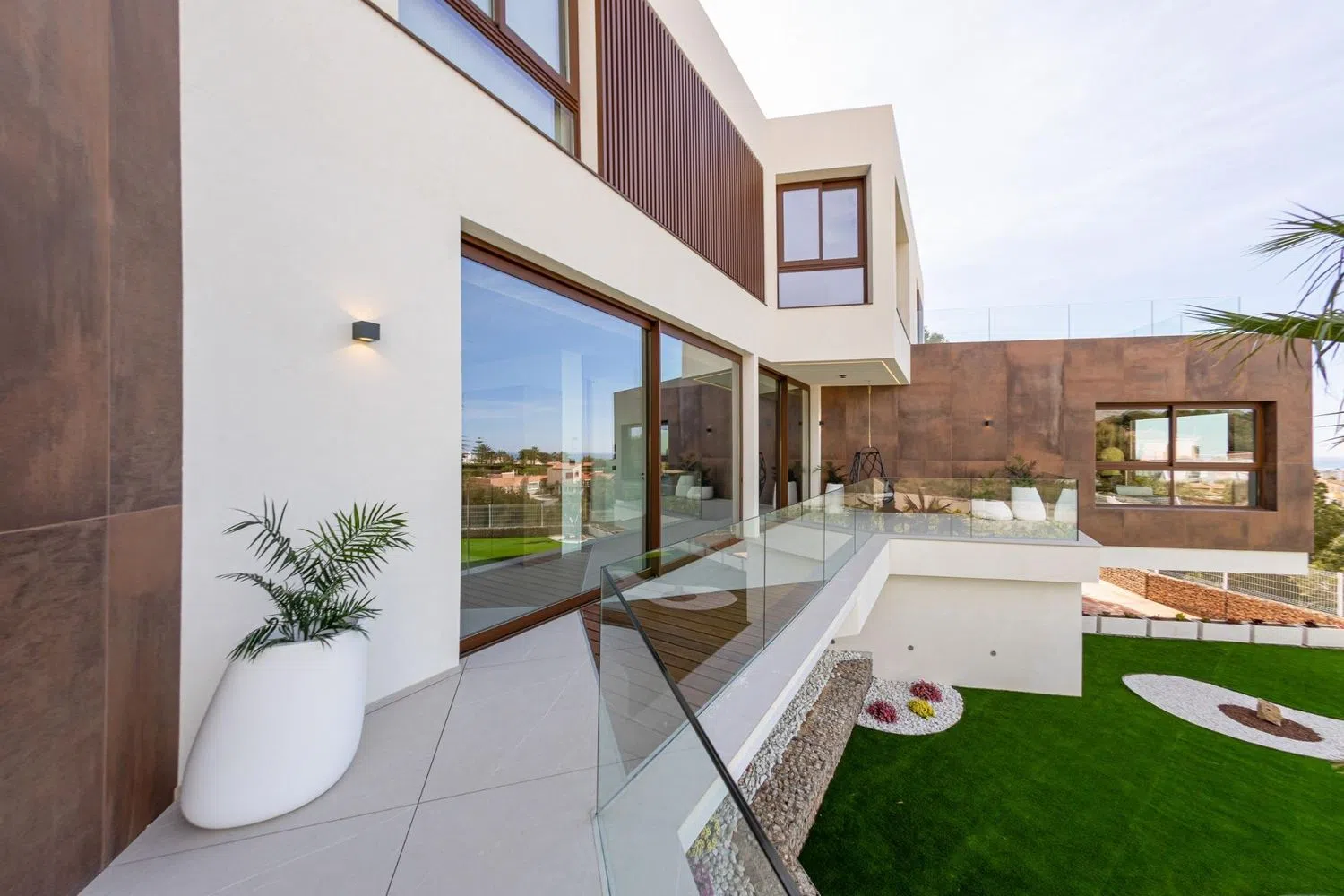 Moderne villa gelegen tussen de zee en de bergen in Benidorm. De villa beschikt over een ruime woonkamer met een adembenemend panoramisch uitzicht op de Middellandse Zee. Grote glazen ramen van 3 meter hoog, voorzien van zonwering, laten natuurlijk licht en de zeebries de kamers binnenstromen, waardoor een ontspannen en gezellige sfeer ontstaat. Villa met 5 slaapkamers, 6 badkamers, elk met zeezicht en 2 met toegang tot een eigen terras. Alle slaapkamers hebben een eigen badkamer en inloopkast, wat zorgt voor een luxueuze en comfortabele ervaring. Grote kelder met garage, geschikt voor 2 voertuigen, uitgerust met een elektrische laadpaal, en een lift met haltes op elk niveau. Daarnaast een grote spa met een verwarmde jacuzzi en sauna. Prachtig infinity zwembad en barbecue gebied.