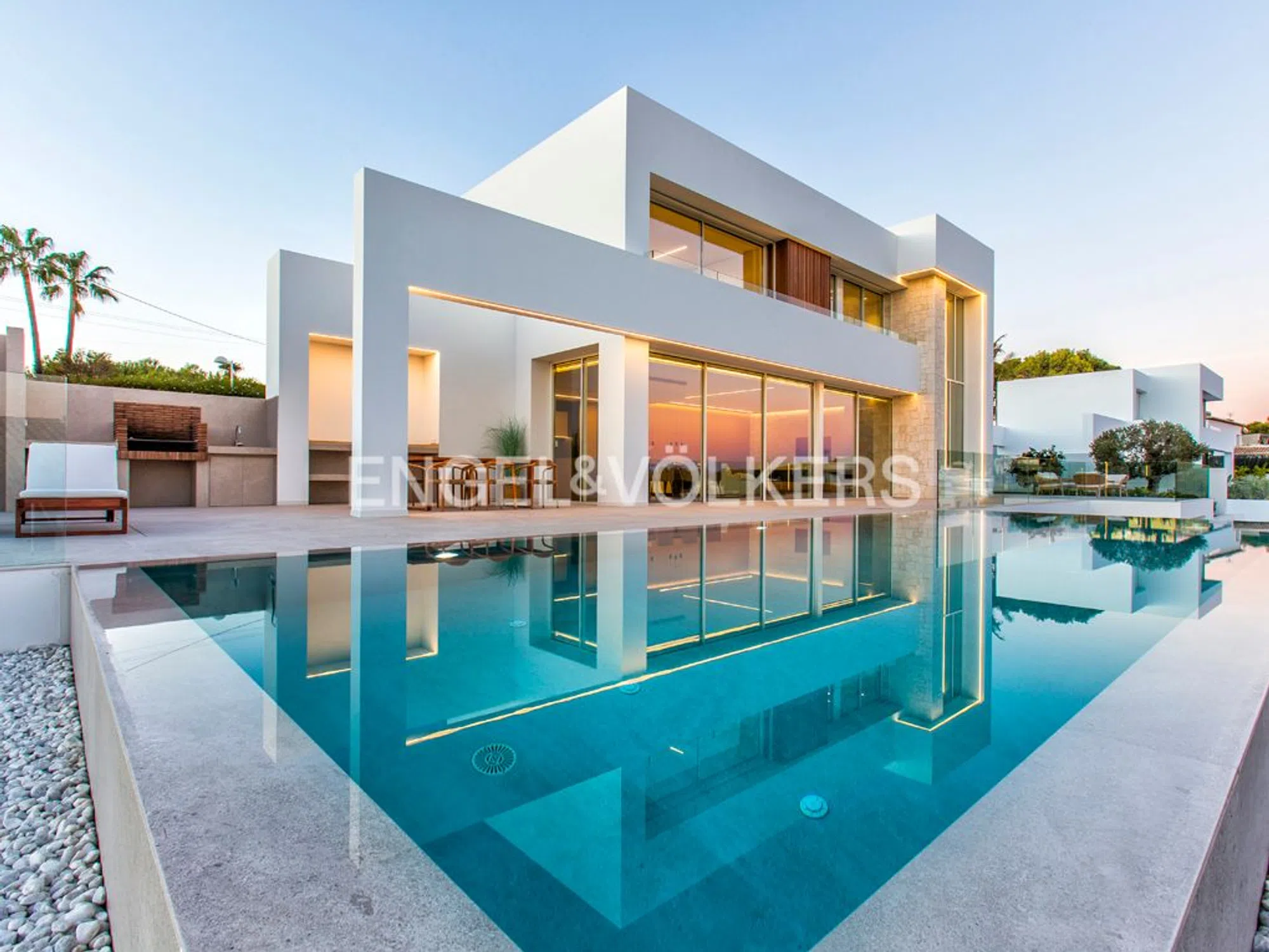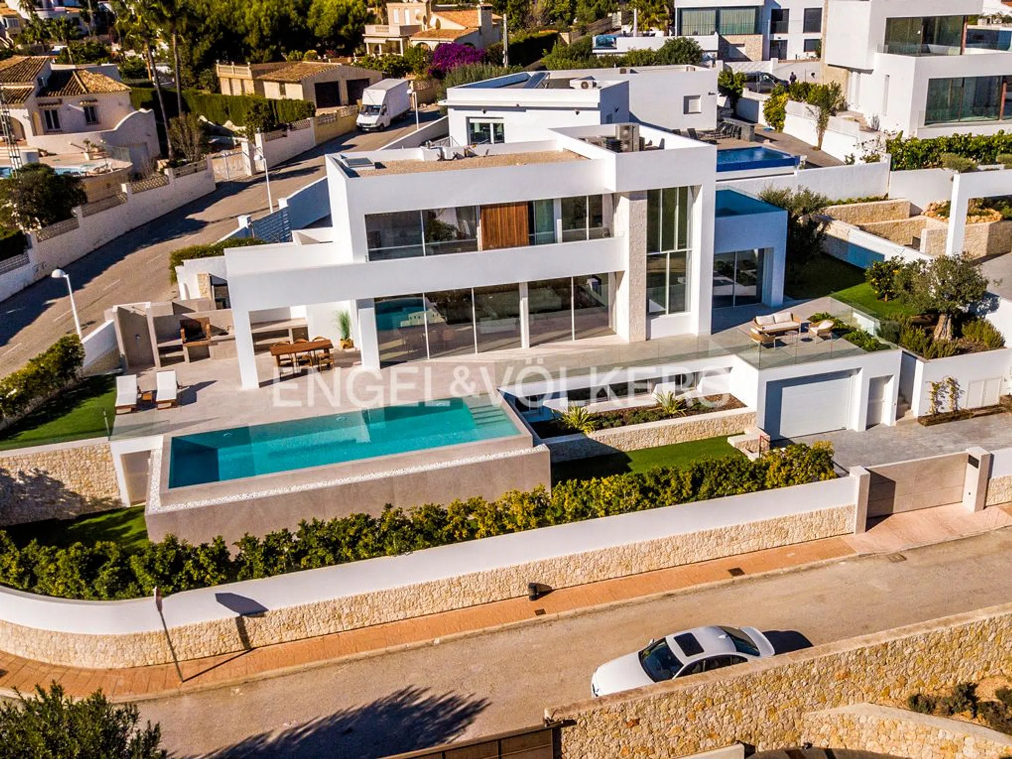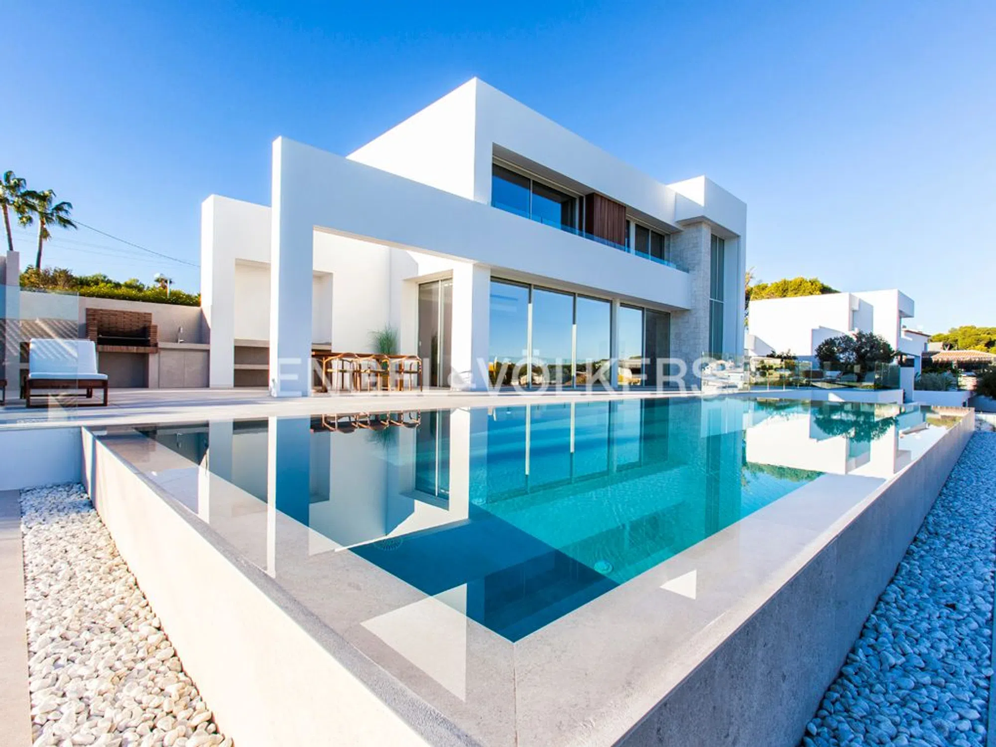 Villa moderna y muy lujosa de diseño contemporáneo en venta en Benissa Costa. Está situada en una zona residencial muy tranquila, a 600 metros de Playa La Fustera y a 750 metros de Cala Pinets, con fácil acceso a Moraira, Calpe y de todo tipo de servicios. La propiedad goza de impresionantes vistas al mar y una orientación sur. Está ubicada en una parcela llana de 800 m2 y tiene una superficie construida de vivienda de 355 m2 distribuida en 2 plantas + sótano de la siguiente manera: La planta principal cuenta con un hall de entrada impresionante, un amplio dormitorio con armarios empotrados y baño en-suite, un aseo de invitados, lavadero despensa, y un amplio espacio abierto que incluye salón, comedor y cocina con isla y chimenea de diseño. Este espacio se conecta con una terraza exterior de 150 m2 y una piscina infinity de forma rectangular climatizada de 42 m2, además de una zona de barbacoa equipada. La planta alta alberga un vestíbulo, dos dormitorios amplios con baños en-suite y una terraza privada, mientras que el sótano ofrece otro dormitorio con baño en-suite, una amplia zona de gimnasio, una zona de oficina, una sala polivalente y un garaje para dos vehículos. La villa destaca por su diseño funcional y vanguardista, con espacios orientados hacia el mar y una distribución que maximiza la amplitud visual. Equipada con muebles de diseño, suelo radiante y climatización por conductos, carpintería exterior Technal, domótica KNX, iluminación LED, entre otros detalles de alta calidad. Además, cuenta con un amplio estacionamiento exterior con pérgola para dos coches y un jardín con sistema de riego automático de bajo mantenimiento.