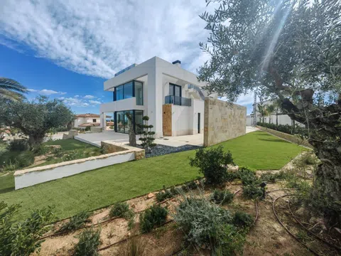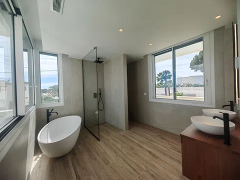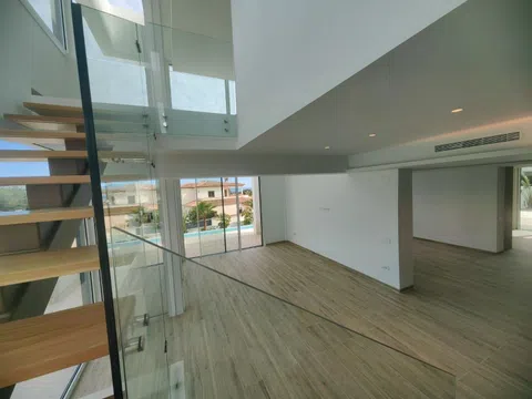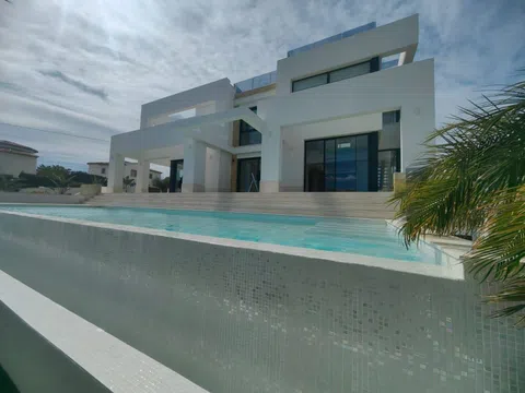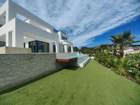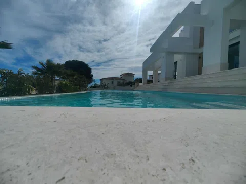 Gelegen op een ruime kavel, beschikt de villa over een indrukwekkend infinity-zwembad dat naadloos samengaat met het adembenemend uitzicht op de Middellandse Zee, waardoor een oase van rust en puur genot ontstaat. De buitenkant van de villa is een symfonie van strakke lijnen en natuurlijke elementen, met een elegante gevel versierd met natuursteen en grote glaspartijen die elke hoek van het huis met natuurlijk licht overspoelen.