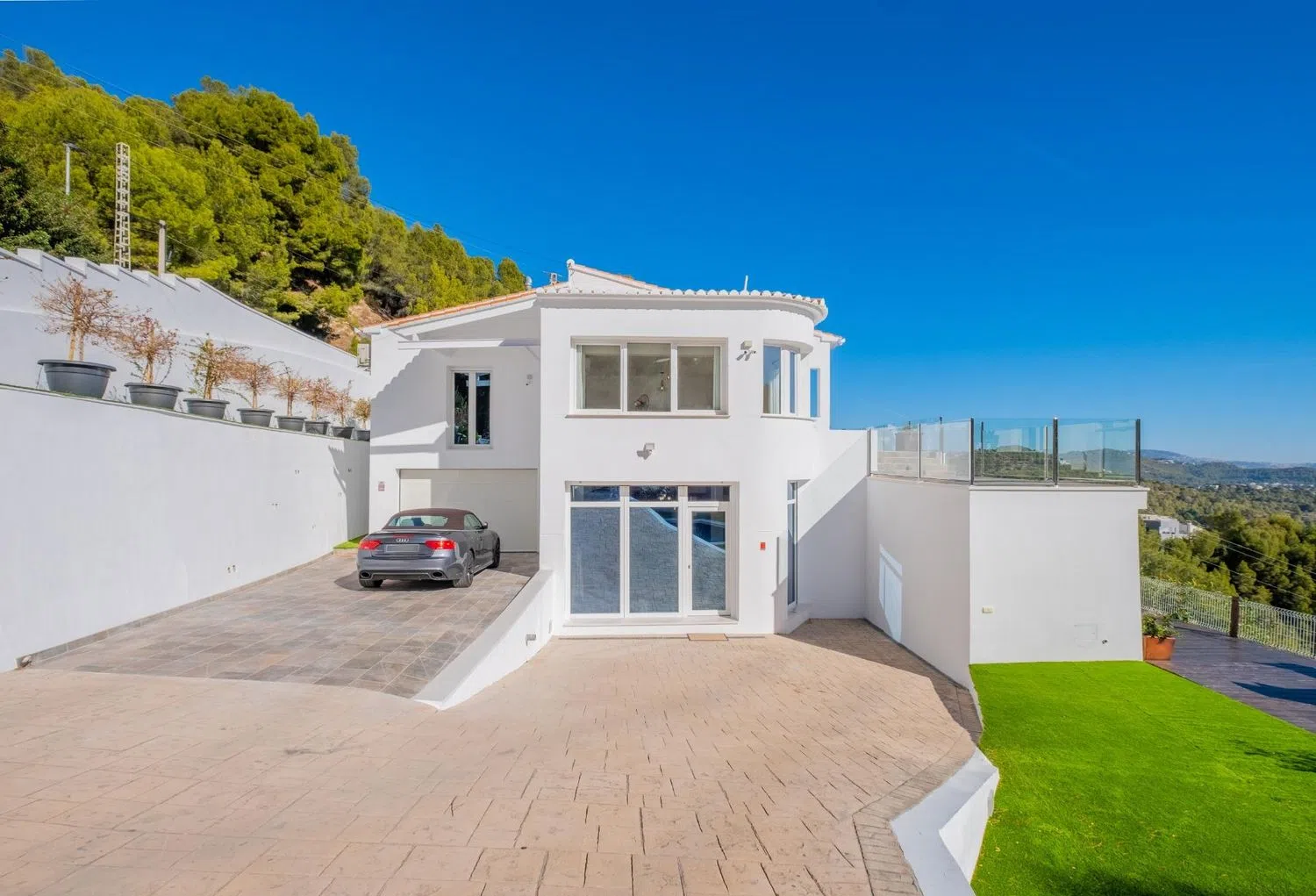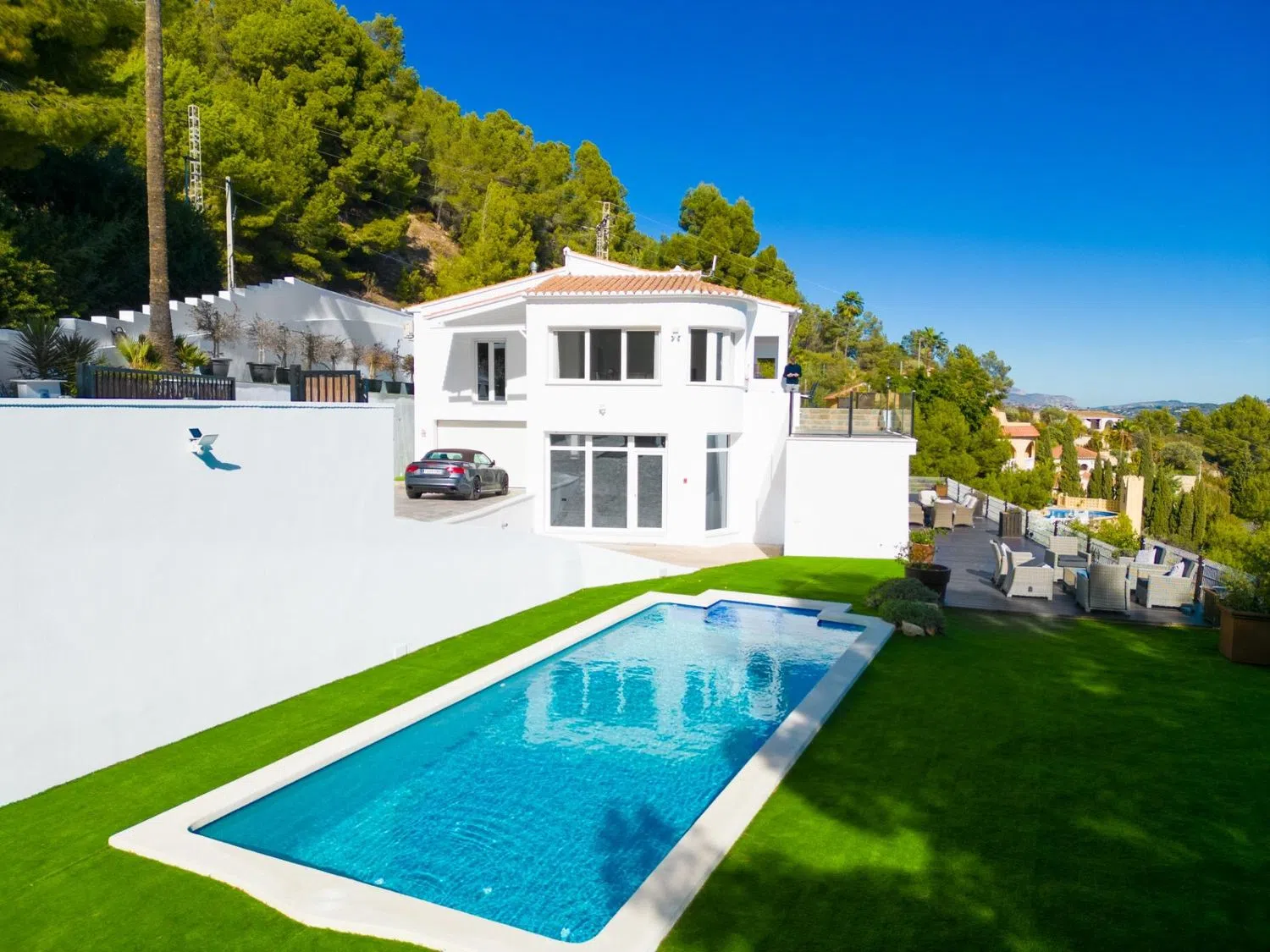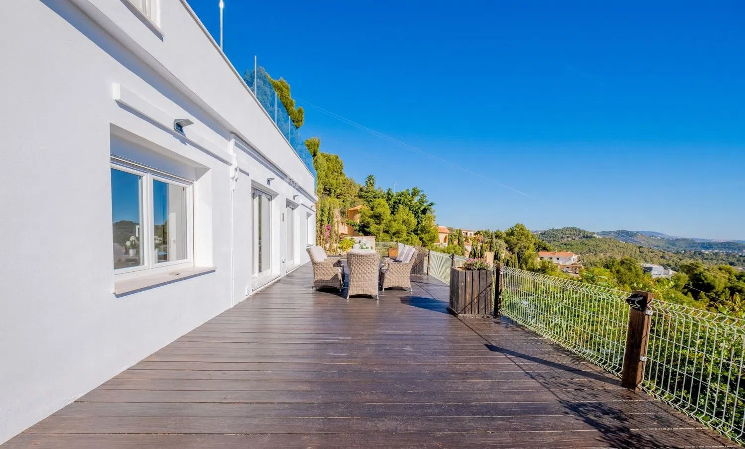 De hoofdslaapkamer heeft ook toegang tot een tweede groot terras van meer dan 112 m², ideaal voor het aanschouwen van zonsondergangen boven de zee. Het huis is volledig gerenoveerd, waardoor het als nieuw oogt: nieuwe deuren, vloeren, keukens, badkamers, elektrische systemen, dubbel glas en elektrische rolluiken, alles eenvoudig bedienbaar vanaf een app. Het centrale gasverwarmingssysteem en de airconditioning in elke kamer zorgen voor optimaal comfort het hele jaar door, terwijl de infraroodcamera's binnen en buiten een gevoel van veiligheid en gemoedsrust bieden. ’s Nachts benadrukt de sfeerverlichting de schoonheid van de villa, zodat je kunt genieten van de rust, de privacy en de ongeëvenaarde uitzichten die deze woning biedt.