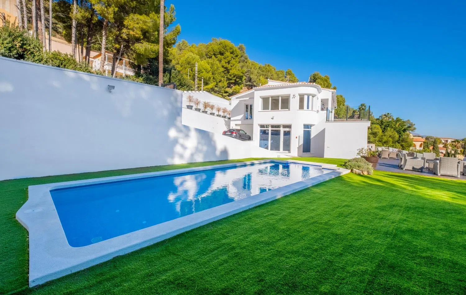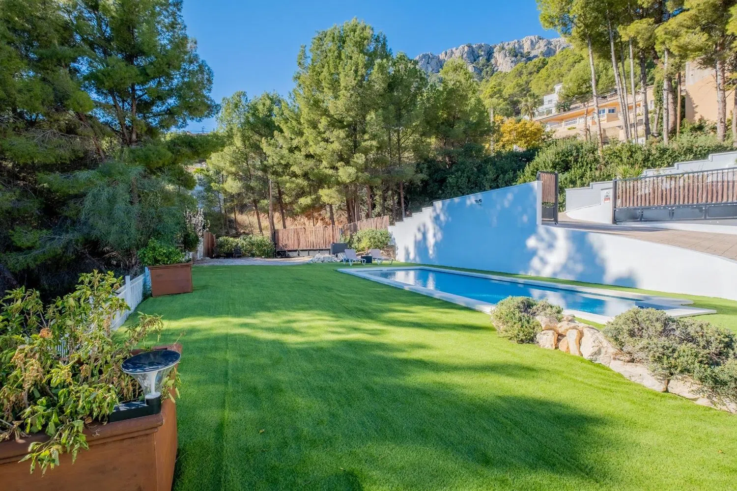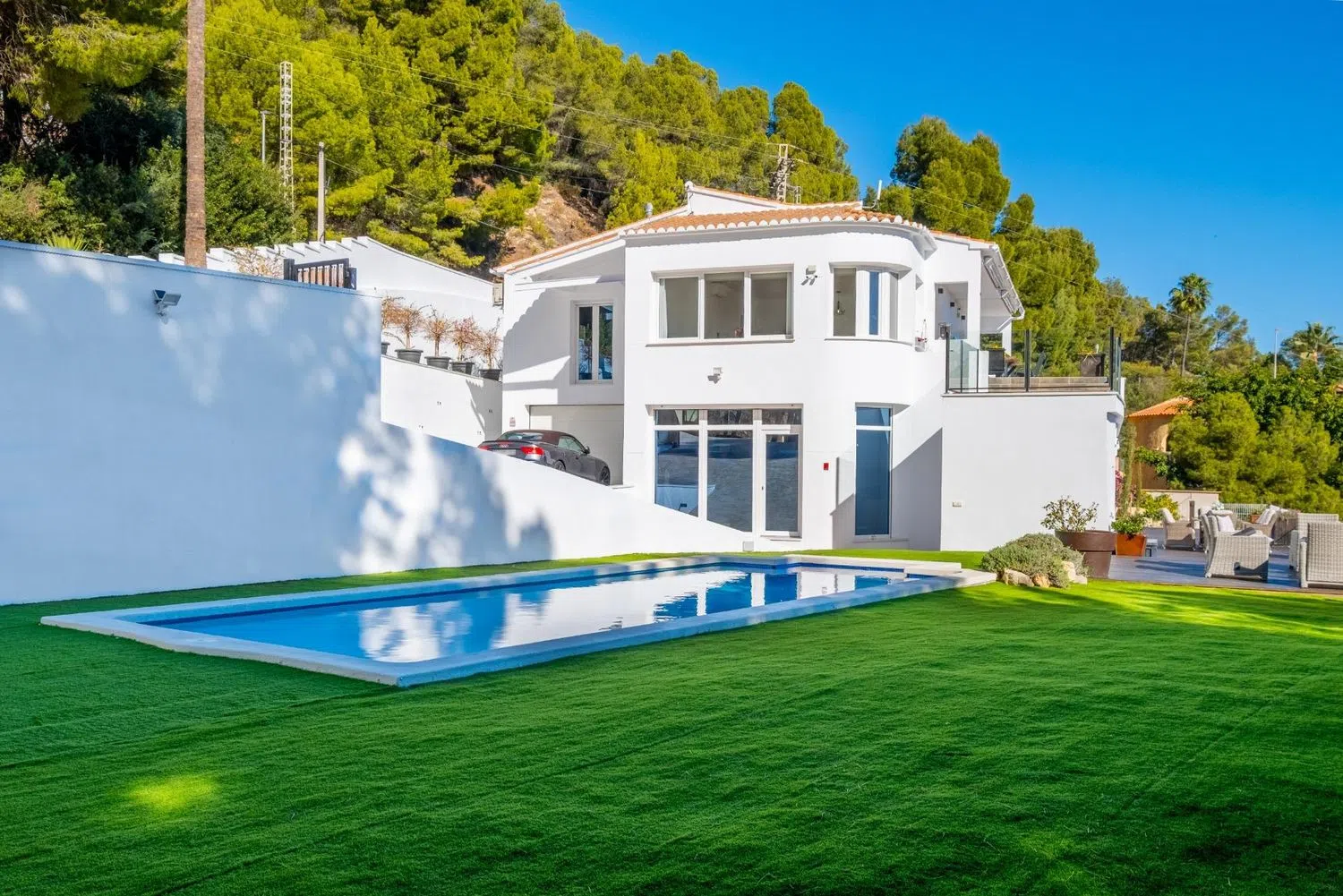 Volledig gerenoveerde villa, gelegen op een zeer ruim perceel van 1400 m², omgeven door de schitterende schoonheid van Calpe en de glinsterende Middellandse Zee. Bij binnenkomst via de twee grote elektrische deuren word je verwelkomd door een prachtige tuin die leidt naar een indrukwekkende glazen entree, welke de toon zet voor elegantie en comfort binnenshuis. De ruime woonkamer, overspoeld met natuurlijk licht dankzij de grote ramen, biedt een warme, uitnodigende sfeer en opent naar adembenemende uitzichten. Deze ruimte stroomt harmonieus over in een moderne, volledig uitgeruste keuken, voorzien van hoogwaardige apparatuur en een ruime eetkamer, perfect voor het ontvangen van gasten en het creëren van culinaire meesterwerken.