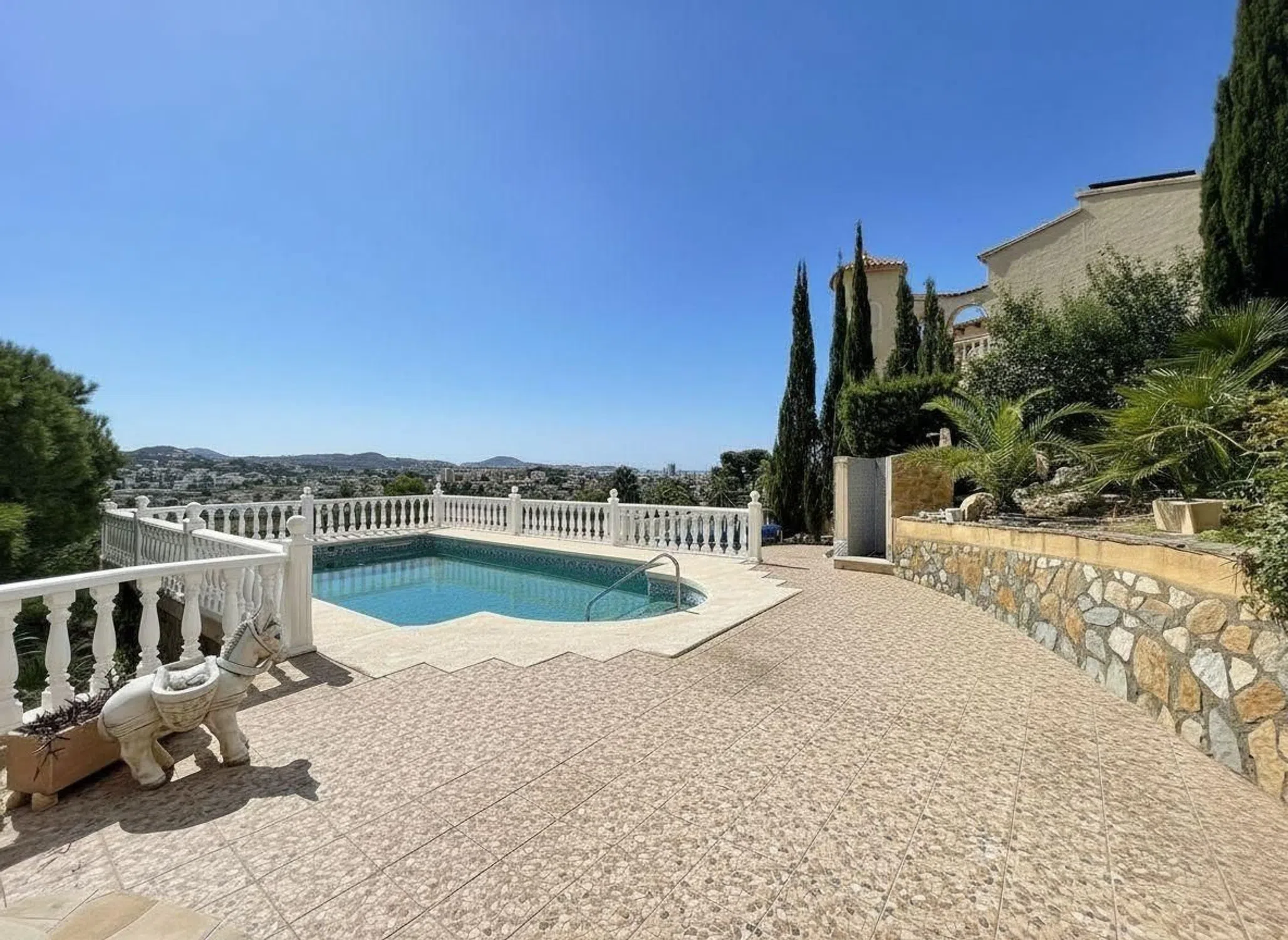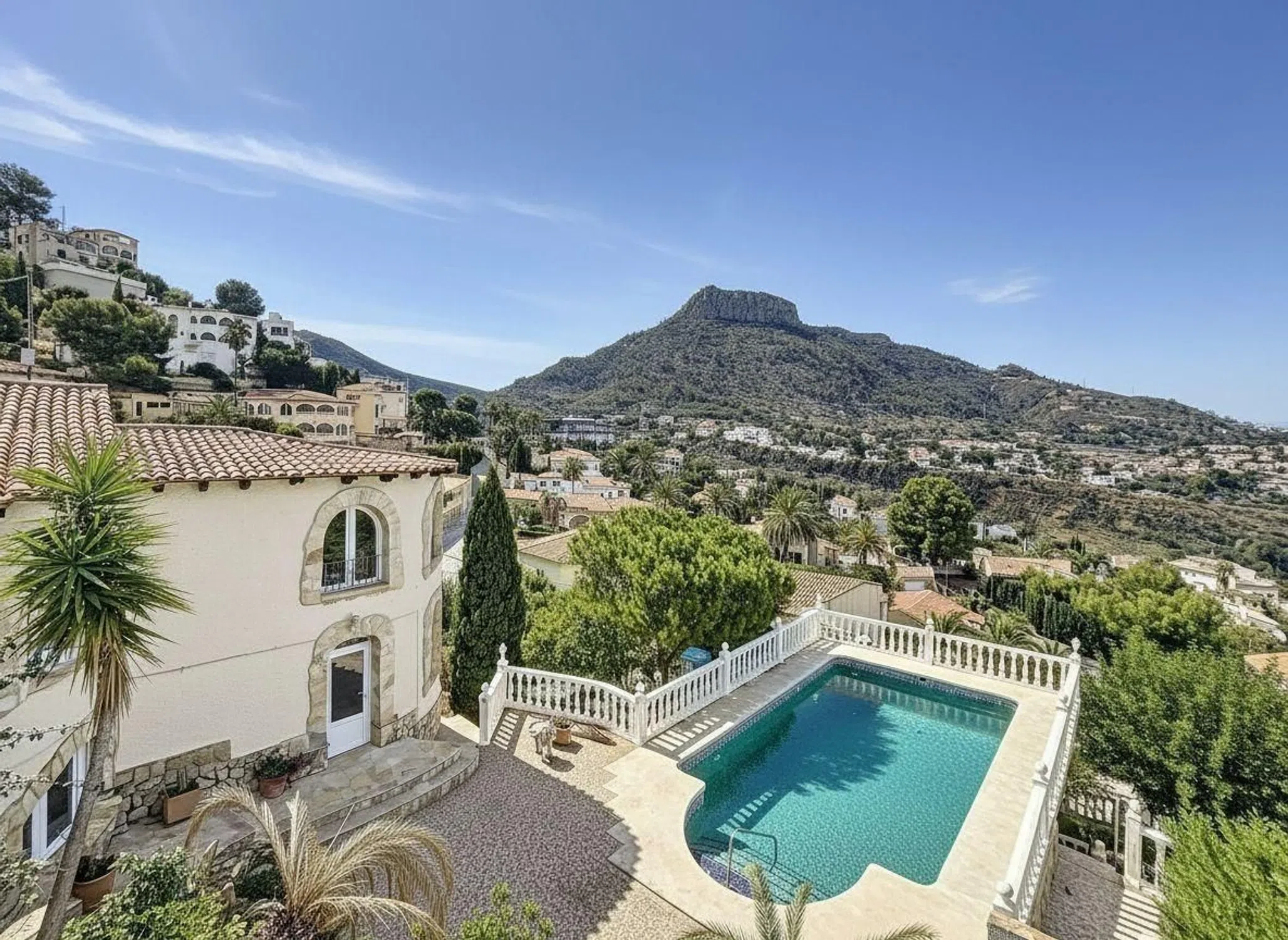 Sumérgete en un estilo de vida donde el lujo tranquilo se encuentra con la espectacularidad del Mediterráneo. Este encantador chalet de 243 m 2 construidos, asentado en una generosa parcela de 1025 m 2 con un desnivel que le otorga un encanto único y privacidad absoluta, te espera en la prestigiosa zona de Maryvilla, Calpe. Un Festín para tus Sentidos Visuales Despierta con la belleza. Cada mañana, serás testigo de un impresionante espectáculo de color: el sol naciente sobre el icónico Peñón de Ifach, visible desde la zona de la piscina y la terraza mirador. Por la noche, la bahía se transforma en un tapiz de luces costeras que puedes contemplar en la quietud. El interior es igualmente cautivador: el salón principal destaca por su techo alto abovedado y vigas de madera vista, bañado por la luz natural que entra por los amplios ventanales, creando un ambiente cálido y sofisticado. El Sonido del Paraíso Escucha el suave murmullo de las hojas en tu jardín exuberante, donde la vegetación variada, árboles frutales y cactus componen una sinfonía natural. Disfruta de la risa de tus invitados en la zona de barbacoa techada, el lugar perfecto para fiestas inolvidables con vistas panorámicas. La cocina, moderna y elegante (con encimera negra y cocina de gas), está estratégicamente conectada al salón para que el hilo de la conversación nunca se rompa mientras cocinas. Sensaciones de Calidez y Potencial Siente la comodidad y el refugio. La chimenea en el salón te ofrece una sensación de abrigo en las noches frescas. Accede a la vivienda desde tres puntos diferentes, sintiendo la libertad y el potencial de su distribución en dos niveles. En la planta baja, la suite principal es un santuario de relajación: amplia, con vestidor y un gran baño en suite equipado con bañera de hidromasaje y columna de ducha. El jardín, con sus múltiples accesos, te invita a recorrer y disfrutar cada rincón de la parcela. La propiedad cuenta además con dos garajes (uno cubierto y otro descubierto) y una zona de barbacoa cubierta, que añaden una funcionalidad práctica indispensable. Este chalet de 1980, con un gran potencial, no solo es ideal para disfrutarlo como residencia habitual o vacacional, sino que ofrece una excelente rentabilidad como alquiler turístico.