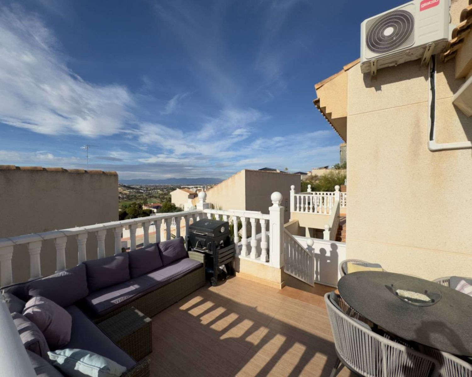 El aire acondicionado, los armarios empotrados y las dos cocinas incorporan comodidades modernas que se integran a la perfección en el diseño de la propiedad. Con la opción de muebles negociables, se ofrece flexibilidad para personalizar el espacio, mientras que el estacionamiento en la calle proporciona comodidad tanto a los residentes como a sus invitados. Las vistas hacia el jardín añaden un toque de serenidad a la villa, creando un entorno idílico para tu día a día.