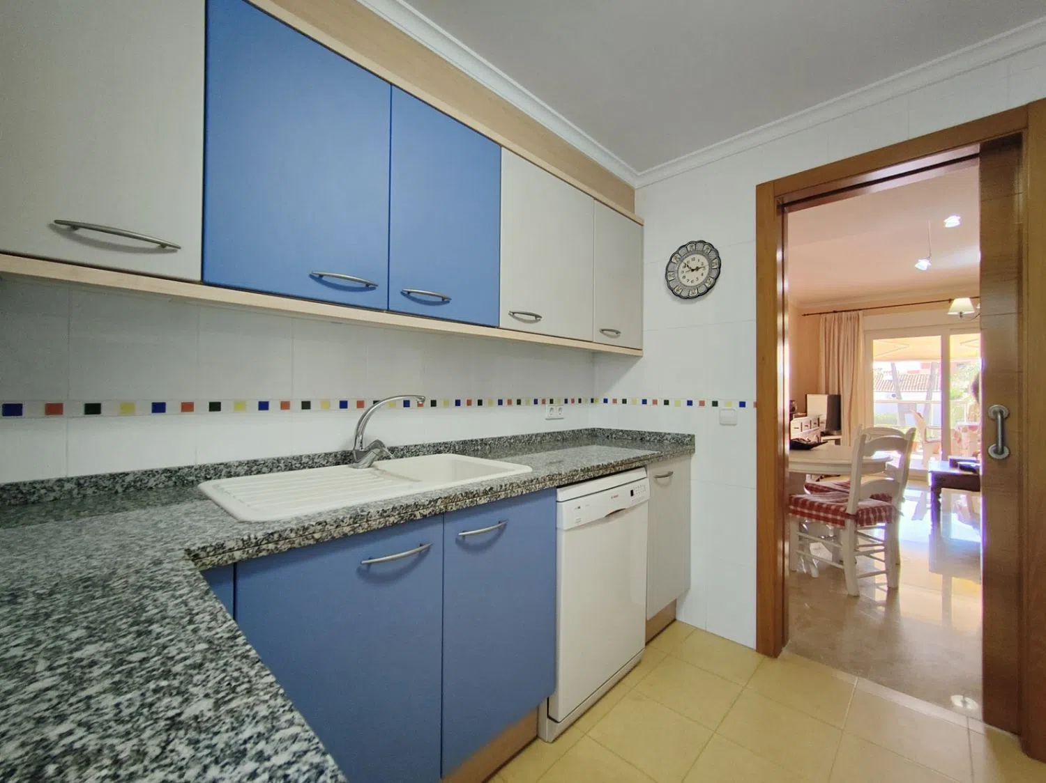 Het appartement beschikt over een ruime woon-eetkamer die uitkomt op een overdekt terras van 14 m², ideaal om te genieten van panoramisch uitzicht en momenten van rust. De aparte keuken is volledig uitgerust en heeft een bijkeuken die extra functionaliteit biedt. Met twee dubbele slaapkamers en twee badkamers, waarvan een en suite en elegant bekleed met marmer, is deze ruimte perfect voor zowel gezinnen als koppels die op zoek zijn naar comfort en ruimte.