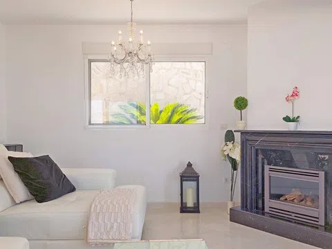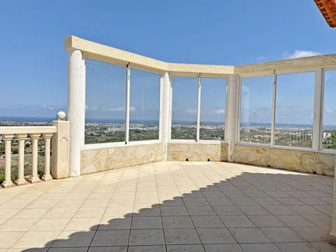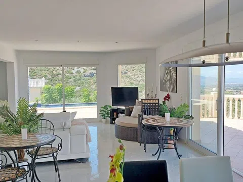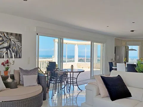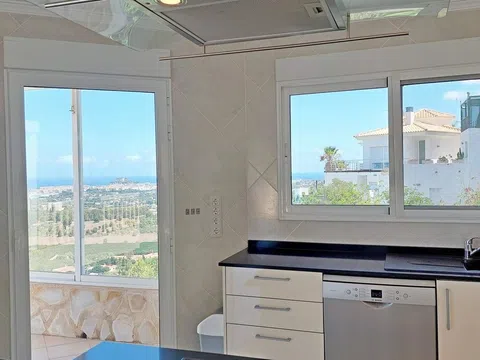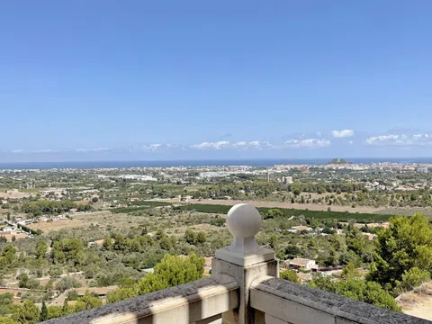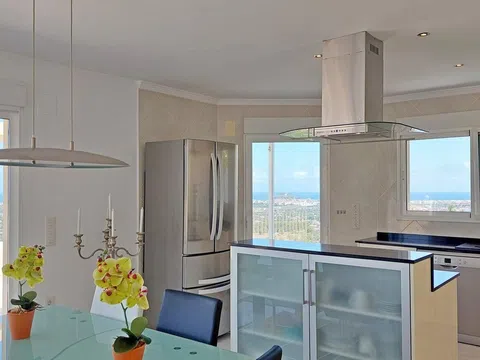 Villa con vistas panorámicas en cada uno de sus 5 dormitorios, con dos piscinas, un apartamento de invitados completo e independiente y una gran terraza. Una casa que ofrece una gran intimidad. La villa, con muy buena distribución, tiene una rampa de acceso para coches desde la cual se llega a la planta principal con un enorme salón comedor con chimenea y cocina americana completa con isla. Desde este nivel se accede directamente a una terraza con una piscina "infinity" en la que además hay un gran cuarto de almacén. El salón está franqueado por una gran terraza con unas hermosas vistas panorámicas de Denia y su castillo, de las huertas de naranjos, del mar y de las montañas. Bajando por una escalera interior se accede a la planta intermedia, con tres dormitorios dobles. El mayor de estos dormitorios tiene además un vestidor. Dos de los dormitorios tienen vistas directas al mar. Desde el tercer dormitorio, con baño en-suite, se da paso a una segunda piscina al este, también con vistas. Bajando una planta más llegamos a un apartamento de invitados independiente. En él hay dos dormitorios dobles con baño propio y un comedor con una cocina completa y un altillo a modo de salón. Esta parte de la casa tiene una segunda entrada. Persianas eléctricas, mosquiteras en todas las ventana, ventanas oscilo-batientes, armarios empotrados. Estado impecable. Una casa para disfrutar con familia y amigos de Denia y de sus playas, marinas, gastronomía y dejarse conmover por la belleza de las puestas del sol y de la pureza del aroma del azahar.