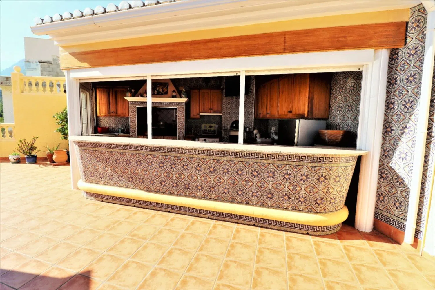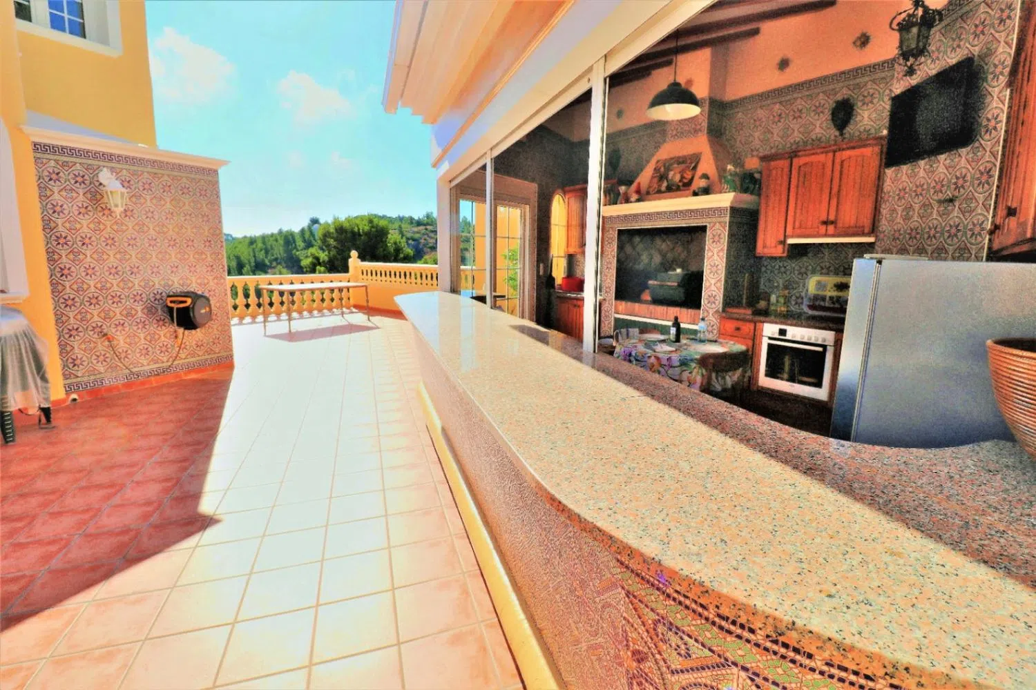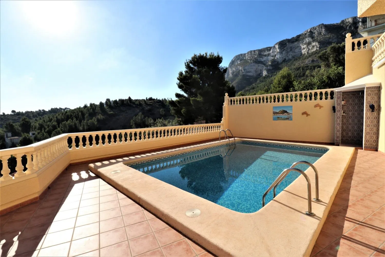 Deze indrukwekkende villa in mediterrane stijl, gelegen in Dénia, biedt adembenemende panoramische zeezichten. Slechts enkele minuten van het stadscentrum en de stranden bevindt zich deze luxe woning op een perceel van 700 m² met een gevel gericht naar de zee, wat een bevoorrechte locatie garandeert. De villa is verdeeld over drie verdiepingen. Bij binnenkomst vindt u een elegante entree die leidt naar een ruime hal. Op de begane grond bevindt zich een grote woon-eetkamer en een moderne keuken, beide met directe toegang tot de balkons en een charmant terras, perfect om van het mediterrane klimaat te genieten. Daarnaast is er op deze verdieping een slaapkamer en een badkamer. Vanuit de hal is er toegang tot een zomerse keuken op een ruime zuidoostelijk georiënteerde terras, ideaal voor maaltijden in de buitenlucht. Ook is er een buitentoilet voor gasten. Een elegante wenteltrap leidt naar de toren van de villa, die een tweepersoons slaapkamer met en-suite badkamer herbergt. Vanaf hier zijn er twee terrassen met spectaculaire uitzichten op zowel zee als bergen, wat een unieke en ontspannende sfeer biedt.