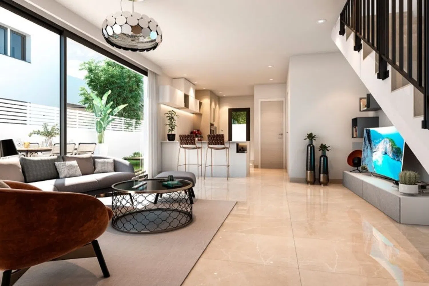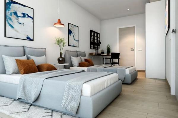Met een ontwerp over twee niveaus biedt de villa op de begane grond een ruime woonkamer die geïntegreerd is met een eetgedeelte, een moderne volledig uitgeruste Amerikaanse keuken, een tweepersoonsslaapkamer en een complete badkamer. Op de bovenverdieping bevinden zich twee tweepersoonsslaapkamers, elk met een eigen en-suite badkamer. Er is de mogelijkheid om de slaapkamer op de begane grond te verwijderen, waardoor een grotere leefruimte ontstaat die aan de behoeften van elke bewoner is aangepast (afhankelijk van bevestiging vóór voltooiing van de bouw).