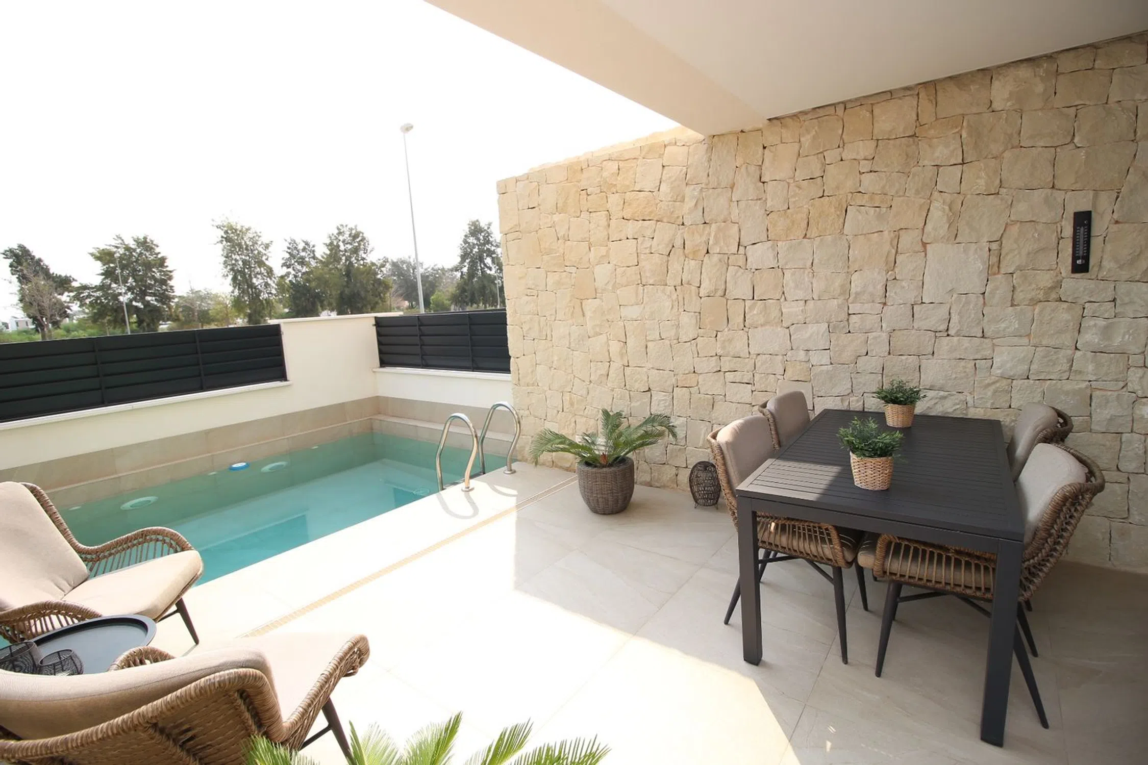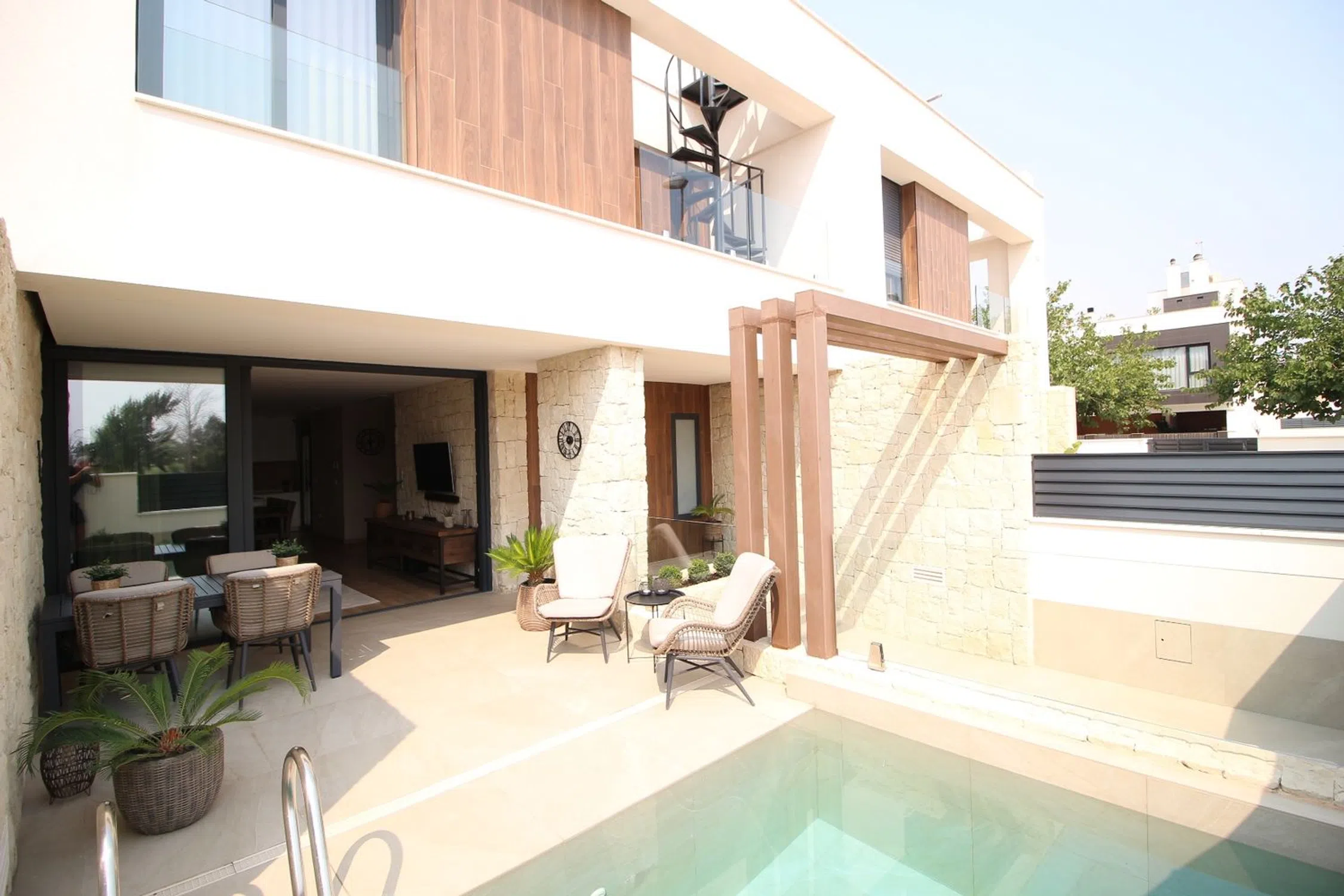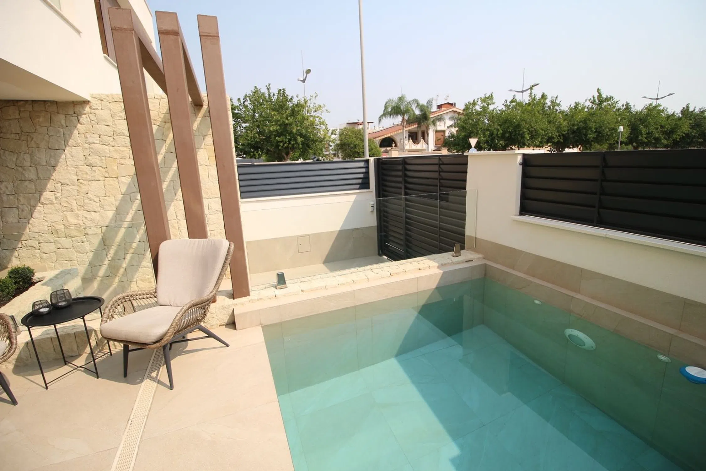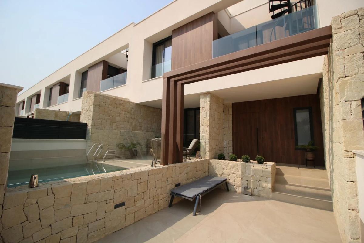 Esta elegante villa combina la comodidad moderna con el estilo de vida mediterráneo, ofreciendo interiores luminosos y excelentes espacios al aire libre. En la planta baja se encuentra un amplio vestíbulo que conduce a un gran salón-comedor con puertas panorámicas que se abren directamente a la piscina y a la terraza. También hay una cocina moderna, patio, lavadero y un baño, todo diseñado con practicidad y estilo. La planta superior dispone de tres dormitorios y dos baños. La suite principal incluye un vestidor, baño privado en suite y acceso a un balcón. Los otros dos dormitorios cuentan con armarios empotrados y comparten un baño. Desde esta planta también se accede directamente al gran solárium privado, perfecto para relajarse o recibir invitados. Entre los extras se incluyen paneles solares, descalcificador de agua, sistema de agua potable y dos aparatos de aire acondicionado por conductos con función frío/calor. En el exterior destaca la piscina privada con su terraza soleada, ideal para disfrutar del clima mediterráneo en total privacidad. Esta casa lo tiene todo para ser una residencia permanente cómoda o un refugio vacacional ideal en la encantadora zona de Dolores.
