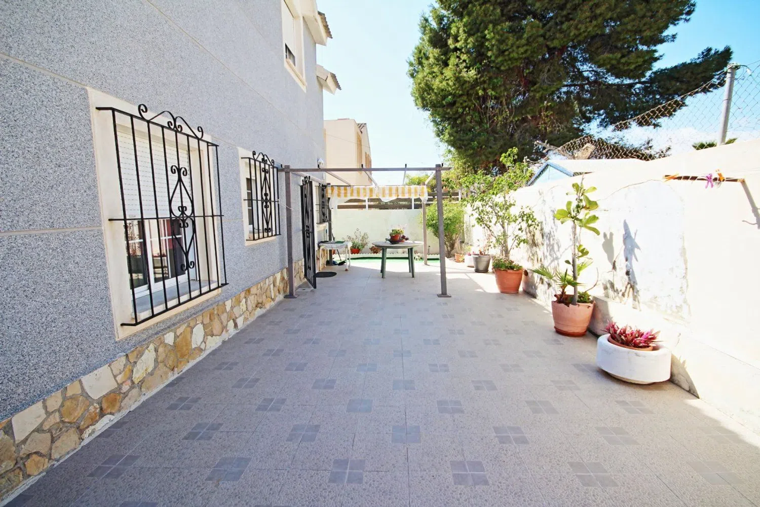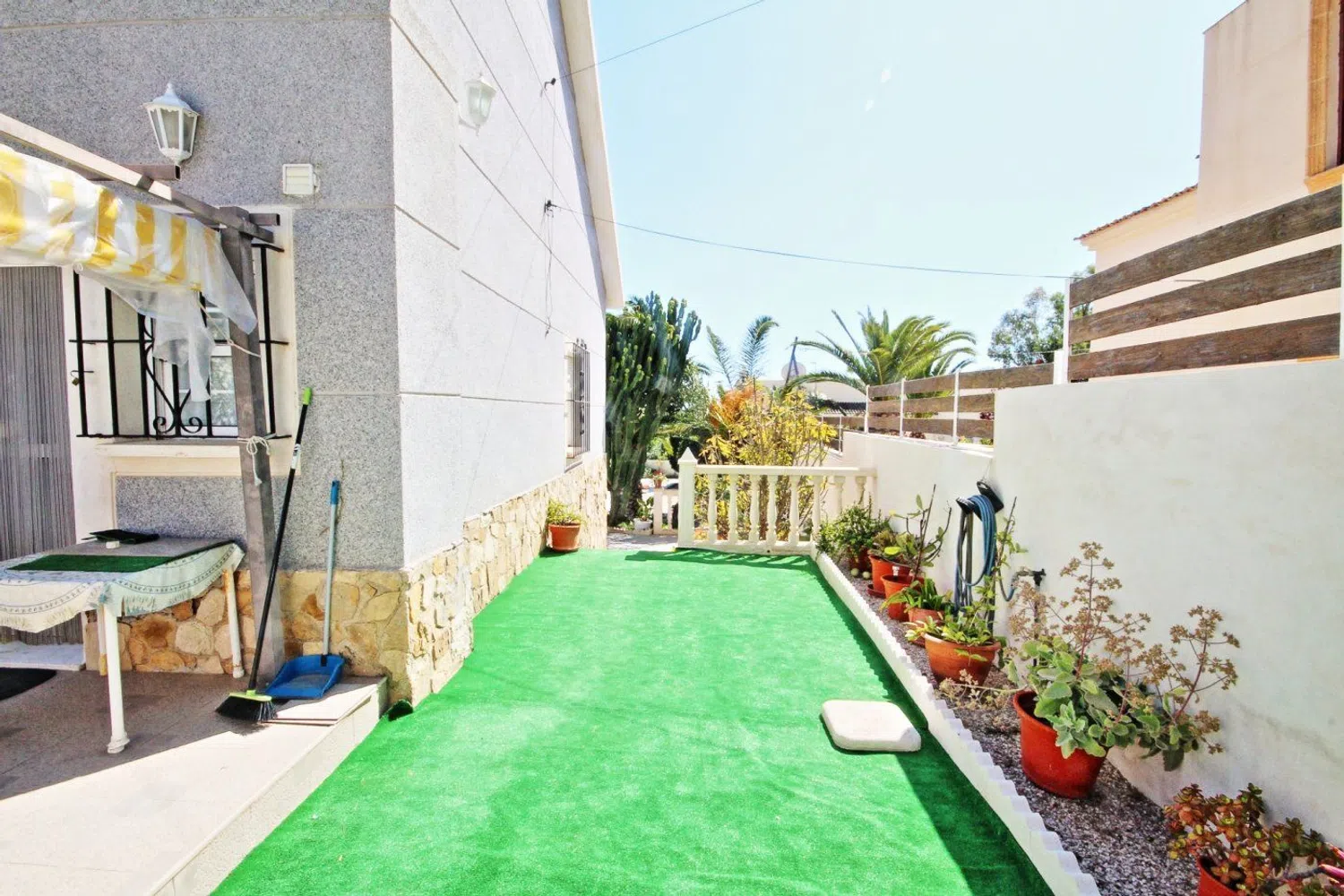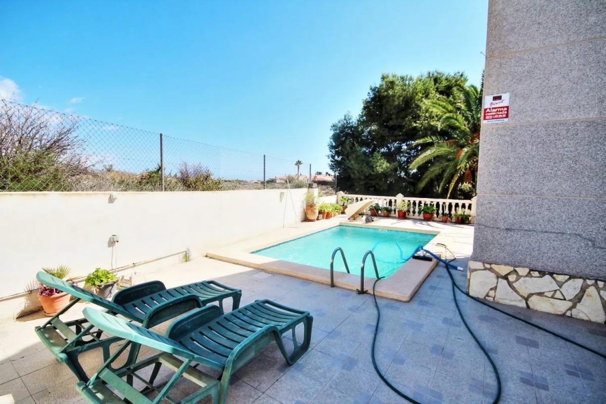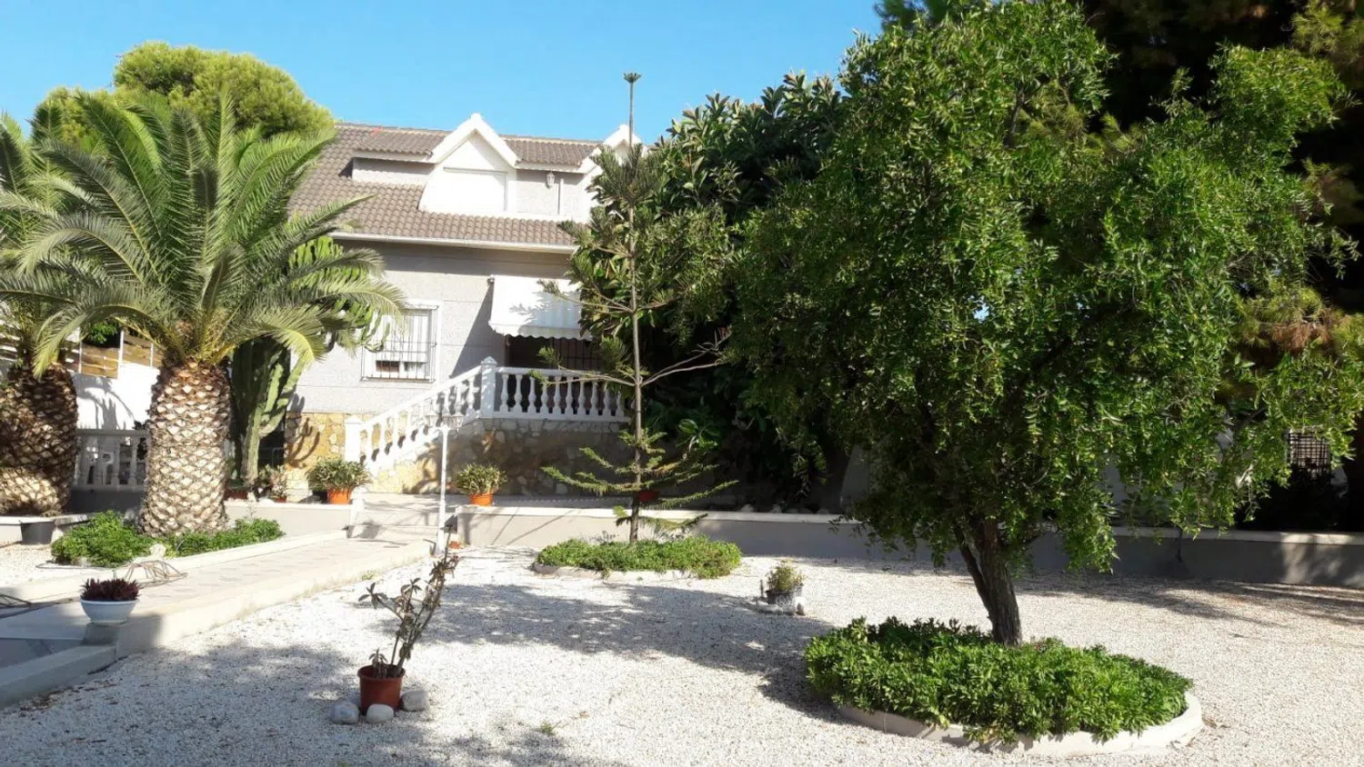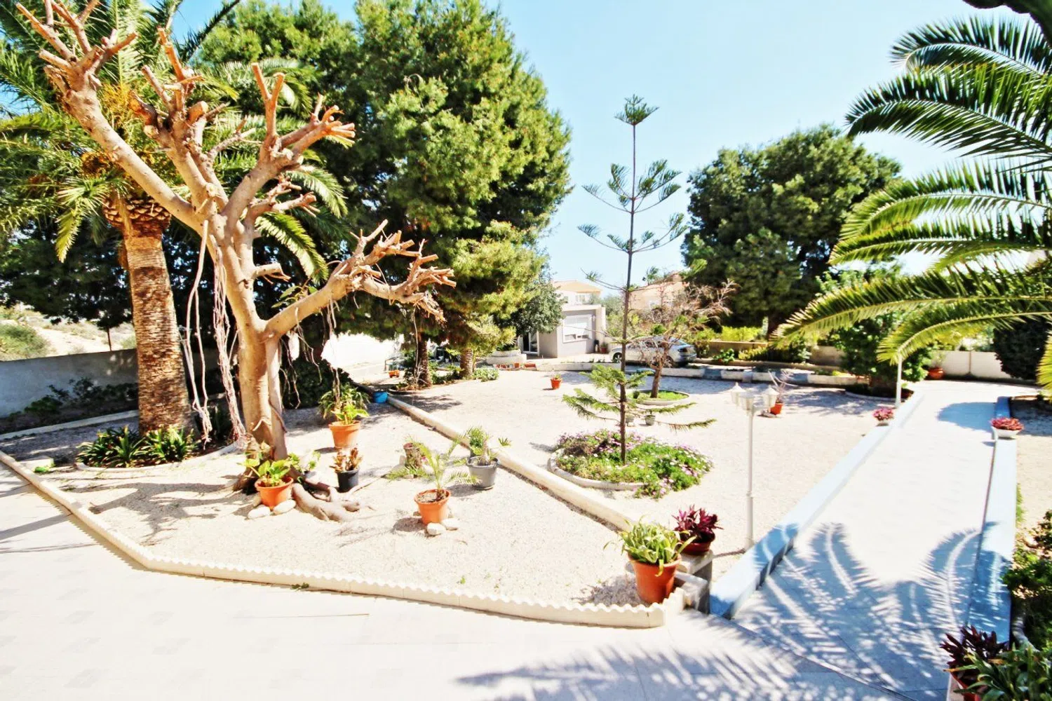 De woning valt op door zijn klassieke bouwstijl en een uitgebreide tuin met een gevarieerde lokale flora, waaronder palmbomen, dennen en een weelderige ficus die schaduw biedt. In de tuin is er ook een zwembad, dat wordt aangevuld met een ruime terras- en barbecuezone, naast een grasveld dat ideaal is voor familiebijeenkomsten gedurende het hele jaar.