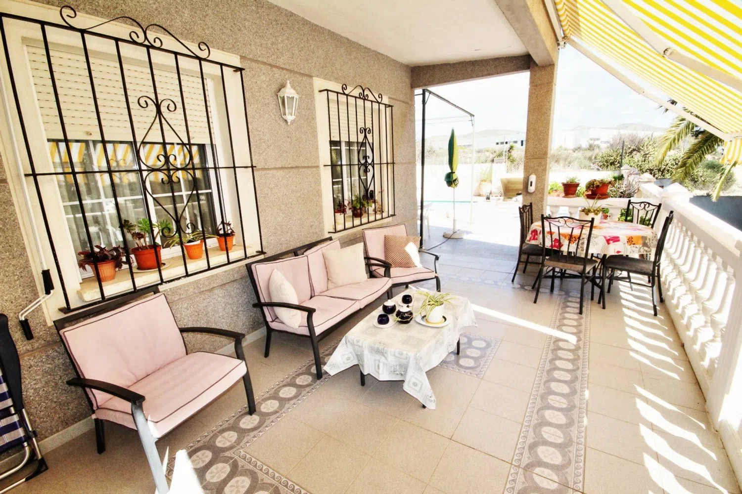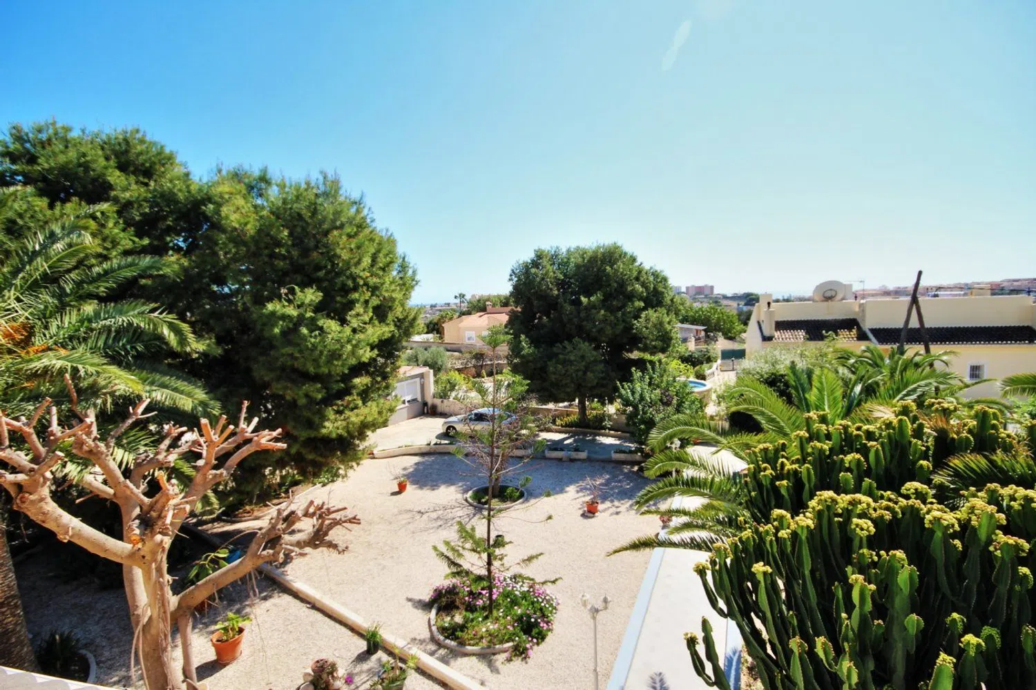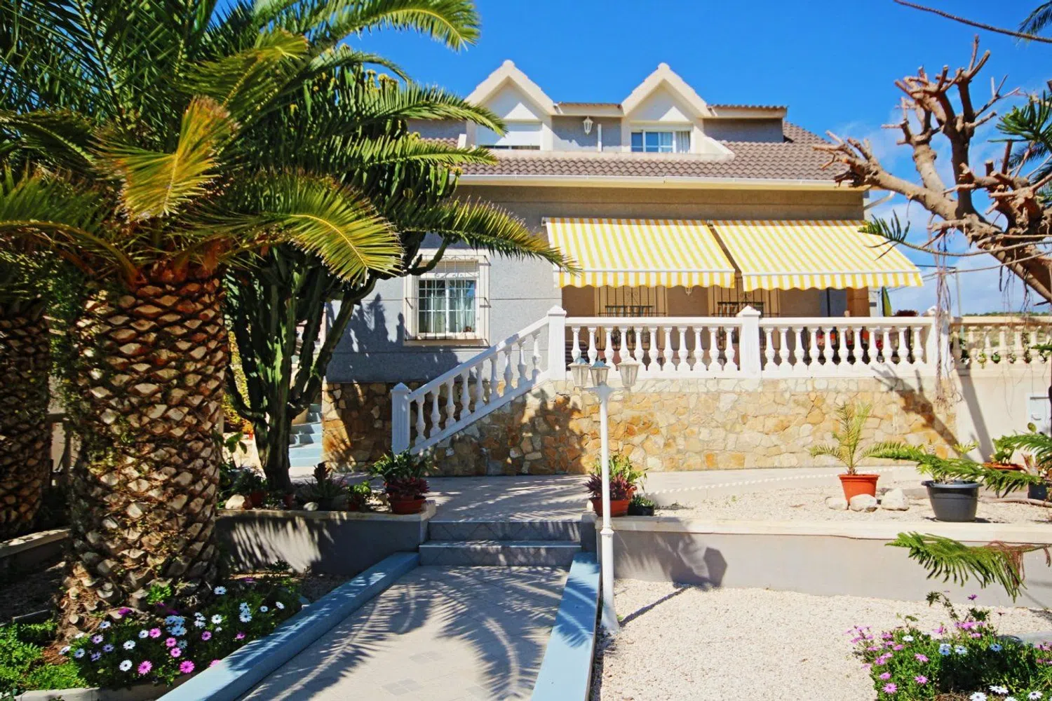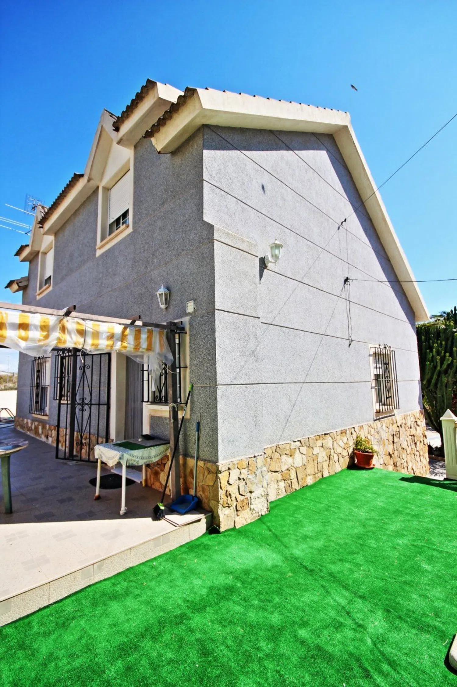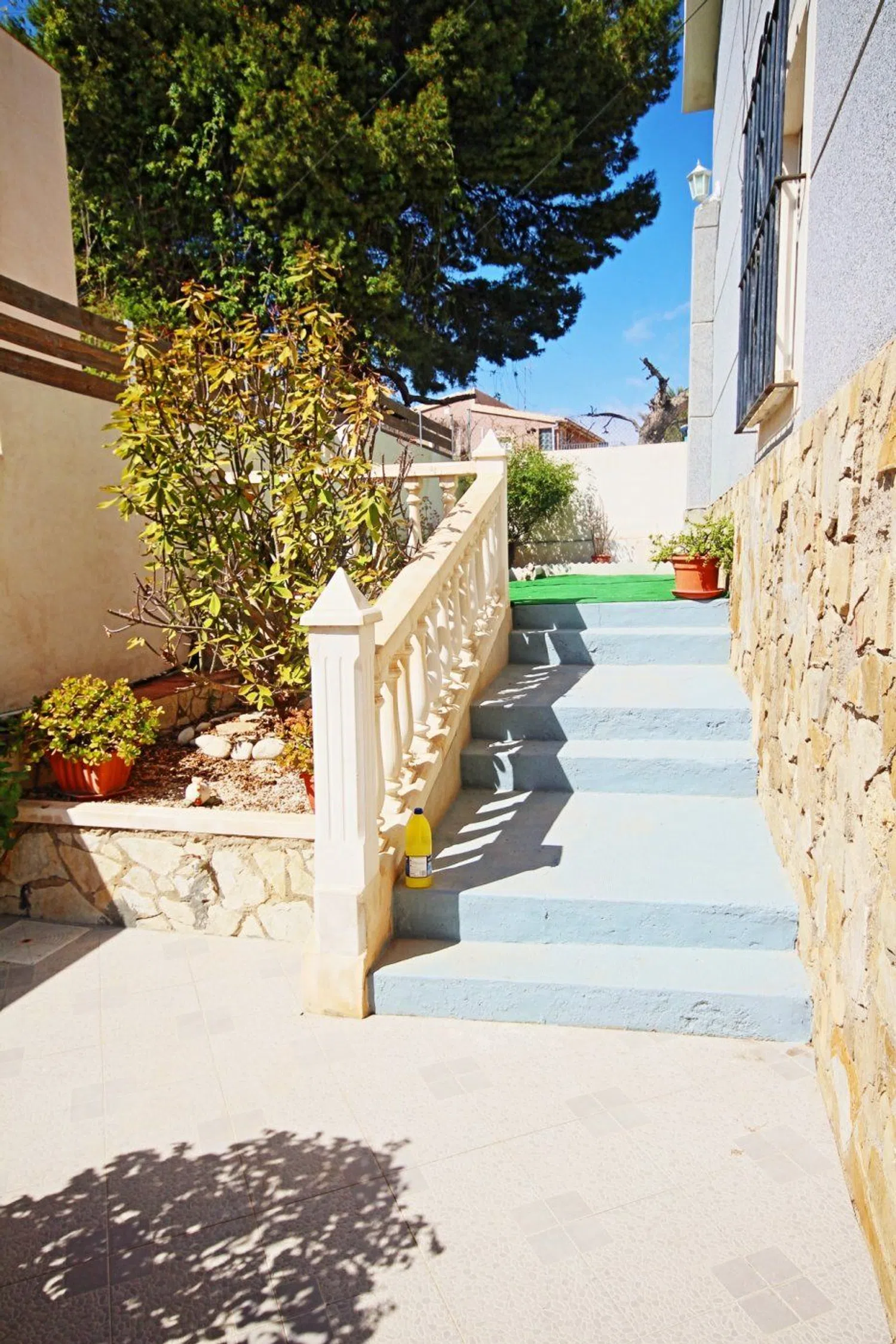 De woning valt op door zijn klassieke bouwstijl en een uitgebreide tuin met een gevarieerde lokale flora, waaronder palmbomen, dennen en een weelderige ficus die schaduw biedt. In de tuin is er ook een zwembad, dat wordt aangevuld met een ruime terras- en barbecuezone, naast een grasveld dat ideaal is voor familiebijeenkomsten gedurende het hele jaar.