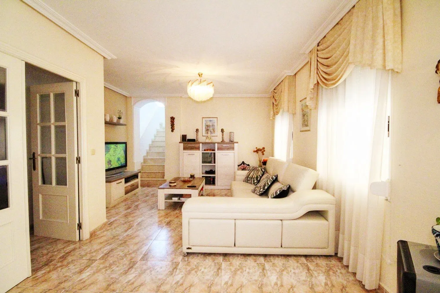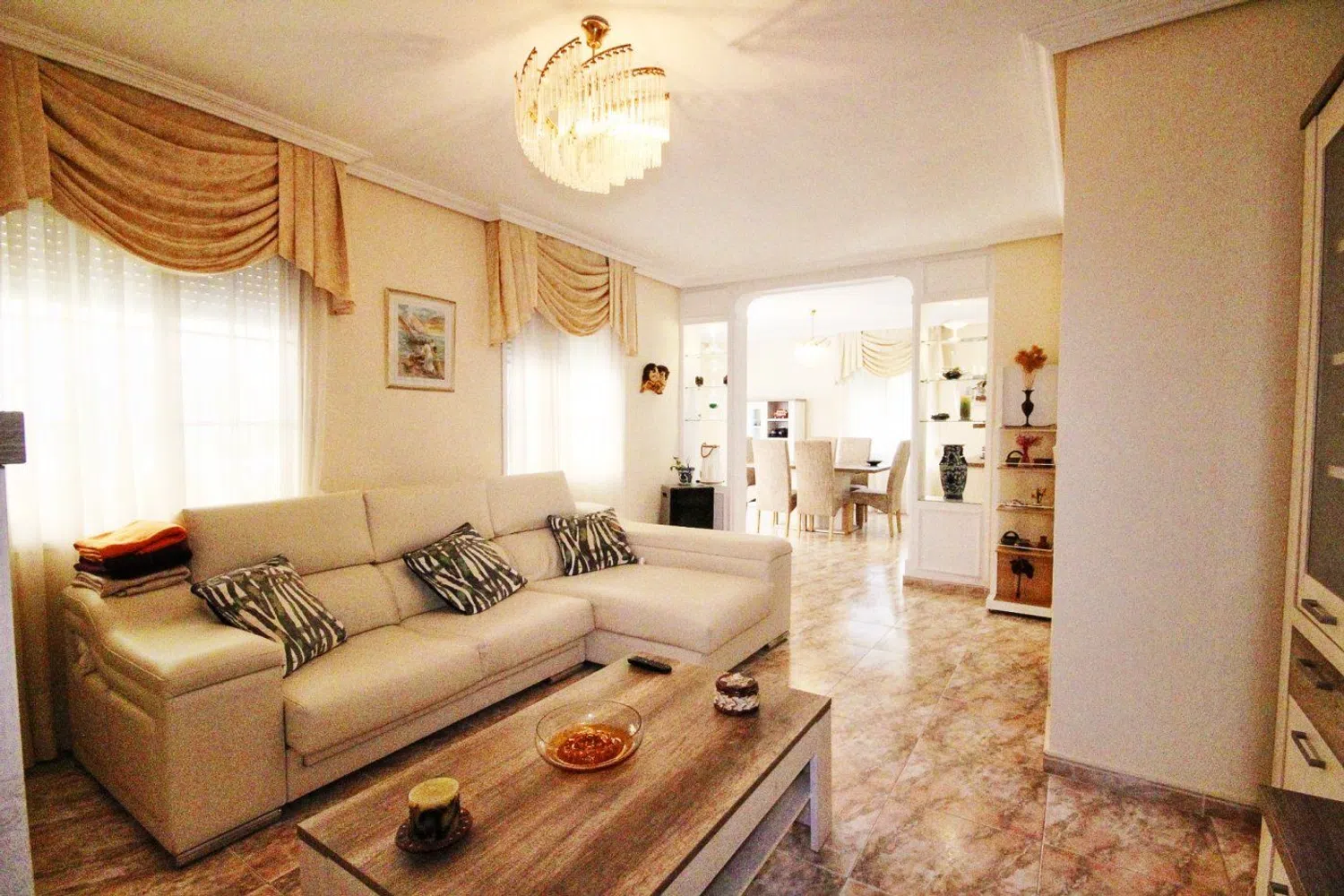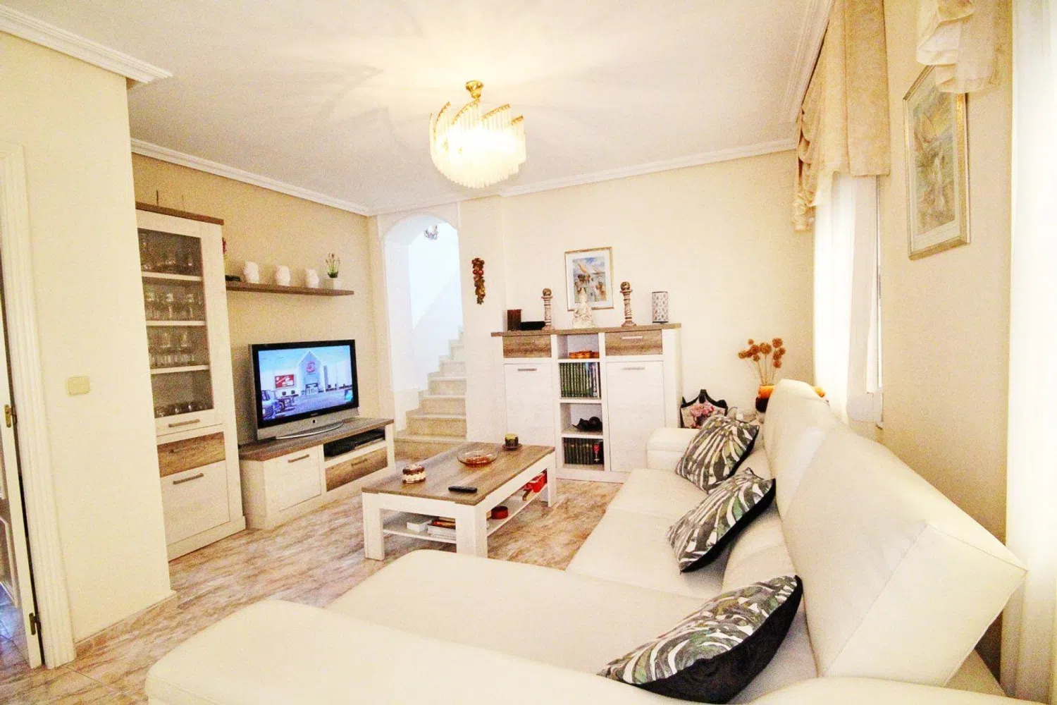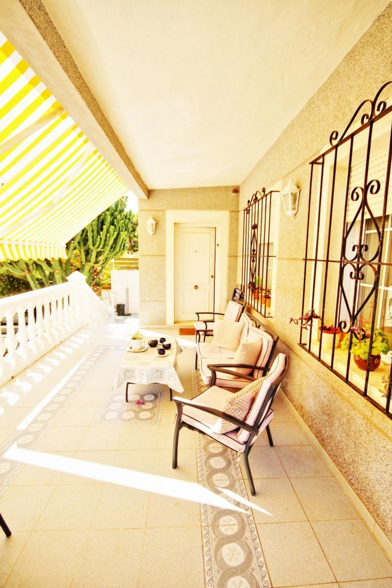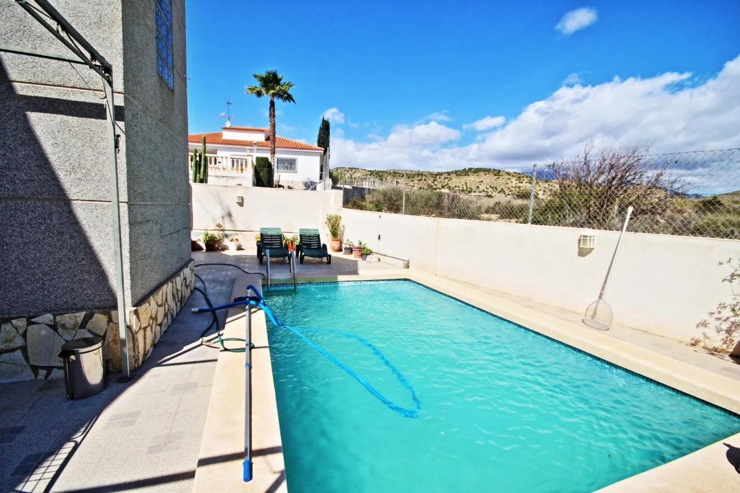 De woning valt op door zijn klassieke bouwstijl en een uitgebreide tuin met een gevarieerde lokale flora, waaronder palmbomen, dennen en een weelderige ficus die schaduw biedt. In de tuin is er ook een zwembad, dat wordt aangevuld met een ruime terras- en barbecuezone, naast een grasveld dat ideaal is voor familiebijeenkomsten gedurende het hele jaar.