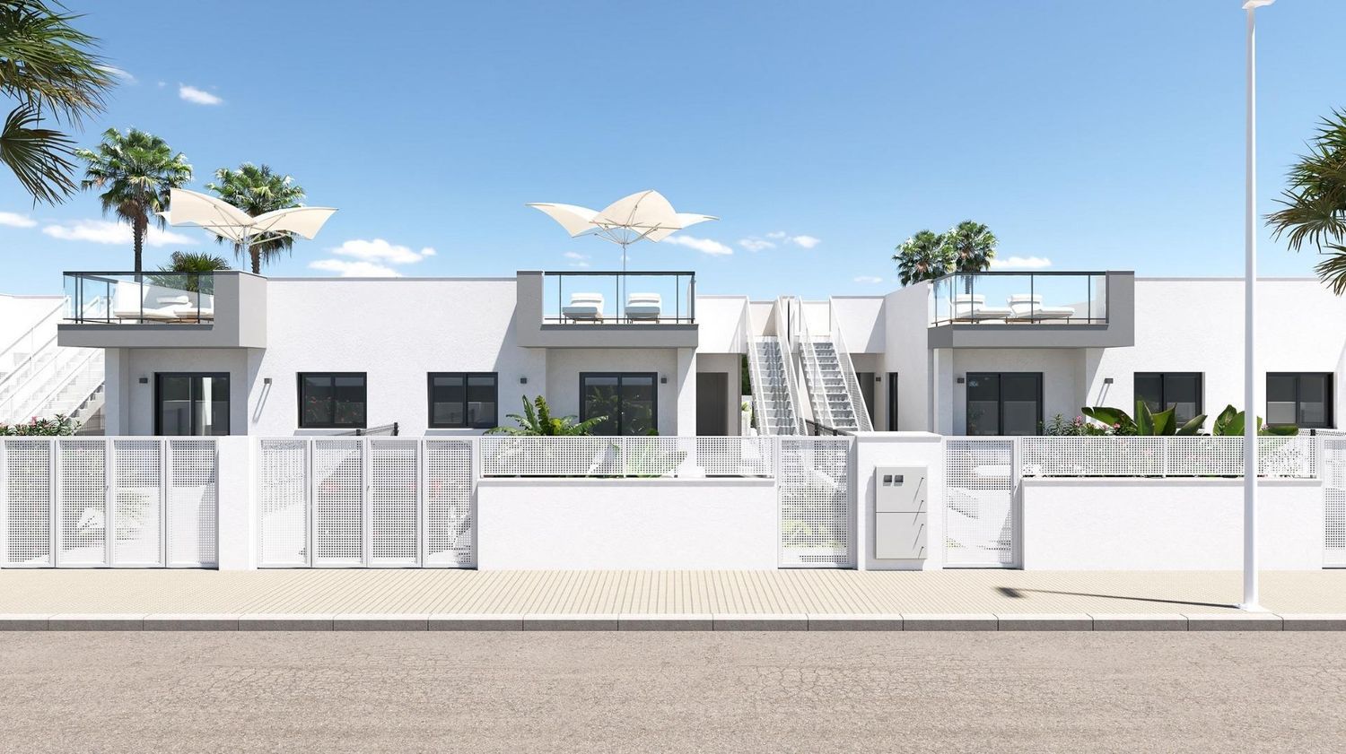 Residencial de obra nueva en un entorno privilegiado, donde la modernidad se encuentra con la comodidad. Este complejo de adosados y pareados cuenta con una encantadora piscina comunitaria y ofrece viviendas de una sola planta, diseñadas para maximizar el confort. Las casas disponen de 2 o 3 dormitorios, 2 baños, una cocina americana integrada en el salón, así como una terraza, jardín privado y solárium. Las zonas comunitarias están perfectamente cuidadas, proporcionando un ambiente relajante para disfrutar del tiempo libre.