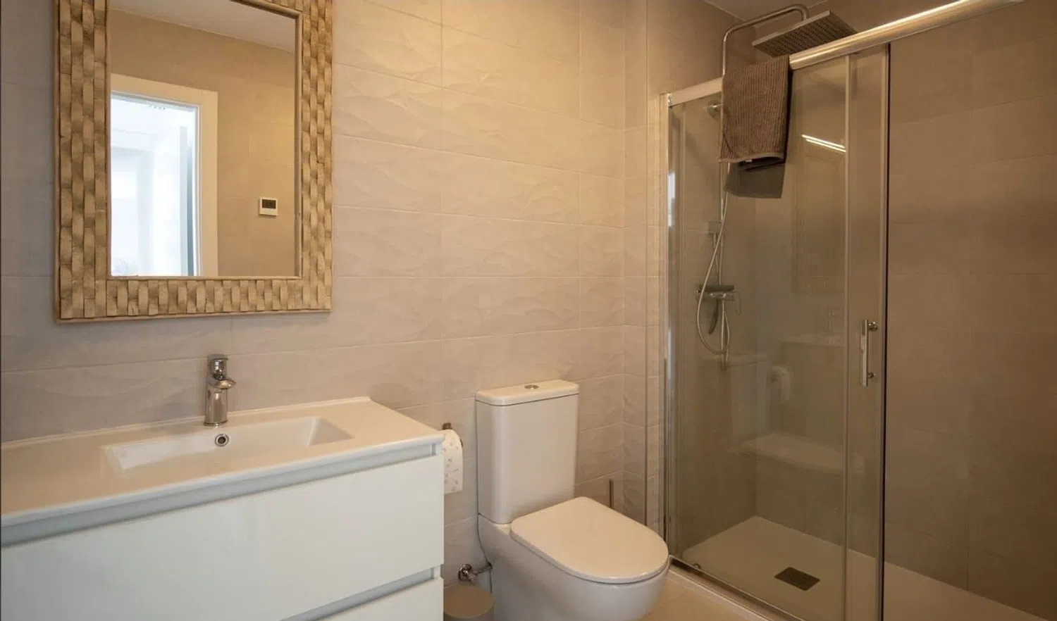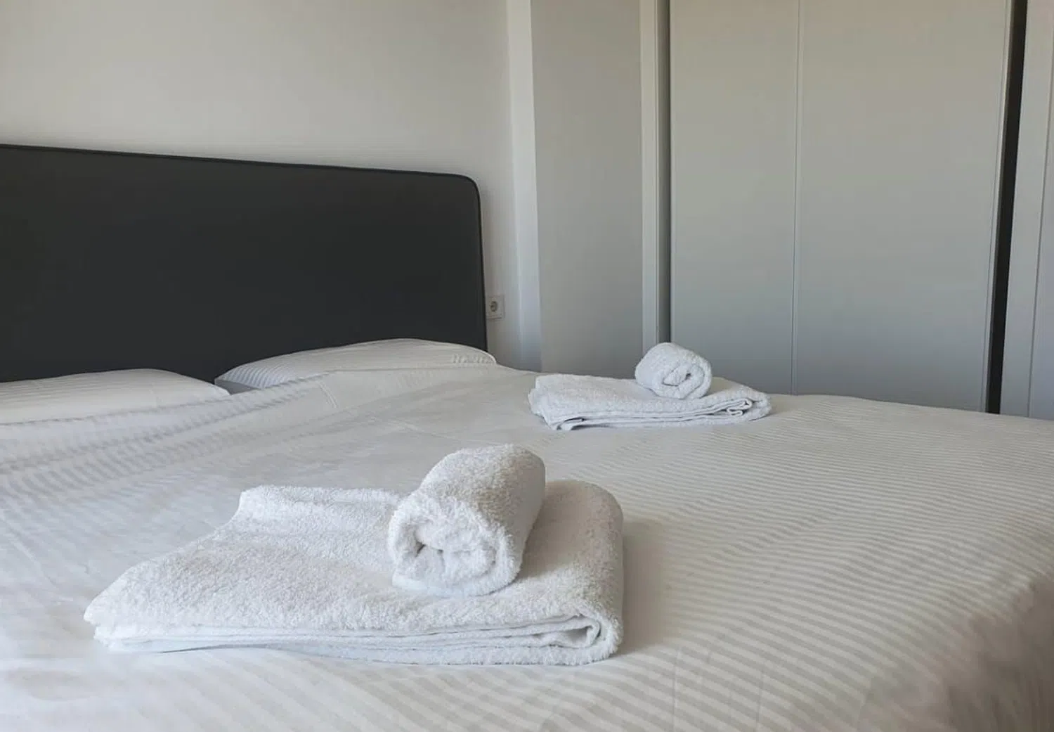 De twee slaapkamers zijn ruim en goed uitgerust: de hoofdslaapkamer beschikt over een tweepersoonsbed, terwijl de tweede slaapkamer twee eenpersoonsbedden heeft die naar wens kunnen worden gecombineerd. Beide kamers hebben inbouwkasten en toegang tot en-suite badkamers, elk met een ruime inloopdouche en moderne badkameraccessoires.
