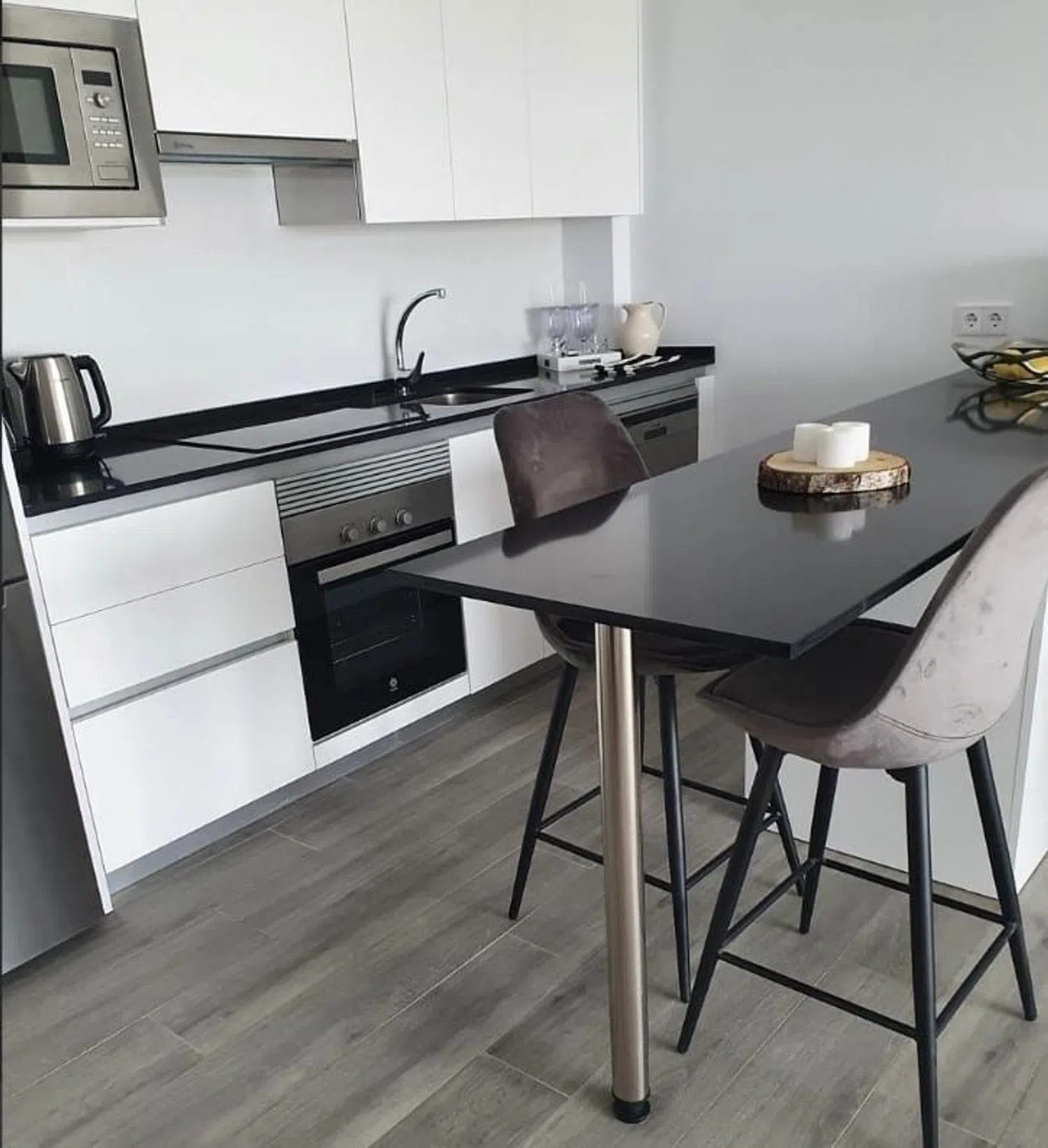 Het appartement beschikt over een luxe open keuken, inclusief een ontbijttafel en een grote koelkast met aparte vriezer. Ook is de keuken voorzien van een inductiekookplaat, vaatwasser, wasmachine, oven, magnetron, koffiezetapparaat, blender en broodrooster. De elegante woonkamer heeft een ronde eettafel met vier stoelen, een comfortabele sofa met ottomaan en twee ronde salontafels, allemaal in een warme sfeer met een rustieke houten tv-meubel.