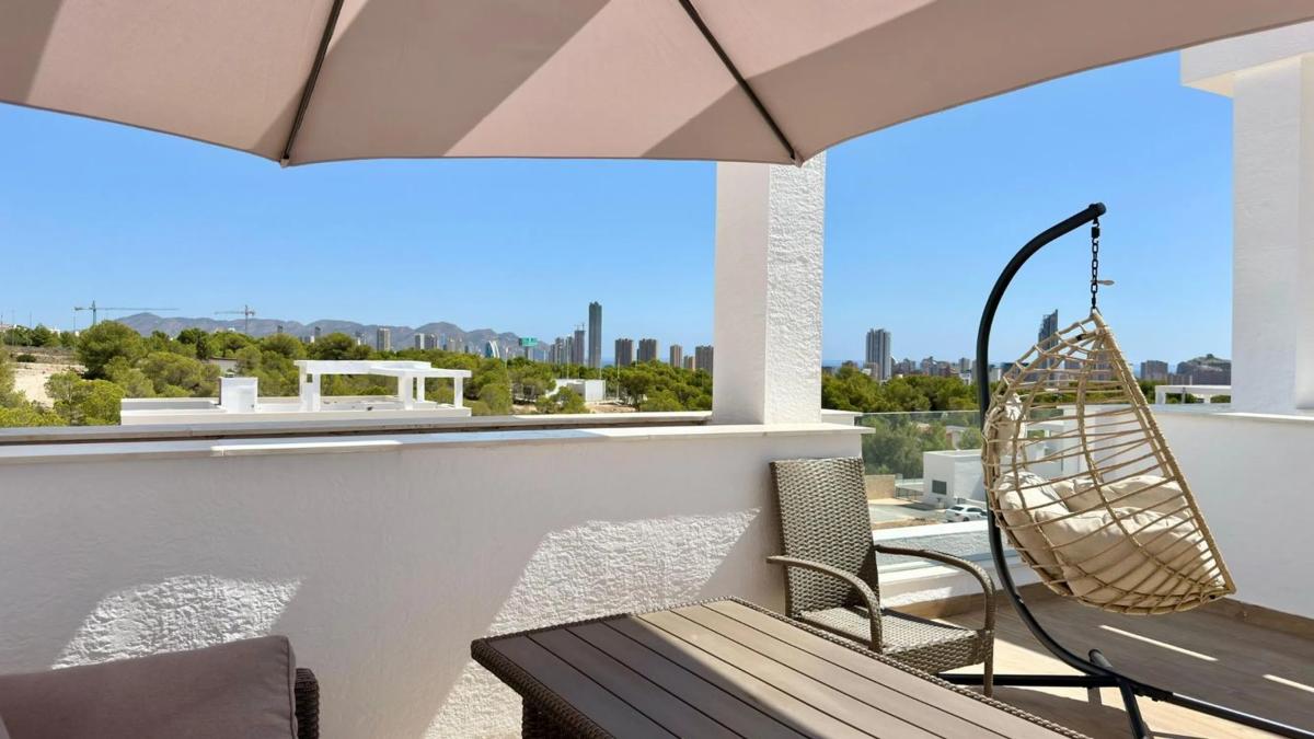 Se vende un moderno dúplex en la prestigiosa urbanización Mirador Hills en Finestrat. Complejo residencial nuevo con zona cerrada y vigilada, gran piscina y áreas verdes bien cuidadas. El dúplex cuenta con dos amplios dormitorios y dos baños, salón luminoso con cocina abierta totalmente equipada con electrodomésticos, varias terrazas y una gran solárium en la azotea con vistas panorámicas abiertas a Benidorm y a las montañas cercanas. La vivienda se vende amueblada y con todos los electrodomésticos, lista para entrar a vivir. El precio incluye una plaza de aparcamiento privada. La urbanización se encuentra en una de las mejores zonas de la Costa Blanca, a pocos minutos en coche de las playas de Benidorm y de Villajoyosa, cerca de centros comerciales como La Marina, supermercados, restaurantes, colegios, instalaciones deportivas y campos de golf. Gracias a su ubicación, diseño moderno y total preparación para vivir, este dúplex es ideal tanto para residencia permanente como para inversión con alto potencial de alquiler.