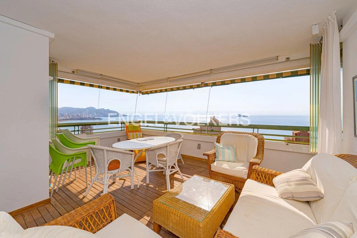 Ático de 4 dormitorios y maravillosas vistas en la playa de Poniente Espectacular ático de 146 metros cuadrados ubicado en la planta 18 del residencial Coblanca 30, en la Cala de Benidorm, a escasos minutos andando de la playa y rodeado de todo tipo de servicios. La propiedad se distribuye en 4 dormitorios, 3 cuartos de baño, 2 amplias terrazas, salón y cocina independiente. Cabe destacar sus inmejorables vistas al mar y a las montañas desde las principales estancias de la casa. La vivienda se encuentra en óptimo estado y lista para entrar a vivir, dispone además de aire acondicionado por splits. Cuenta con plaza de garaje cabinada que por sus dimensiones puede ser usada también como trastero. Destacar su amplia y completa urbanización, dotada de pistas de tenis, squash, zonas ajardinadas y piscina en dos niveles con cascada. Una ocasión excelente de adquirir una propiedad ideal para vivienda habitual o como segunda residencia vacacional. Benidorm es la capital por excelencia de la Costa Blanca, foco turístico principal de todo el litoral levantino, donde encontramos también importantes localidades como Alicante, Torrevieja, Elche, Villajoyosa, Altea, o Calpe. Benidorm es un lugar enigmático y único, conocido desde el punto de vista urbanístico como el Manhattan español. Ciudad atractiva sobre todo por su microclima gracias a su orientación sur y a la protección que ejercen las montañas que la rodean y que ofrece a sus habitantes inviernos templados y veranos agradables. Su situación privilegiada frente a una bellísima bahía de dos playas de arena dorada con aguas cristalinas y cálidas, y la gran oferta de servicios, ocio, campos de golf cercanos, clubes náuticos, restauración, etc… la convierten en una ciudad paraíso para vivir con comodidad, tranquilidad y diversión. Este Apartamento está a escasos metros de playa Poniente, la mejor playa de Benidorm. El centro cuidad está a menos de cinco minutos con coche y presume de rápida comunicación con carretera nacional N-322 y salida a la Autovía del Mediterráneo. El Aeropuerto internacional de Alicante está a 40 km de distancia y Valencia, Ciudad de las Artes a 150 km. ¡Una fantástica oportunidad de adquirir una propiedad de vacaciones o para todo el año en esta ubicación exclusiva!