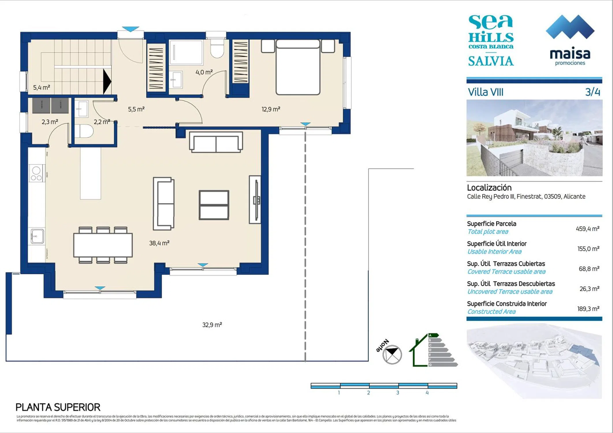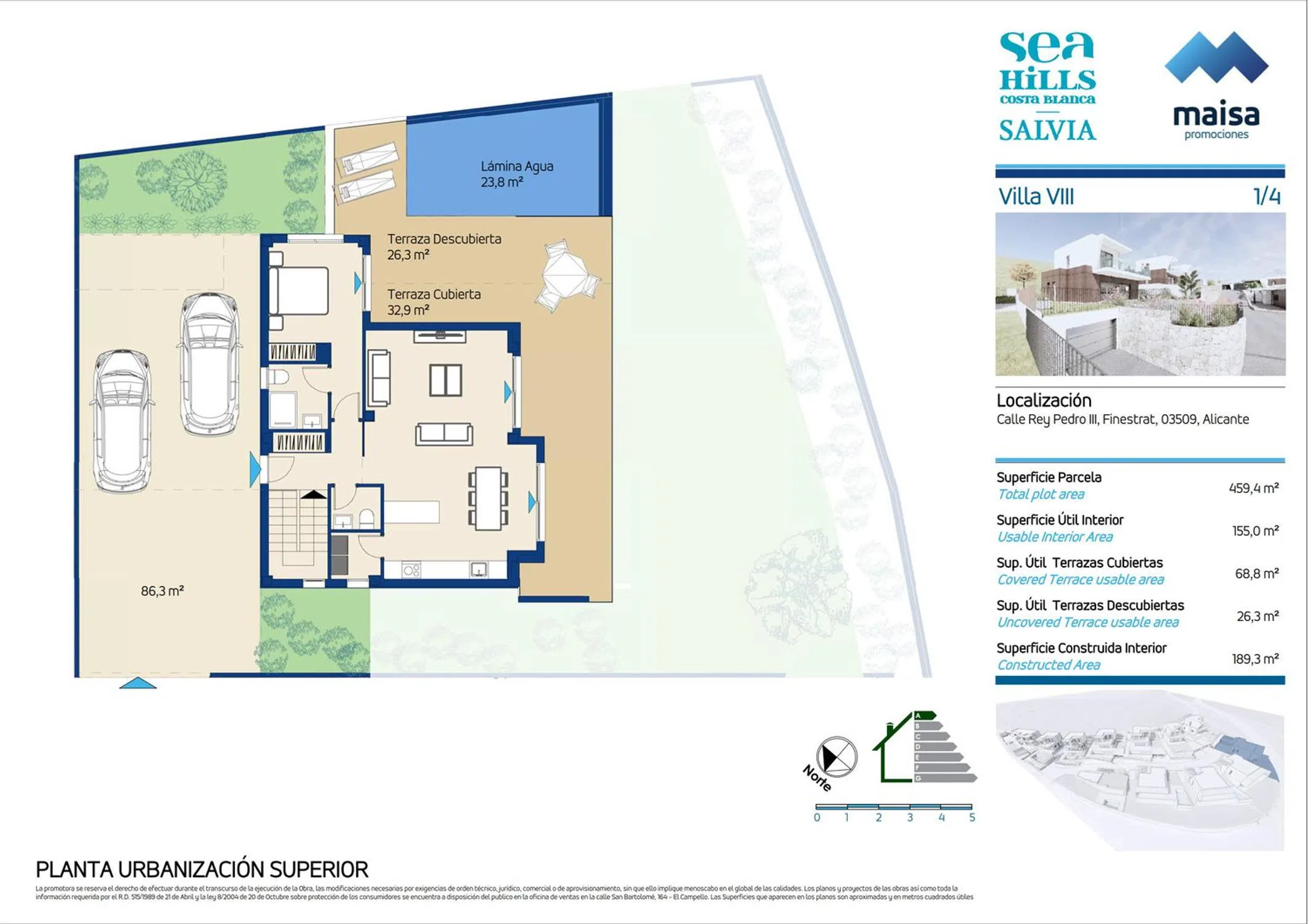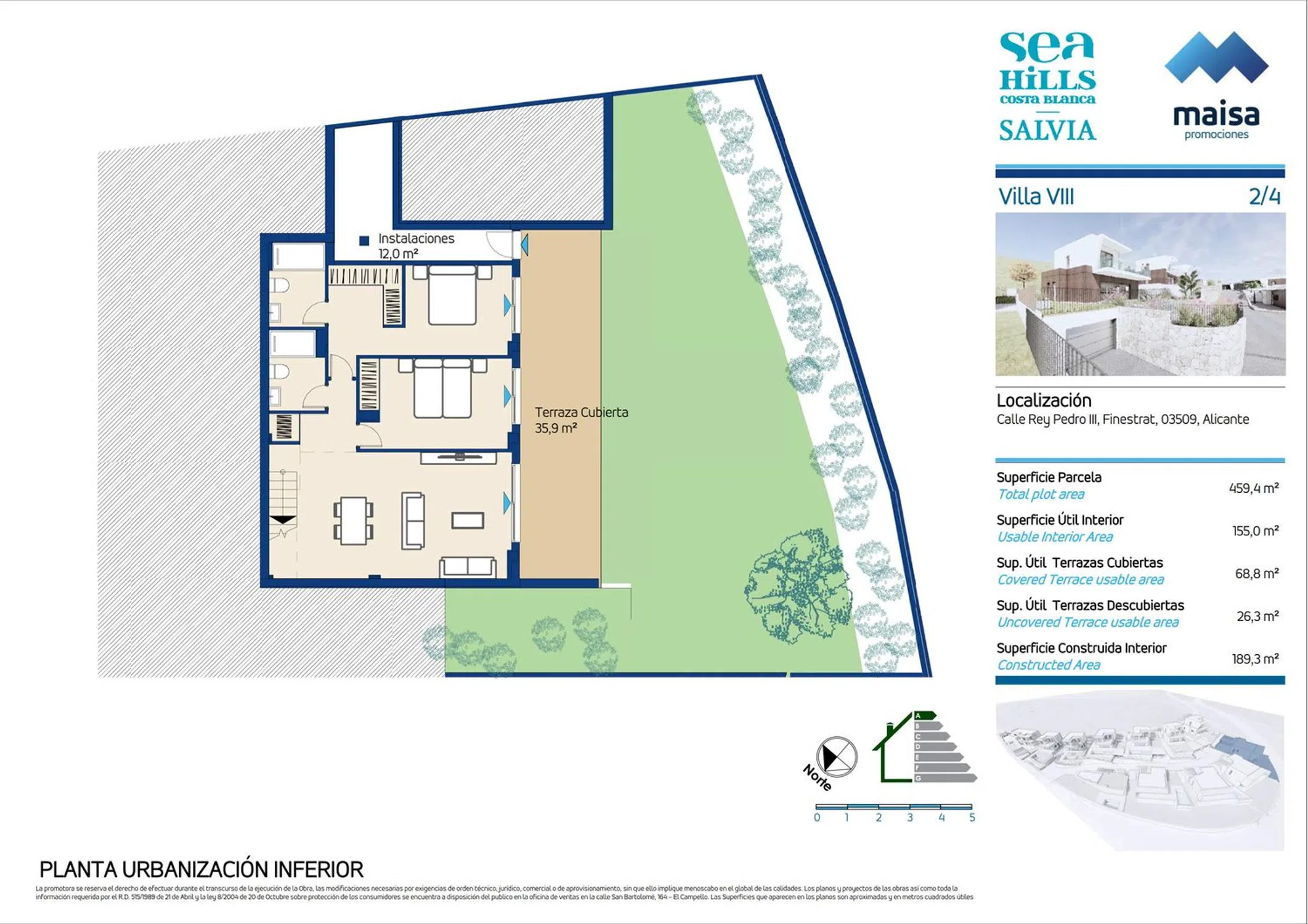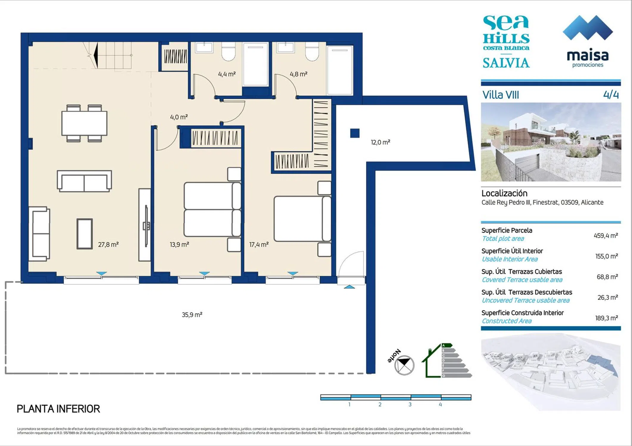 Maisa Promociones, con más de 60 años de experiencia en el sector, presenta esta nueva promoción de 12 viviendas únicas con licencia de obras obtenida en Finestrat, un enclave que combina la esencia mediterránea con la comodidad de contar con todos los servicios cerca. Las villas destacan por su diseño moderno y funcional, con espacios luminosos y acabados de alta calidad: suelos porcelánicos, carpintería lacada en blanco, amplios armarios y cocinas totalmente equipadas con electrodomésticos Siemens. Los baños incluyen muebles de diseño, espejos retroiluminados y griferías con sistema de ahorro de agua. Cada vivienda dispone de jardín privado con piscina, terraza y zona de aparcamiento. Además, cuentan con climatización por conductos, aerotermos de alta eficiencia y videoportero con control por app. Una ubicación estratégica que ofrece tranquilidad, naturaleza y conexión con todo: a 5 minutos de Benidorm, 40 minutos del Aeropuerto de Alicante y muy próximo a campos de golf, colegios internacionales y centros comerciales. Un hogar mediterráneo pensado para disfrutar de cada día.