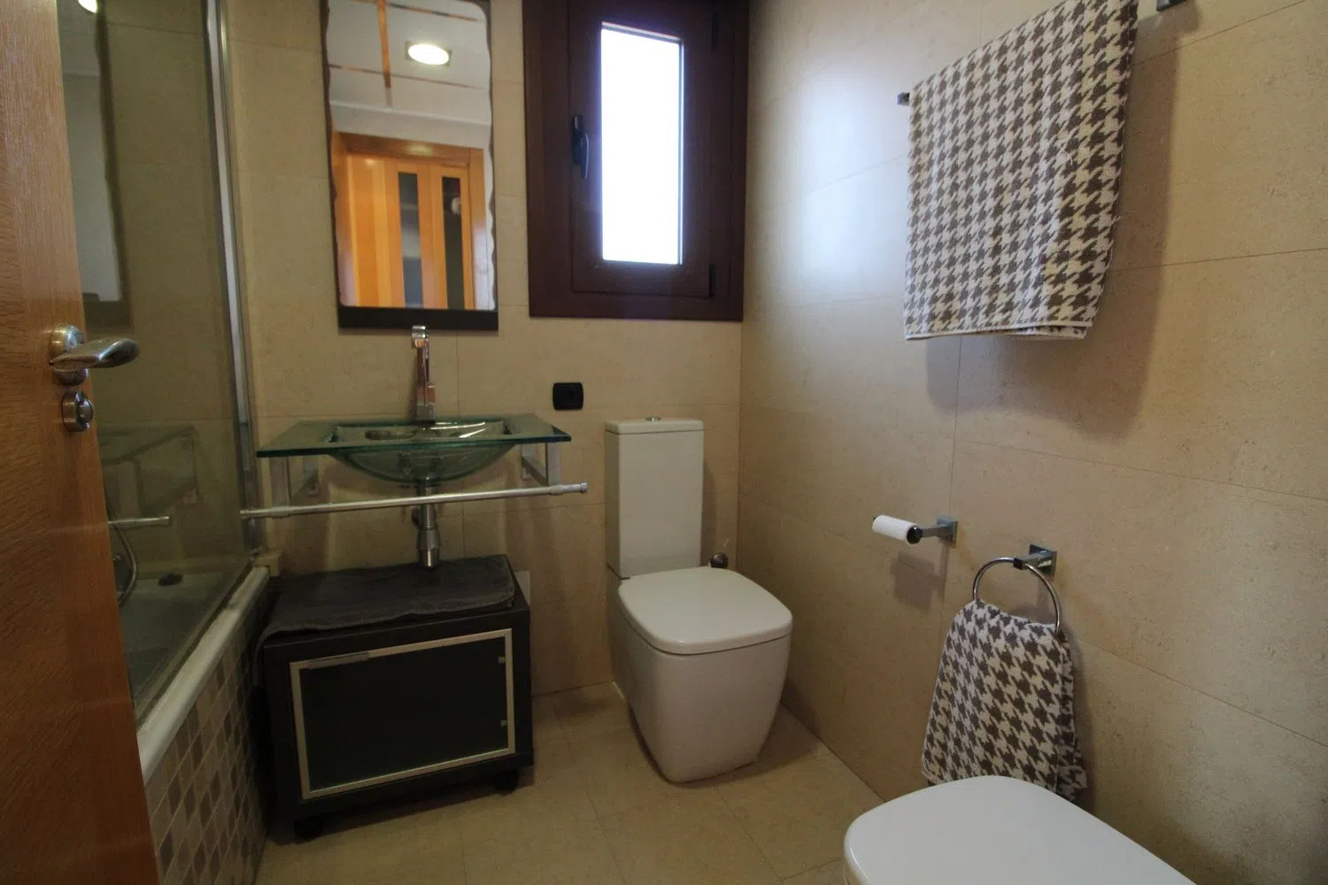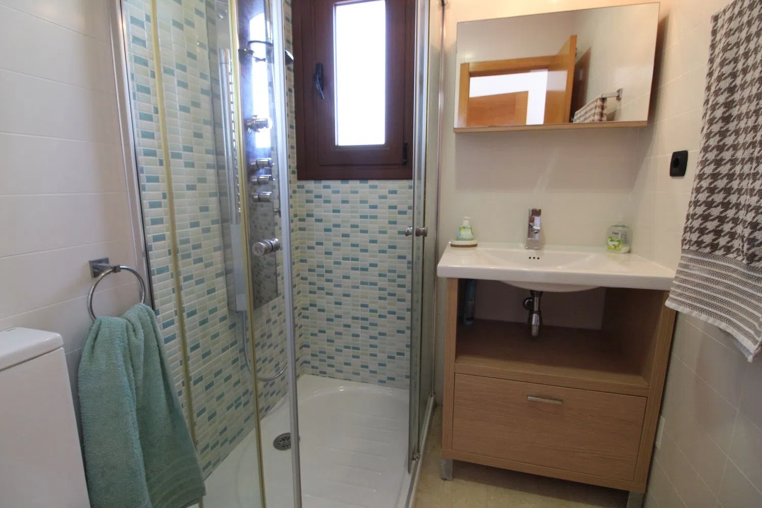 Op de eerste verdieping bevindt zich een moderne en volledig uitgeruste keuken met state-of-the-art apparatuur, waaronder een vaatwasser, oven, keramische kookplaat, koelkast-vriezer en magnetron. Er is ook een badkamer met douche en een gezellige woon-eetkamer die zich naar een balkon met zeezicht opent, wat de perfecte sfeer creëert om te ontspannen. Op de tweede verdieping zijn er drie slaapkamers en twee badkamers, waarbij de hoofdslaapkamer een echt toevluchtsoord is met een ensuite badkamer. Twee van de slaapkamers zijn ingericht met tweepersoonsbedden en hebben inbouwkasten, terwijl de derde twee eenpersoonsbedden heeft, ook met een inbouwkast.