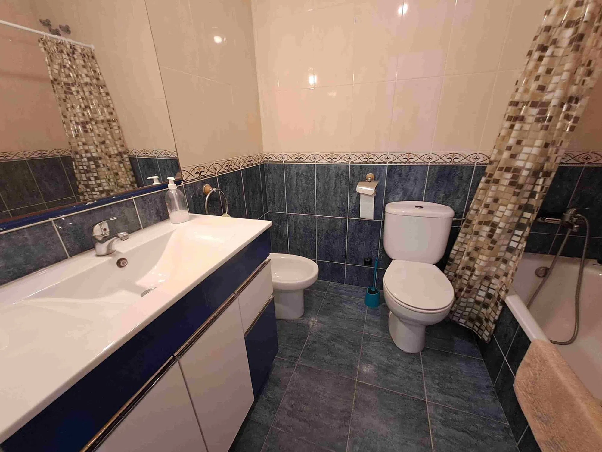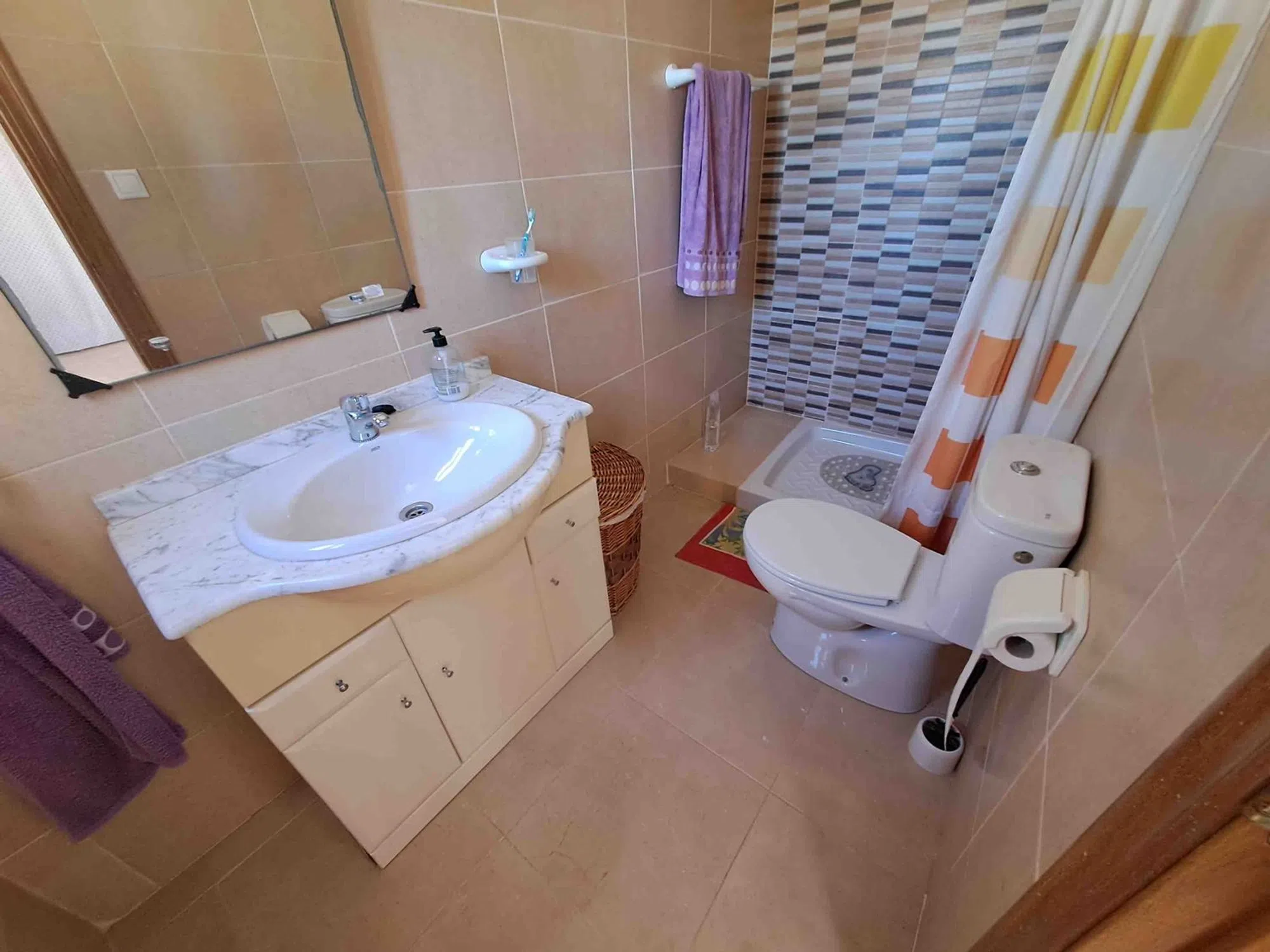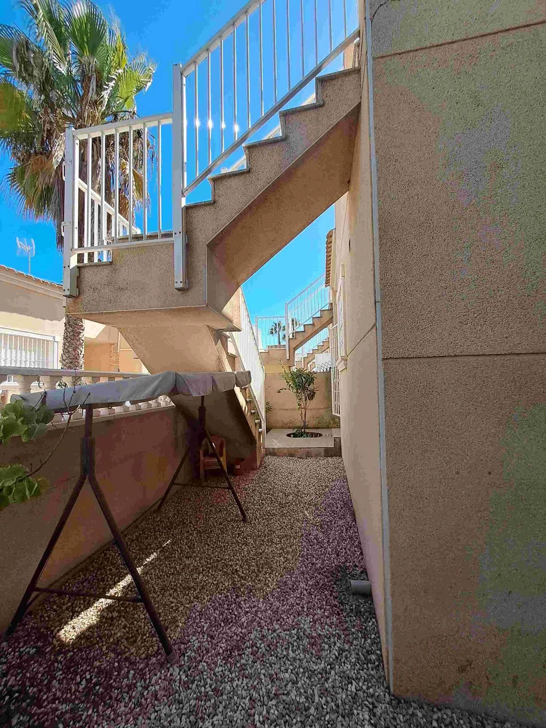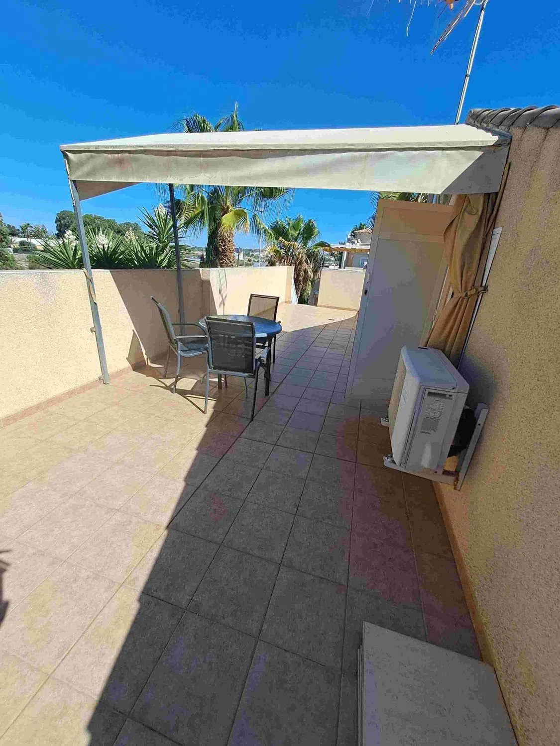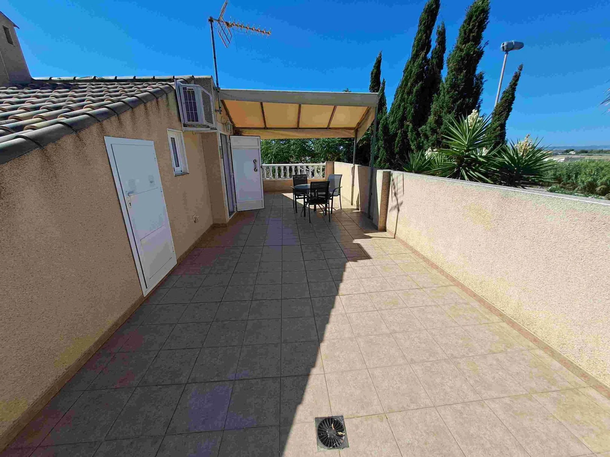 Casa adosada esquinera de dos plantas en la urbanización Balcón al Mar II, en el distrito de Pinomar de Guardamar del Segura. A tan solo 600 metros de la Playa del Campo y a menos de 5 minutos en coche del centro de Guardamar. La casa cuenta con una parcela de 171 m². Ofrece aparcamiento privado cubierto con pérgola y una terraza delantera con acceso a la vivienda. Desde la terraza trasera se accede a la planta superior y a una salida independiente a la piscina comunitaria. La planta baja consta de: – Salón-comedor con aire acondicionado – Cocina integrada totalmente equipada con acceso a un lavadero con lavadora y lavavajillas, así como a la terraza trasera – 2 dormitorios dobles con armarios empotrados y ventilador – 1 baño con bañera, lavabo, bidé e inodoro Una escalera exterior desde la terraza trasera conduce a la terraza solárium privada. Allí se ha integrado un tercer dormitorio con baño/ducha y un trastero con una pequeña cocina americana, ideal como zona de invitados. El complejo residencial cuenta con piscina comunitaria con ducha. Ubicación privilegiada con buena exposición (sur, norte y oeste). Guardamar del Segura se encuentra al sur de Alicante/Costa Blanca. La zona ofrece ocho amplias playas de arena, algunas de las cuales han sido galardonadas con la Bandera Azul por su alta calidad y servicio.