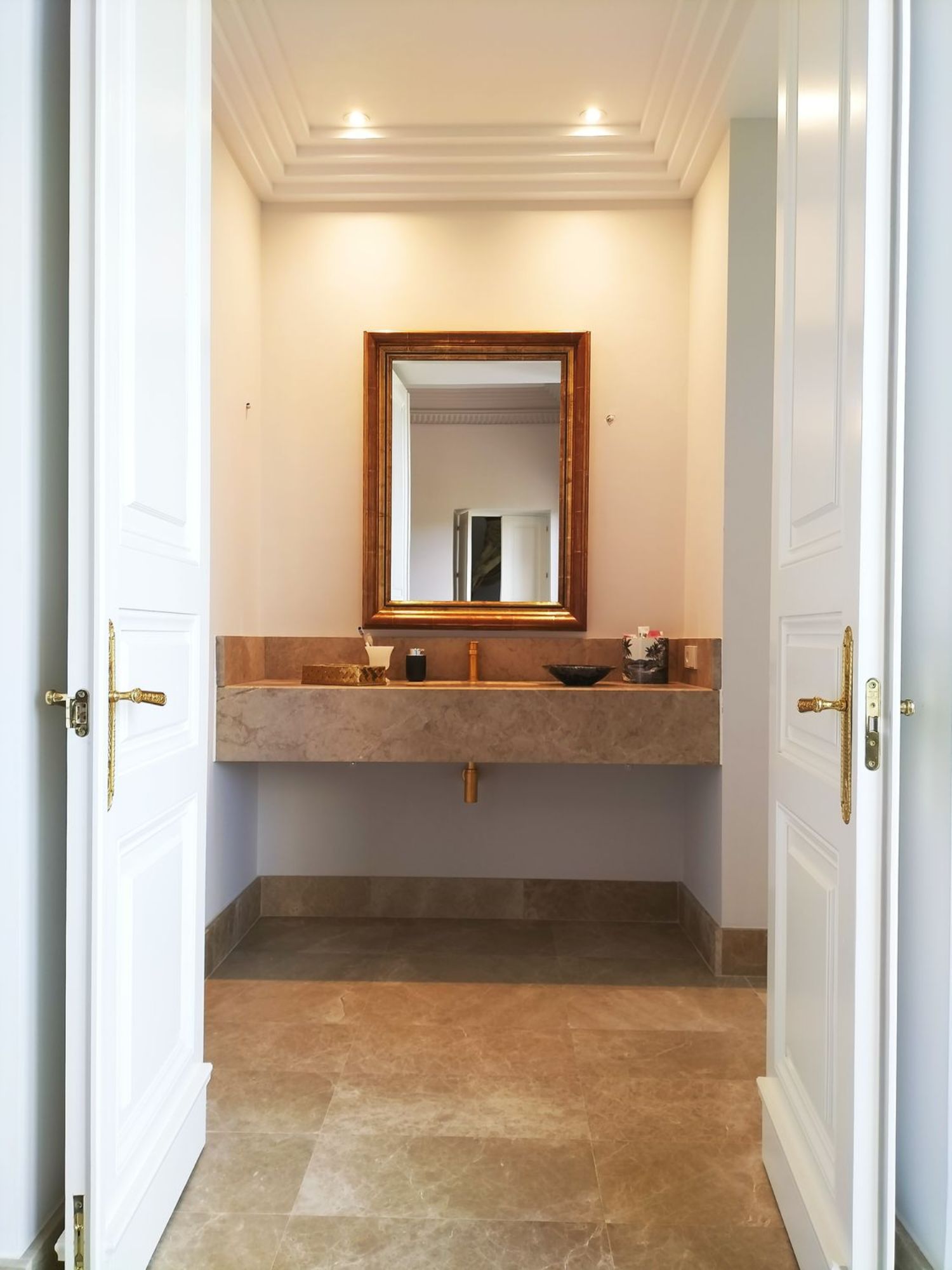 Bij binnenkomst worden we verwelkomd door een majestueuze dubbele deur die leidt naar een ruime woonkamer met plafonds hoger dan 4 meter. Het hele huis draait om deze centrale ruimte, geïnspireerd door Palladiaanse modellen, wat een ongeëvenaarde ruimtelijkheid biedt.