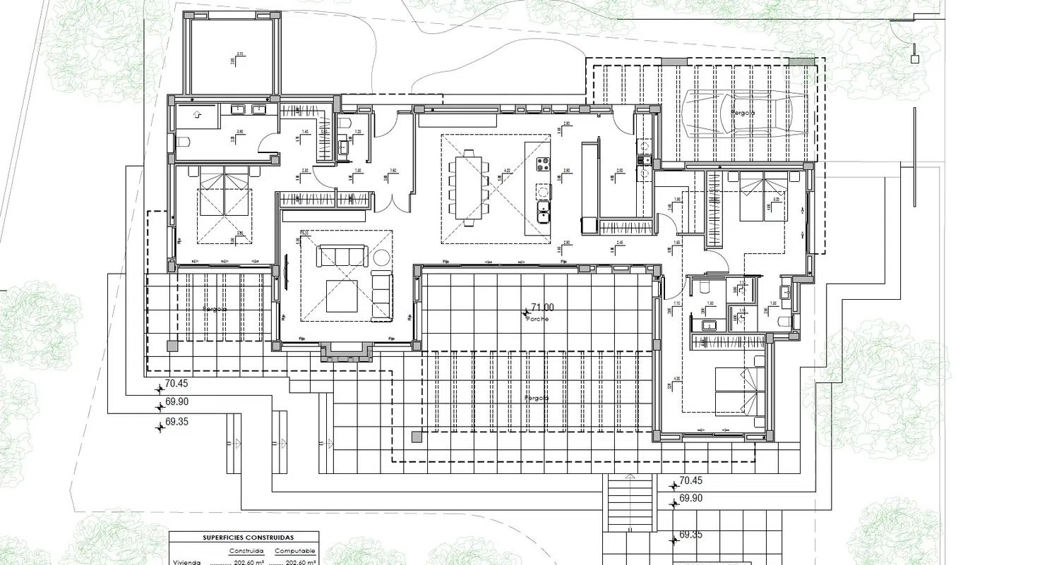 Vanuit de woning is een charmante tuin te bewonderen met een royale rechthoekige zwembad van 14x3 meter, ideaal om te zwemmen. Er is ook een extra studio die naar behoefte kan worden aangepast, zowel geschikt als gastenverblijf of als thuiswerkruimte. De woning biedt voldoende parkeergelegenheid voor meerdere voertuigen, en bezoekers kunnen gemakkelijk parkeren in de rustige doodlopende straat. Het project beschikt over de benodigde vergunningen en kan sleutelklaar worden opgeleverd binnen 14 maanden na ondertekening van het bouwcontract. Meer informatie is op aanvraag beschikbaar.