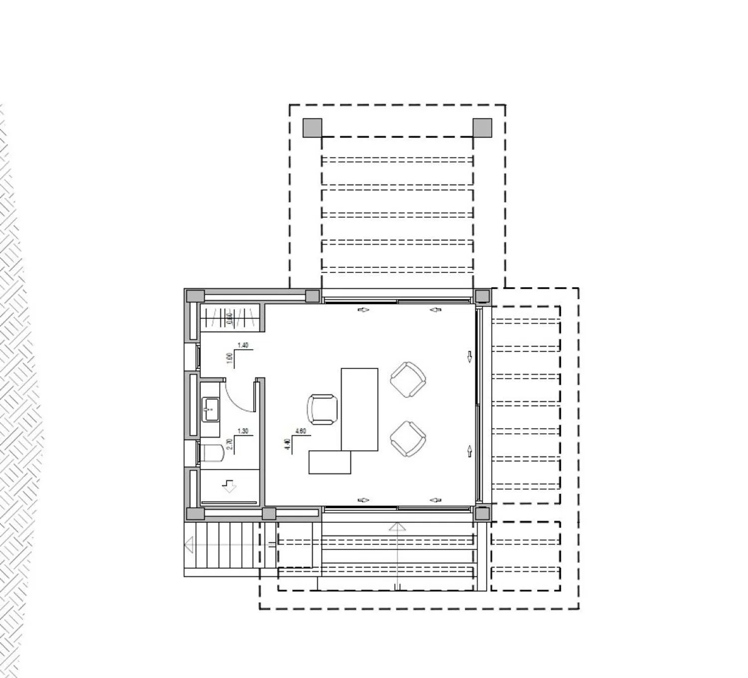In hetzelfde deel van de woning bevindt zich de hoofdslaapkamer met een privéterras, een ruime badkamer en een kleedkamer. Aan de oostkant zijn twee extra slaapkamers gesitueerd, elk met eigen badkamer en terras, waardoor ze ideaal zijn voor gasten of opgroeiende kinderen. Dit gedeelte heeft een eigen ingang, wat voor extra privacy zorgt doordat het is afgescheiden van het hoofdgebouw.